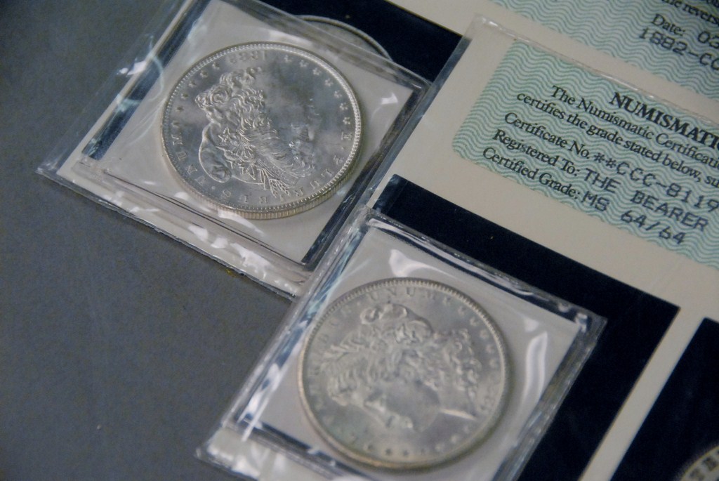 Two silver dollars 1880-CC NCI 64/64 and 1882-CC NCI 64/64.