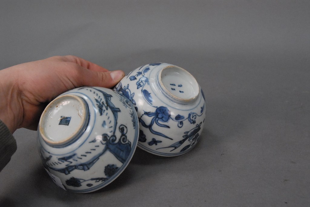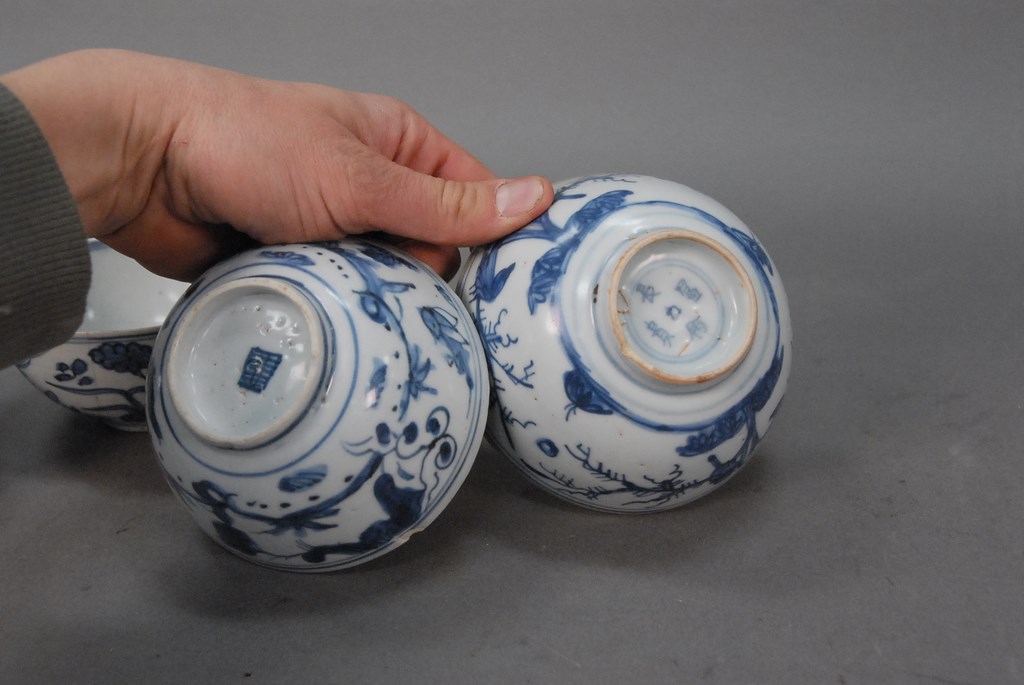 Four blue and white Ming bowls with painted birds and fish as is. dia. 4 1/2in.
