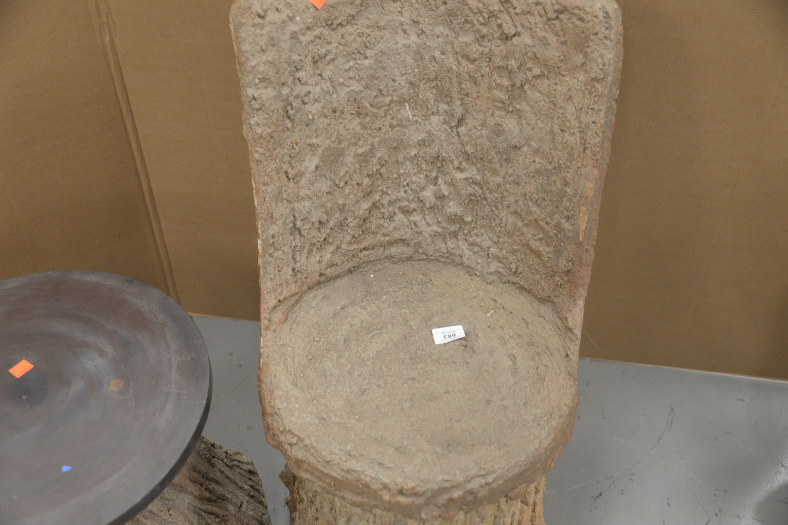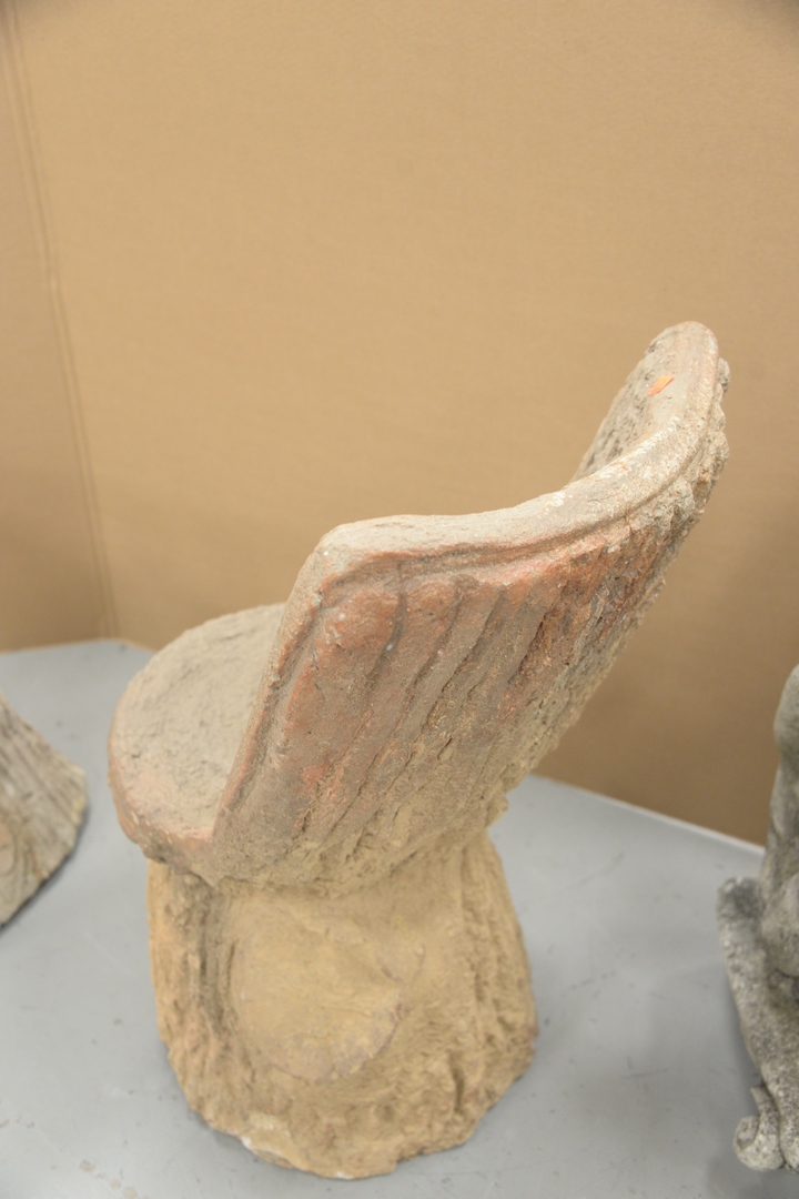 Faux Bois Stone Chair and Table, chair height 29 1/2 inches, table height 17 1/2 inches.