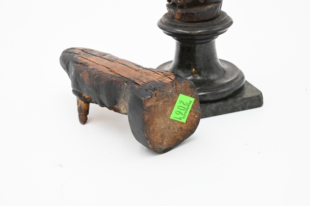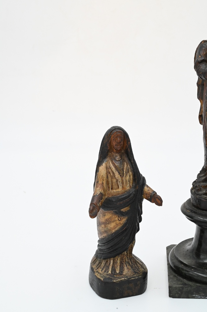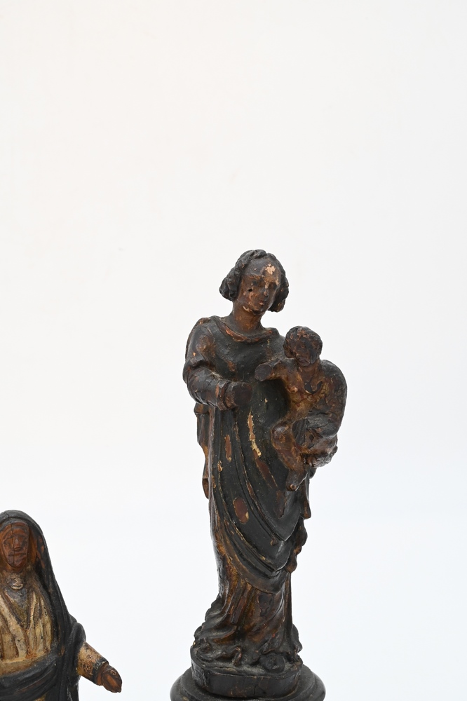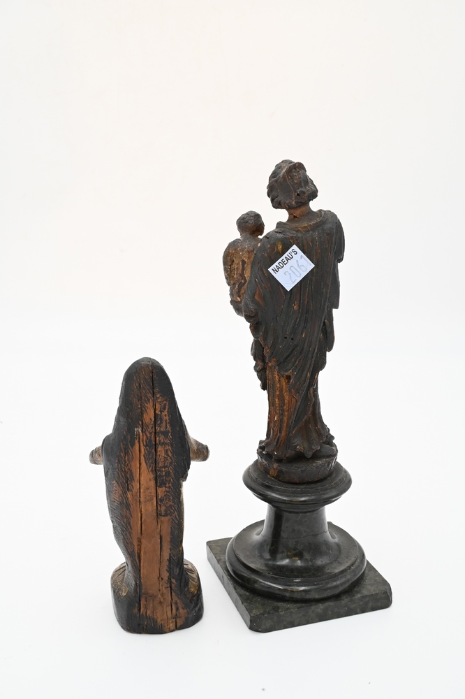 Lot 683: Two Carved and Polychrome Figures, to include carved Madonna and child figure, figure height 7 inches, Madonna standing in a robe pa…