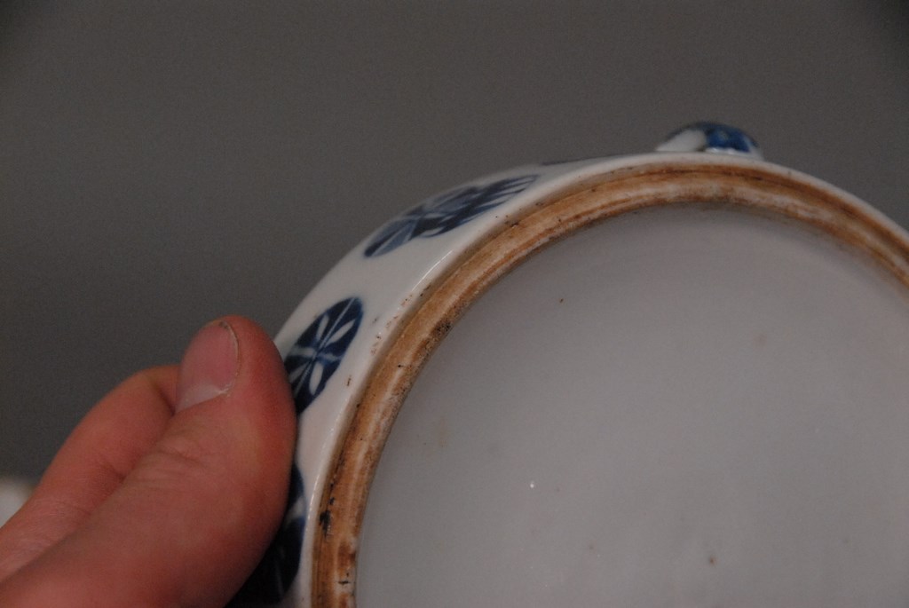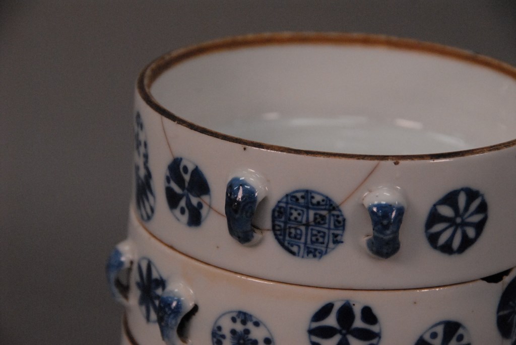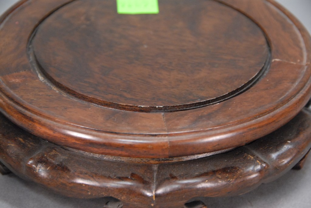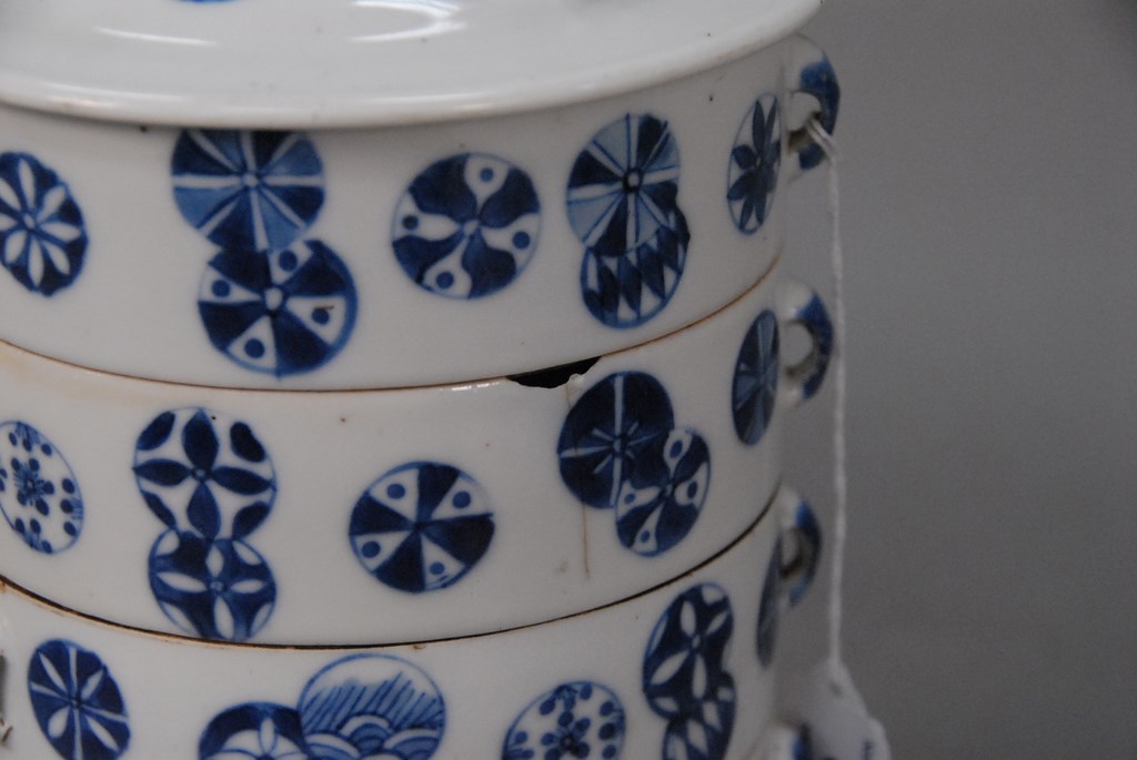 Lot 684: Jiaqing porcelain blue and white stacking circular box in four sections painted with ball design on Ming zitan stand as is. box ht…
