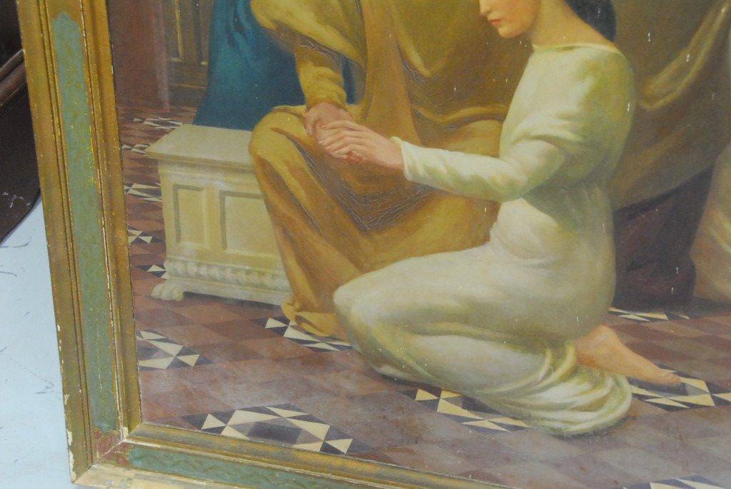 Lot 684: LARGE INTERIOR ARAB SCENE with figures appear to be in mourning oil on board unsigned – 45 x 35