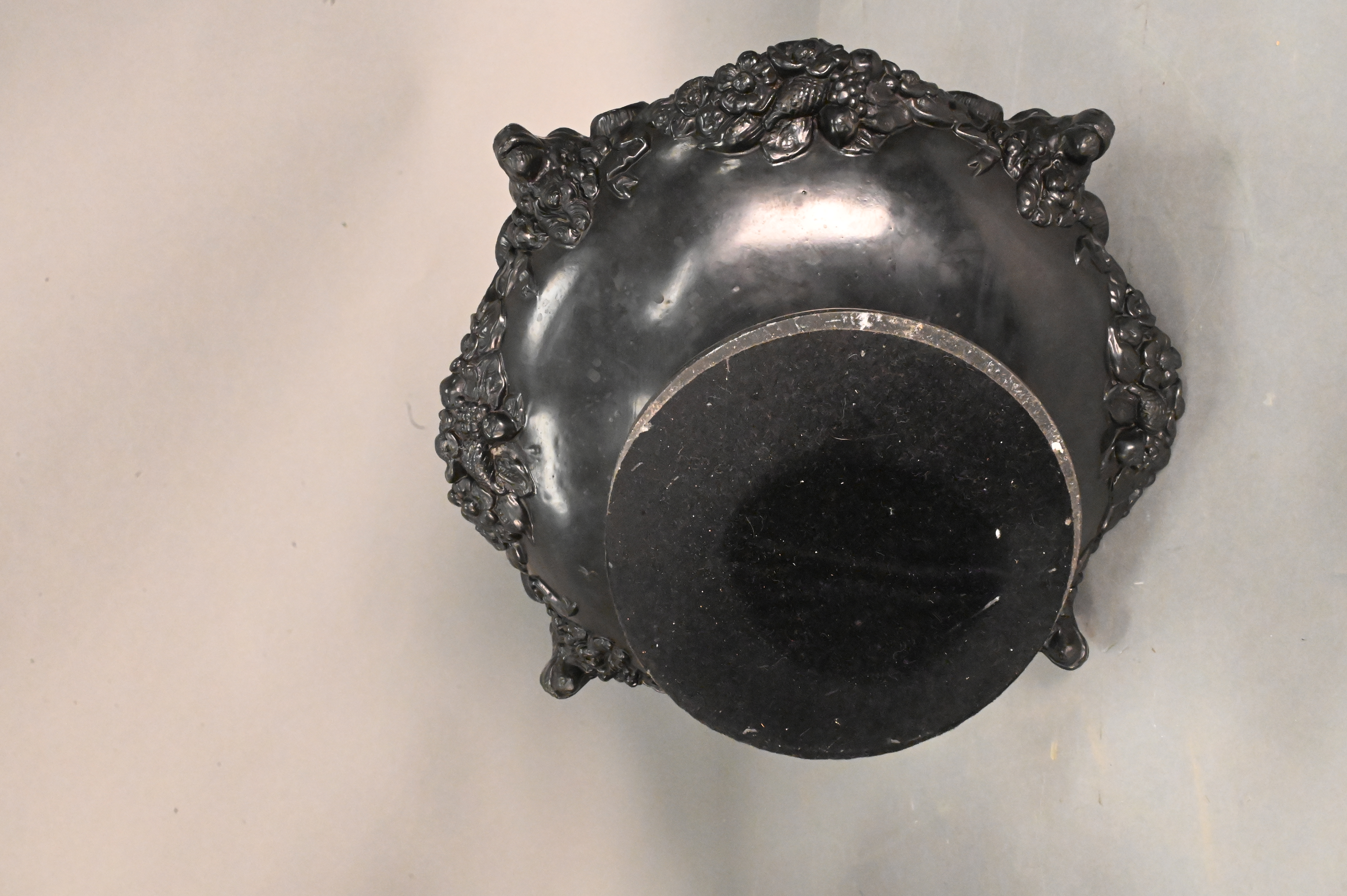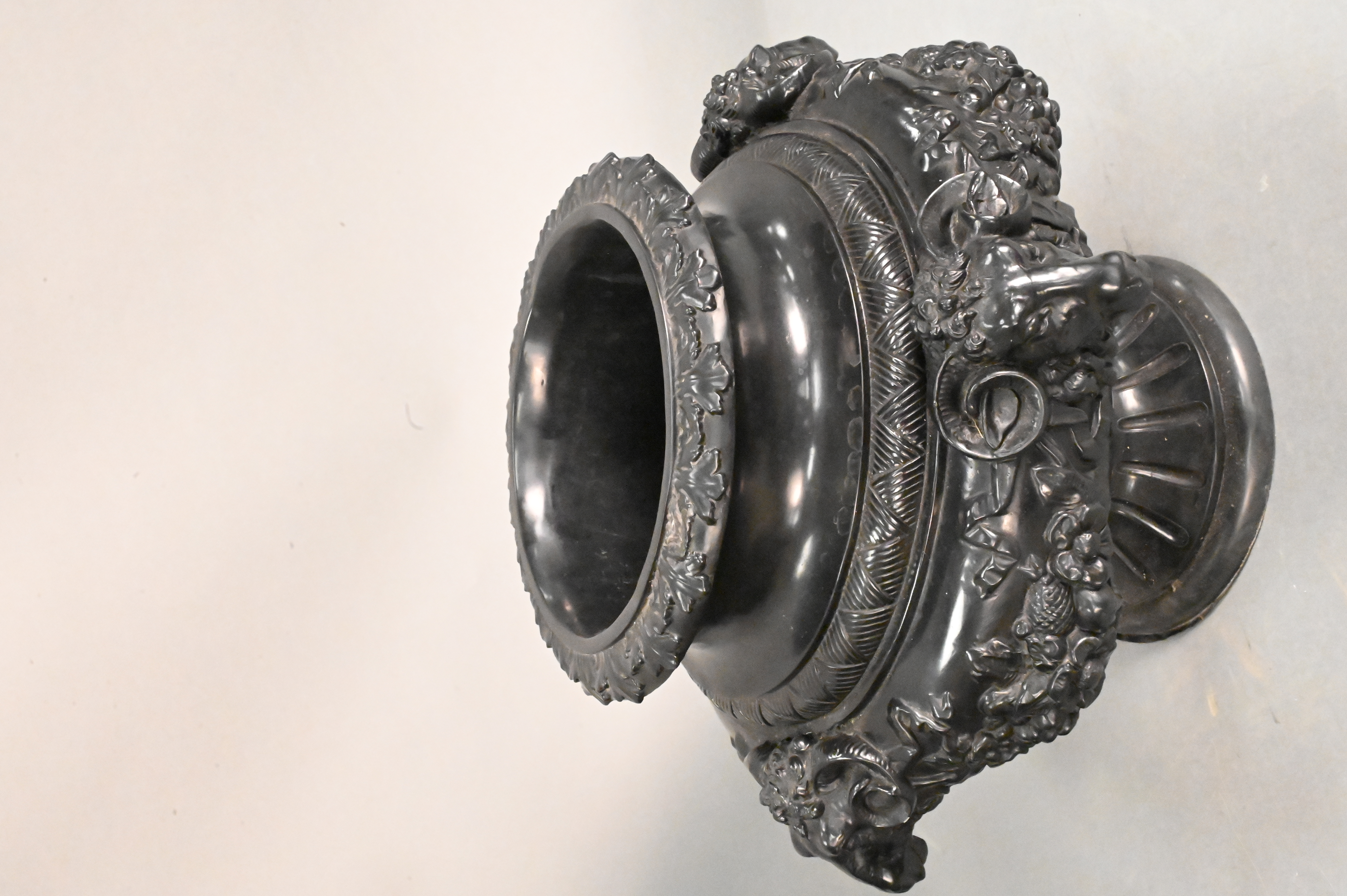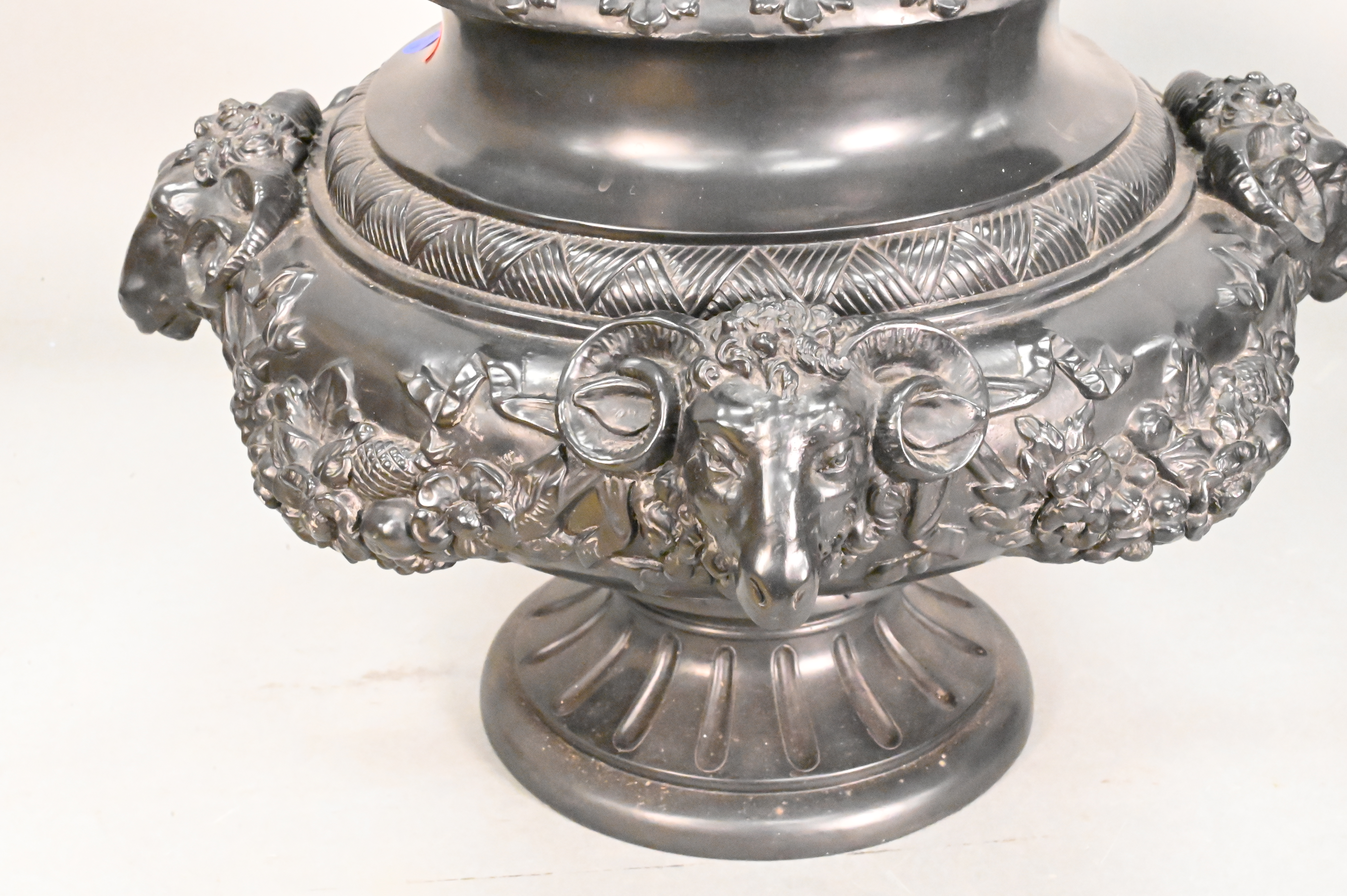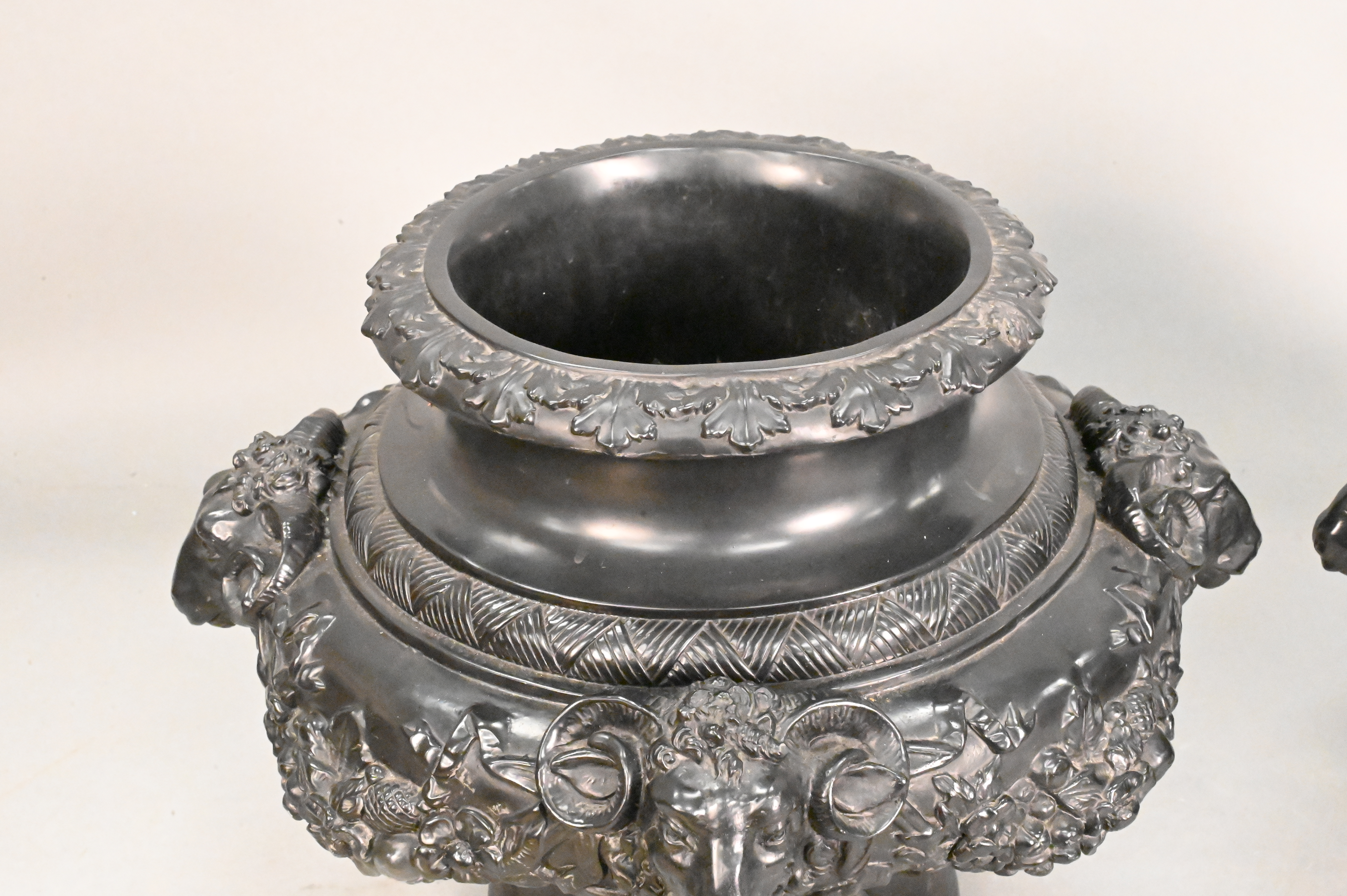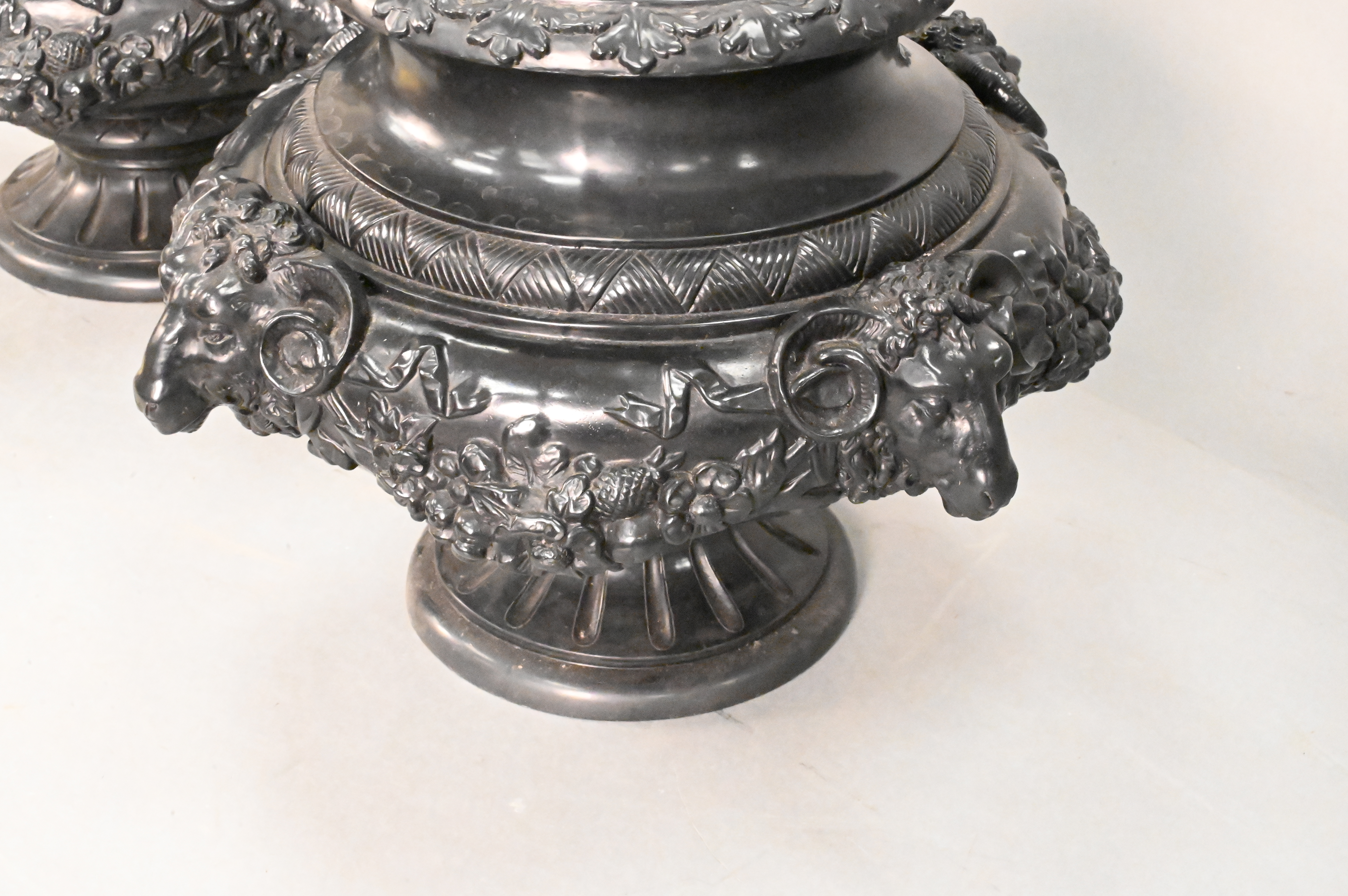 each of urn form, molded with ram’s head masks and ribbon, along with floral garlands beneath a chevron band