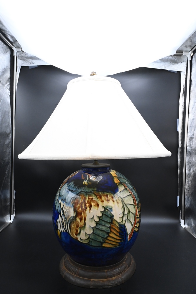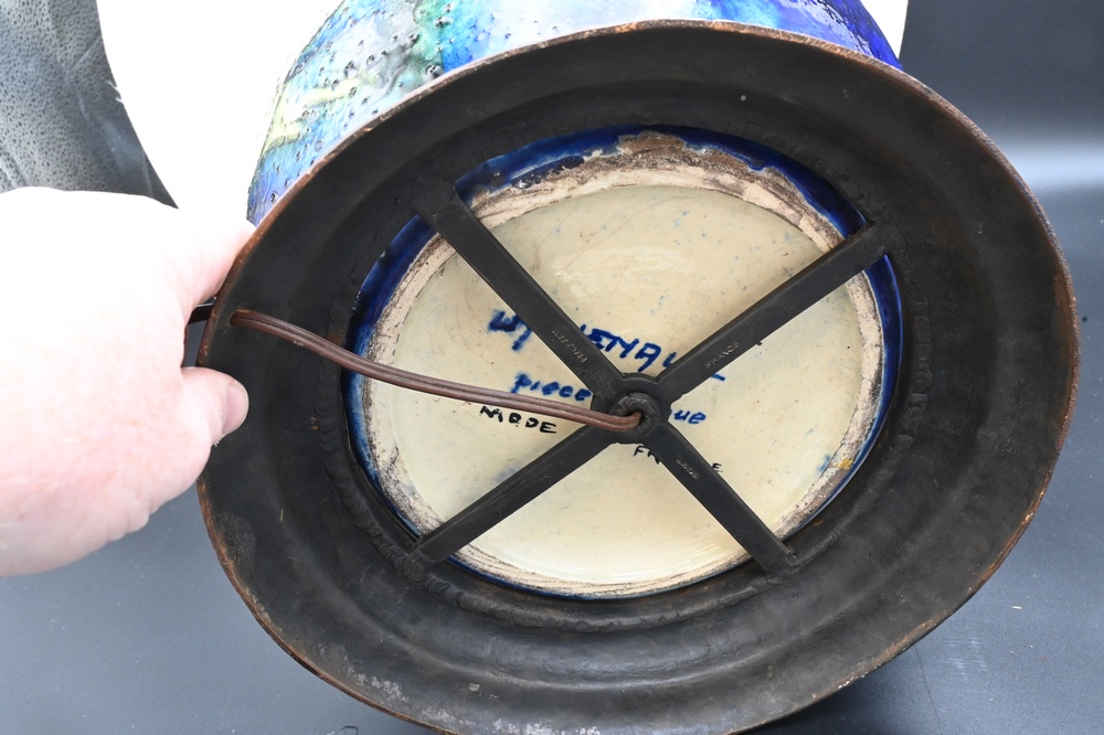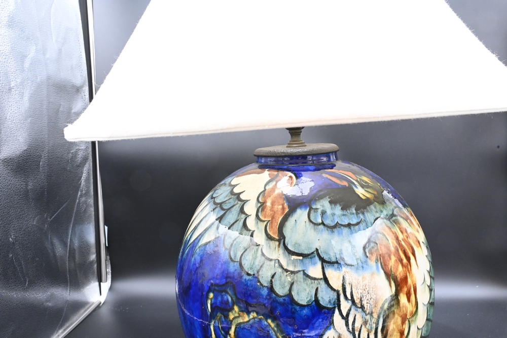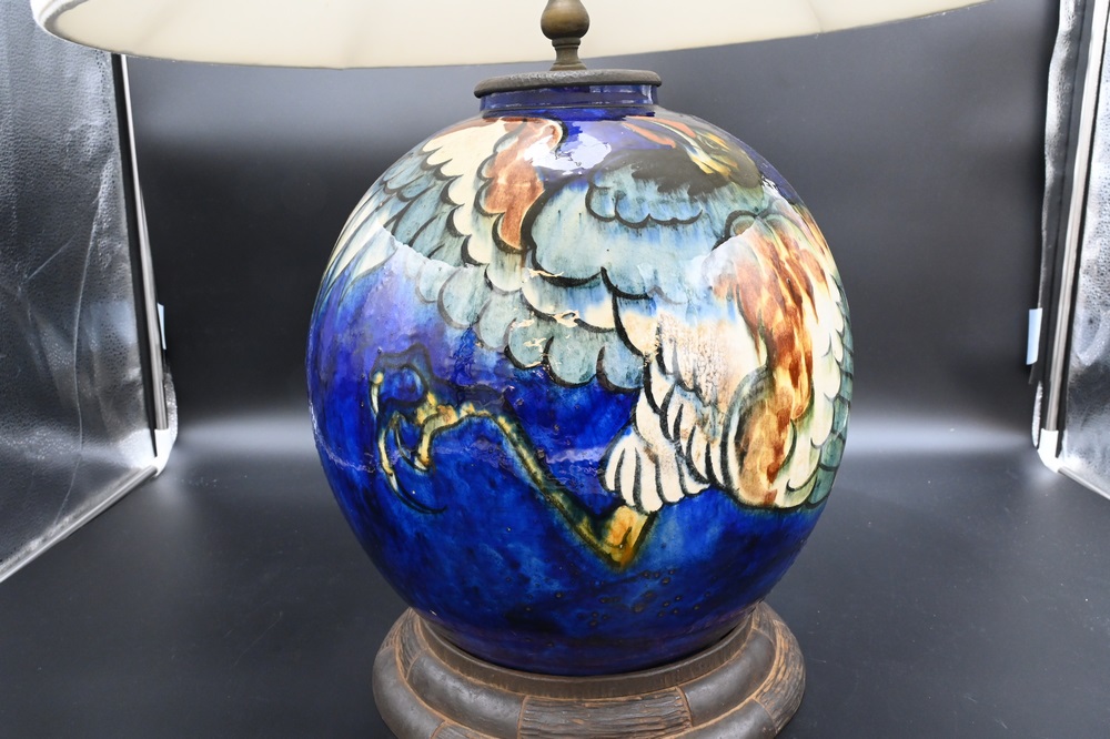 Edmond Lachenal Large Glazed Globular Vase, having painted bird with tallens design, signed Lachenal, piece Made in France on bronze base, marked “L. Katona, Beaux Arts, France”, vase height 12 inches, total height 27 inches.