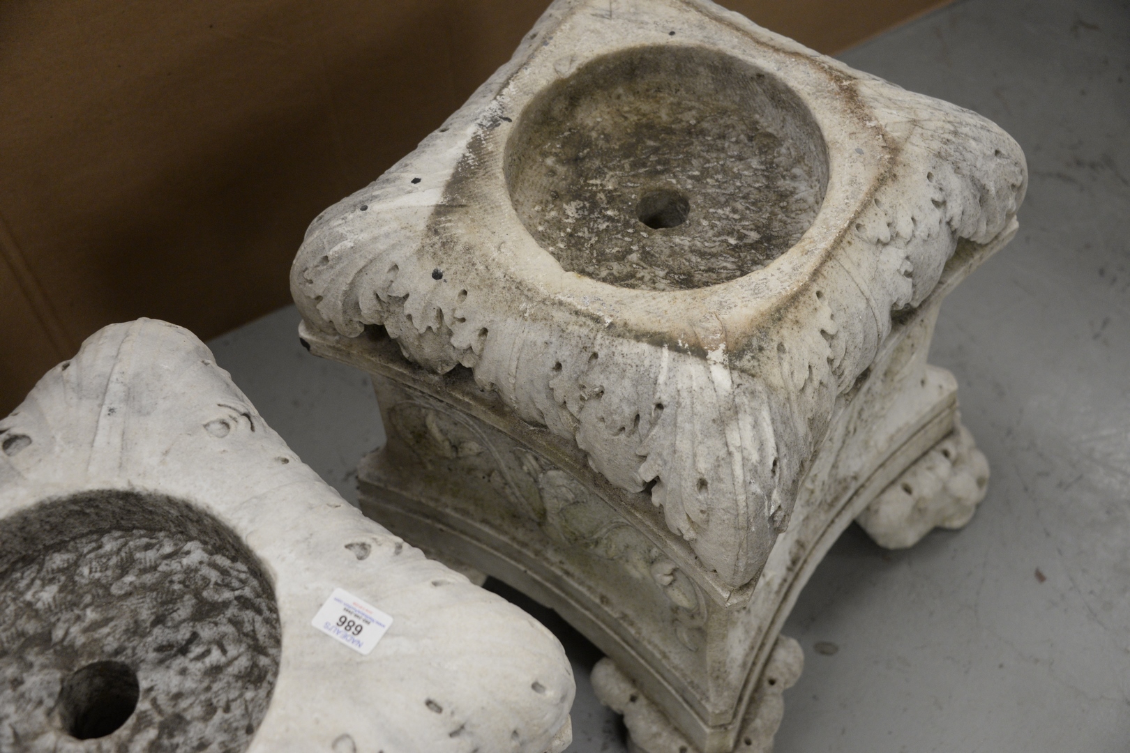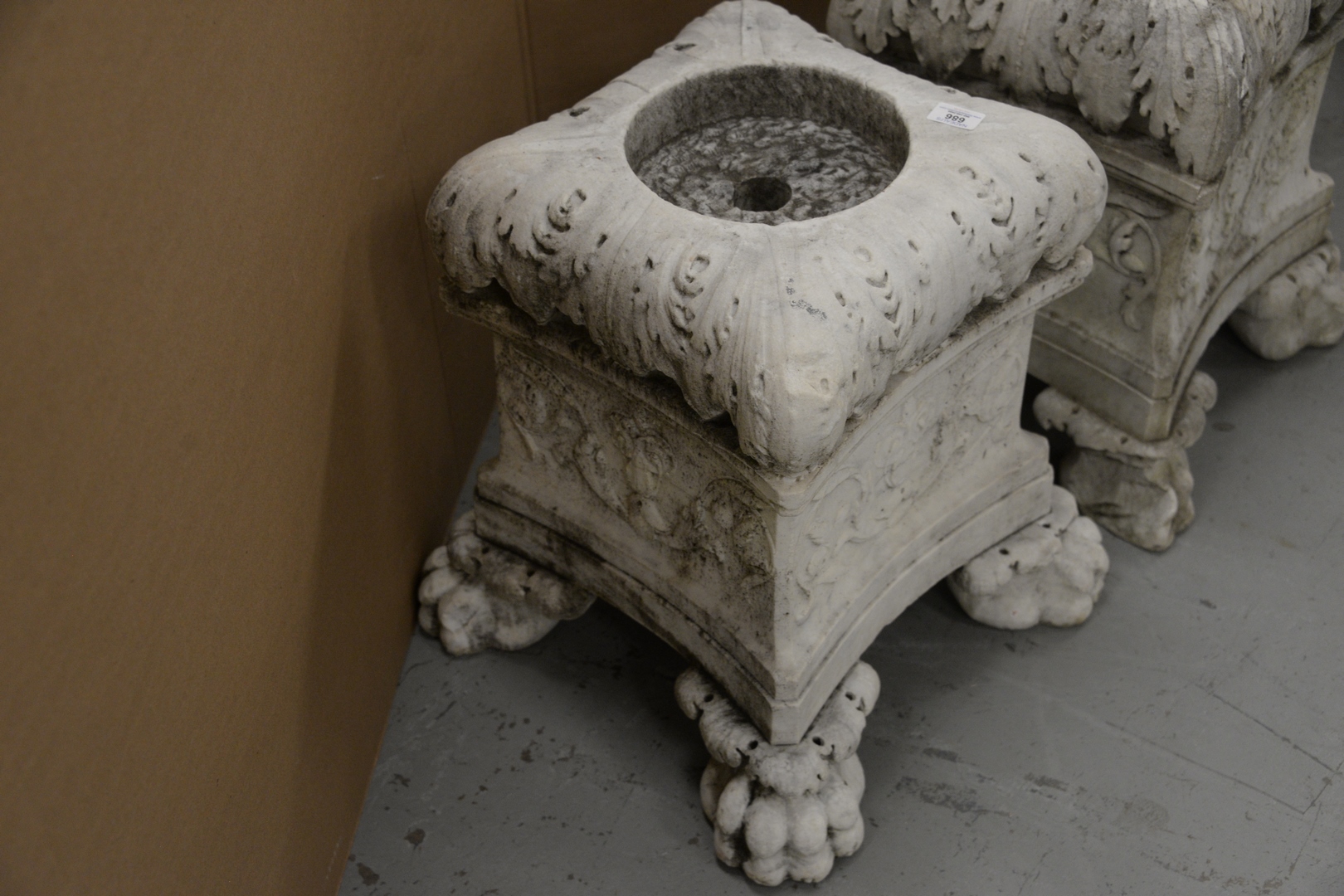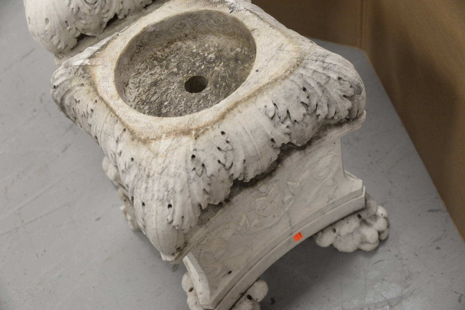 Lot 686: Pair of Marble Planters, having claw feet, height 19 inches, top 15 x 15, one foot missing.