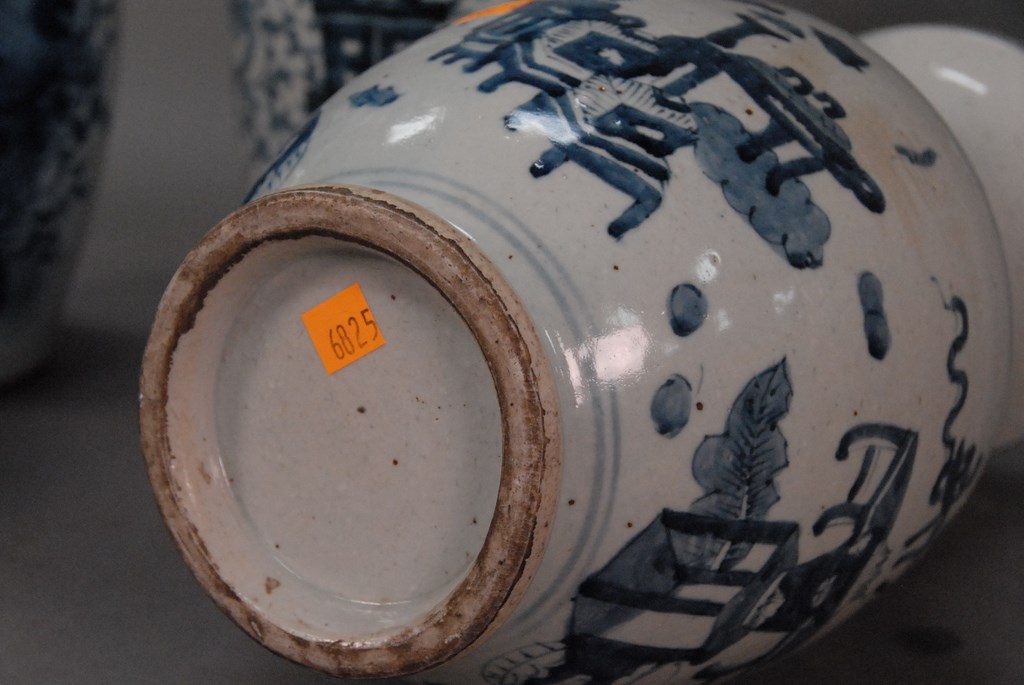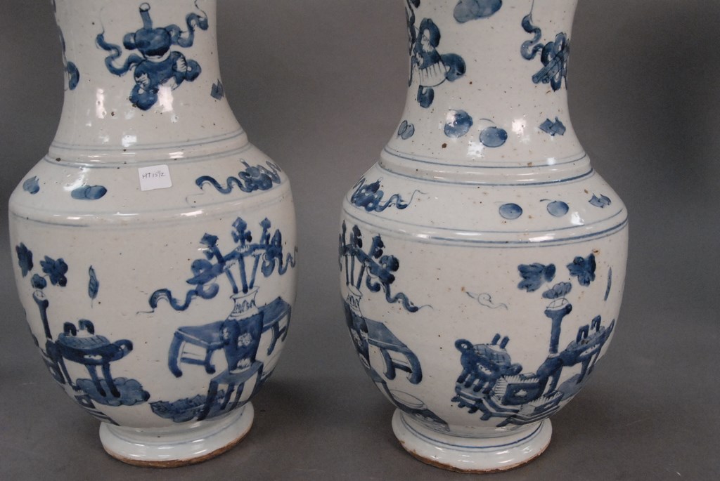 Pair of porcelain blue and white auspicious treasure vases, 19th century.