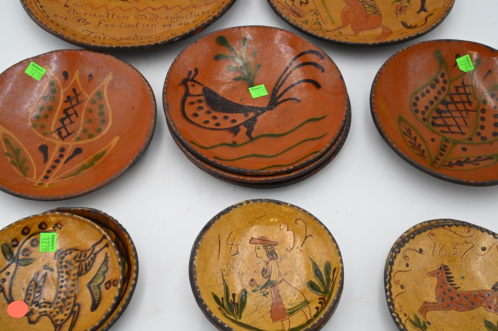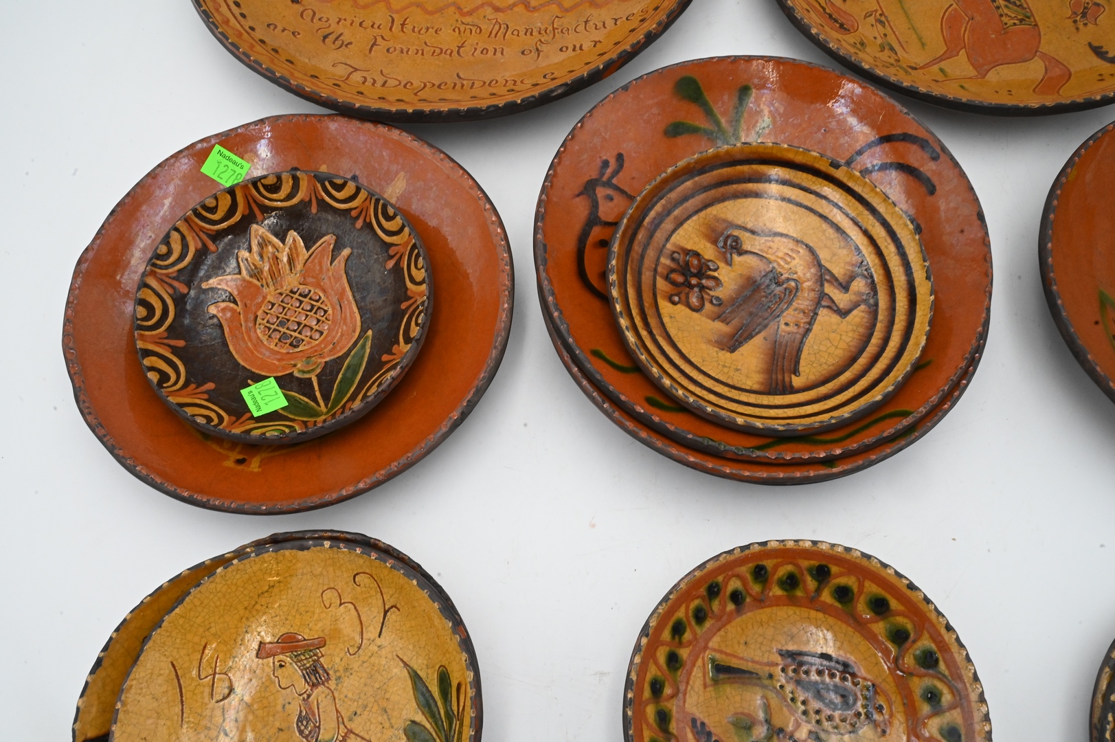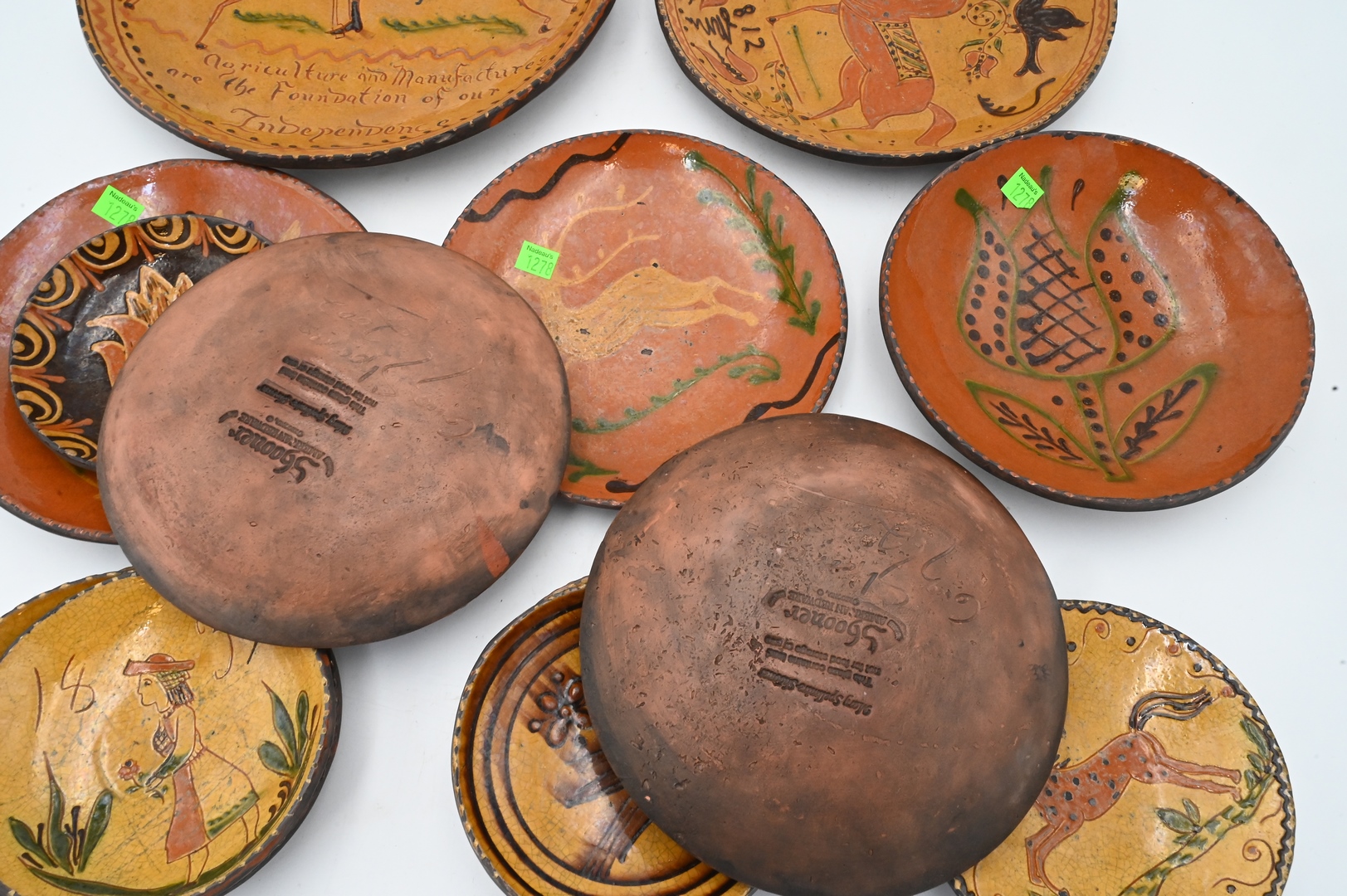 15 Greg Shooner Redware Pottery Pieces, to include 2 chargers, along with a set of 8 small plates and 5 brown glazed plates, all painted in early American manner and signed on the bottom; charger diameter 12 1/2 inches. Provenance: Estate of Peter Tillou, Litchfield, Connecticut.