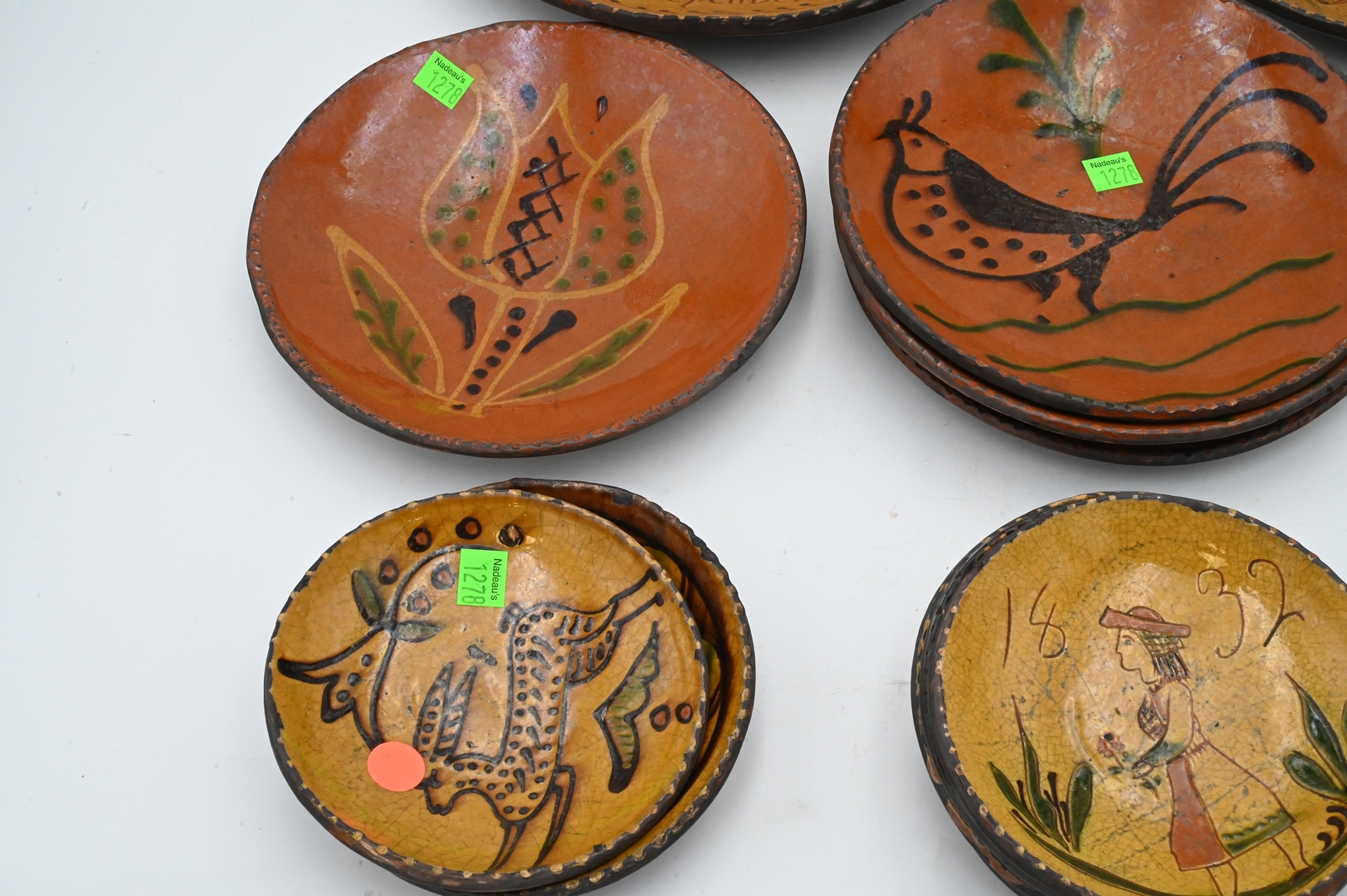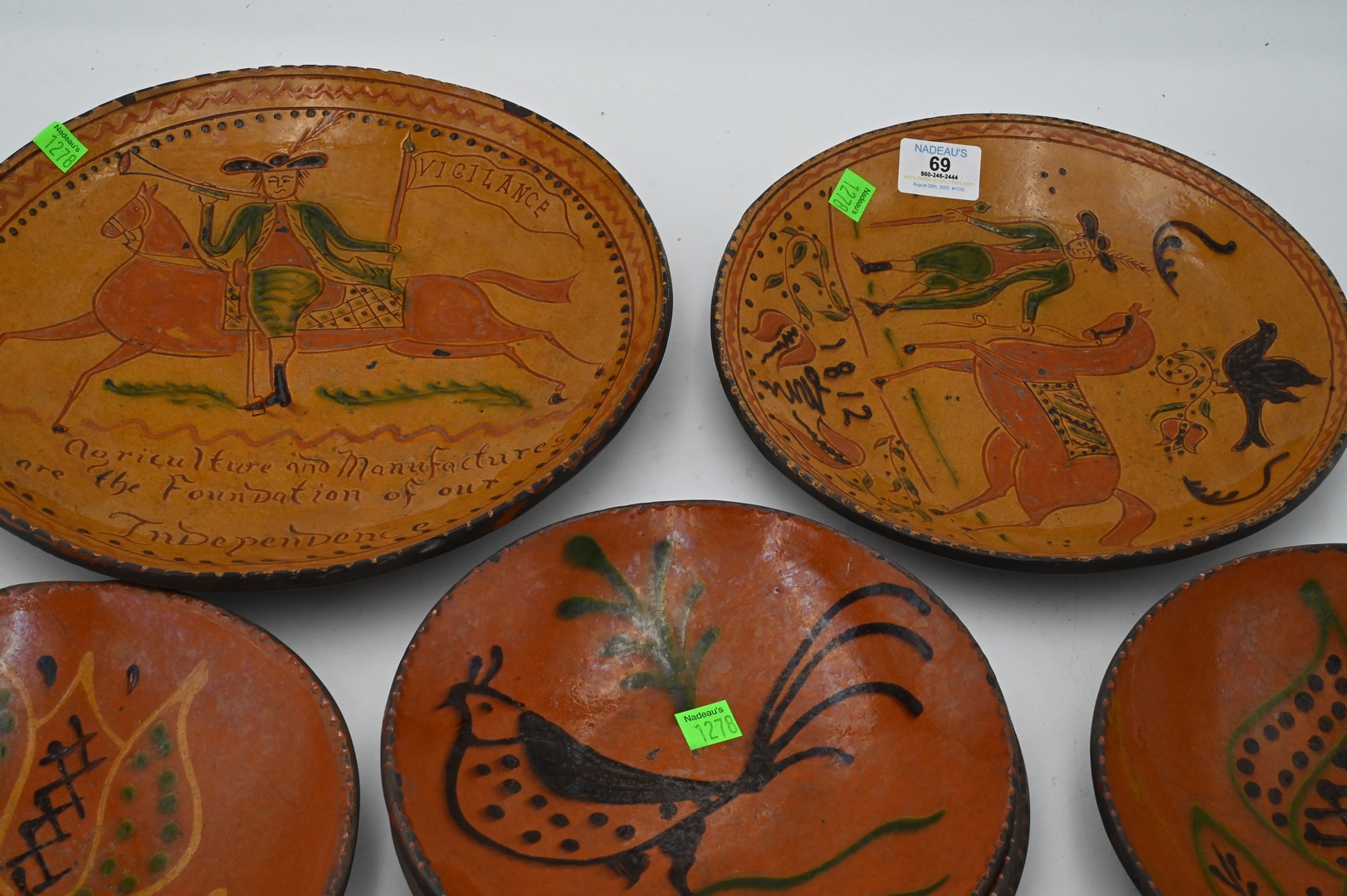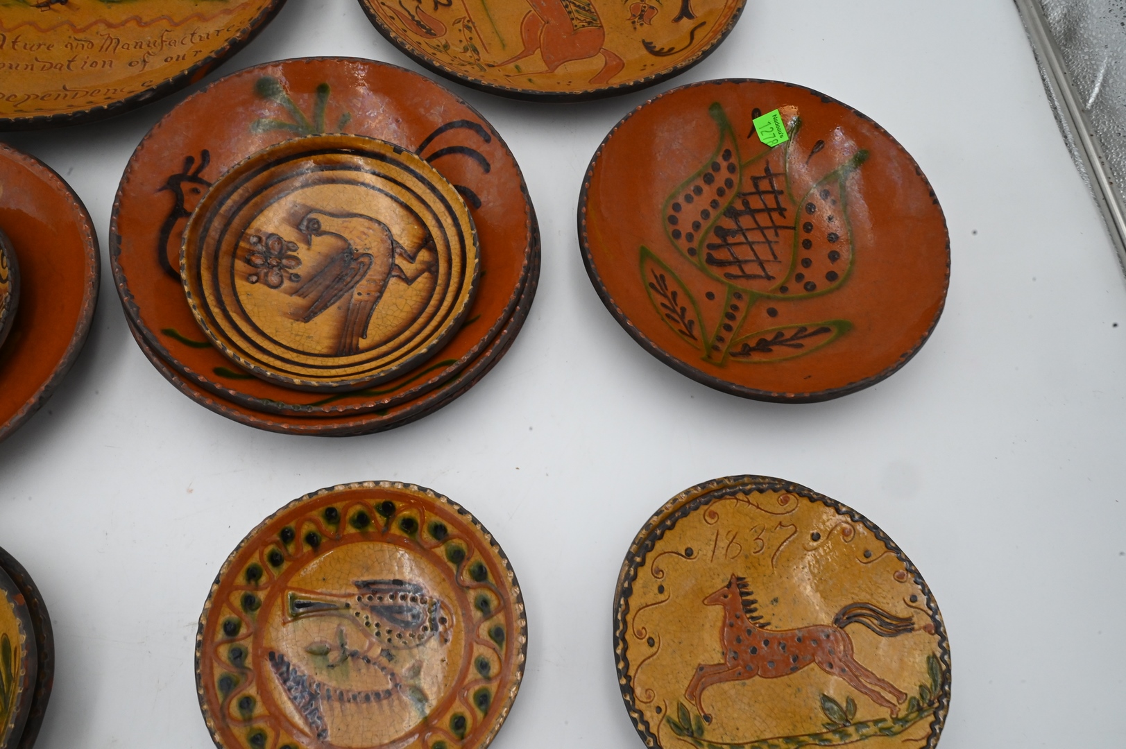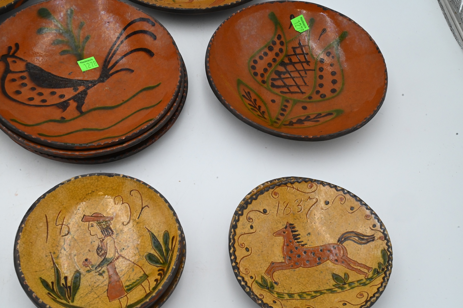 15 Greg Shooner Redware Pottery Pieces, to include 2 chargers, along with a set of 8 small plates and 5 brown glazed plates, all painted in early American manner and signed on the bottom; charger diameter 12 1/2 inches. Provenance: Estate of Peter Tillou, Litchfield, Connecticut.