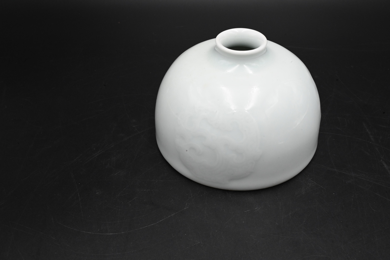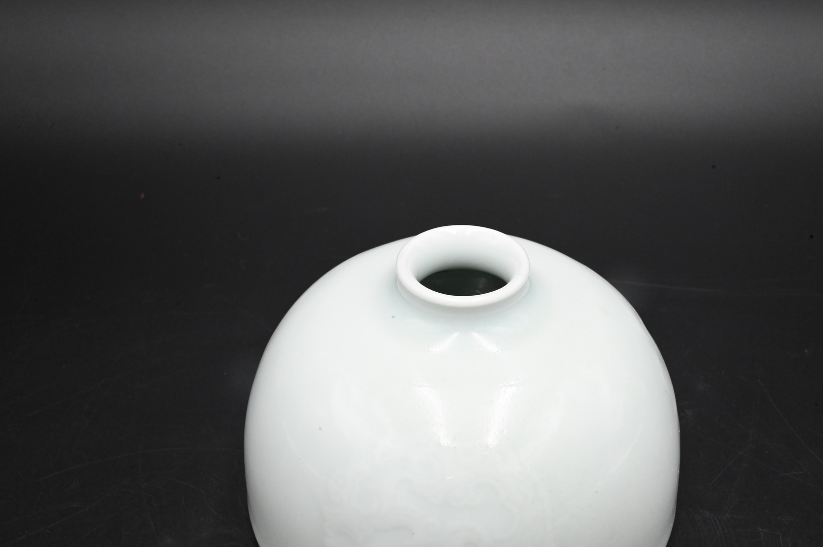 Celadon Beehive Water Pot (Daibi Tsun), covered overall with soft green glaze, incised with three stylized dragon rondels, having a blue underglaze, spurious, Kangxi regnal mark on the base, height 3 1/2 inches, diameter 5 inches.