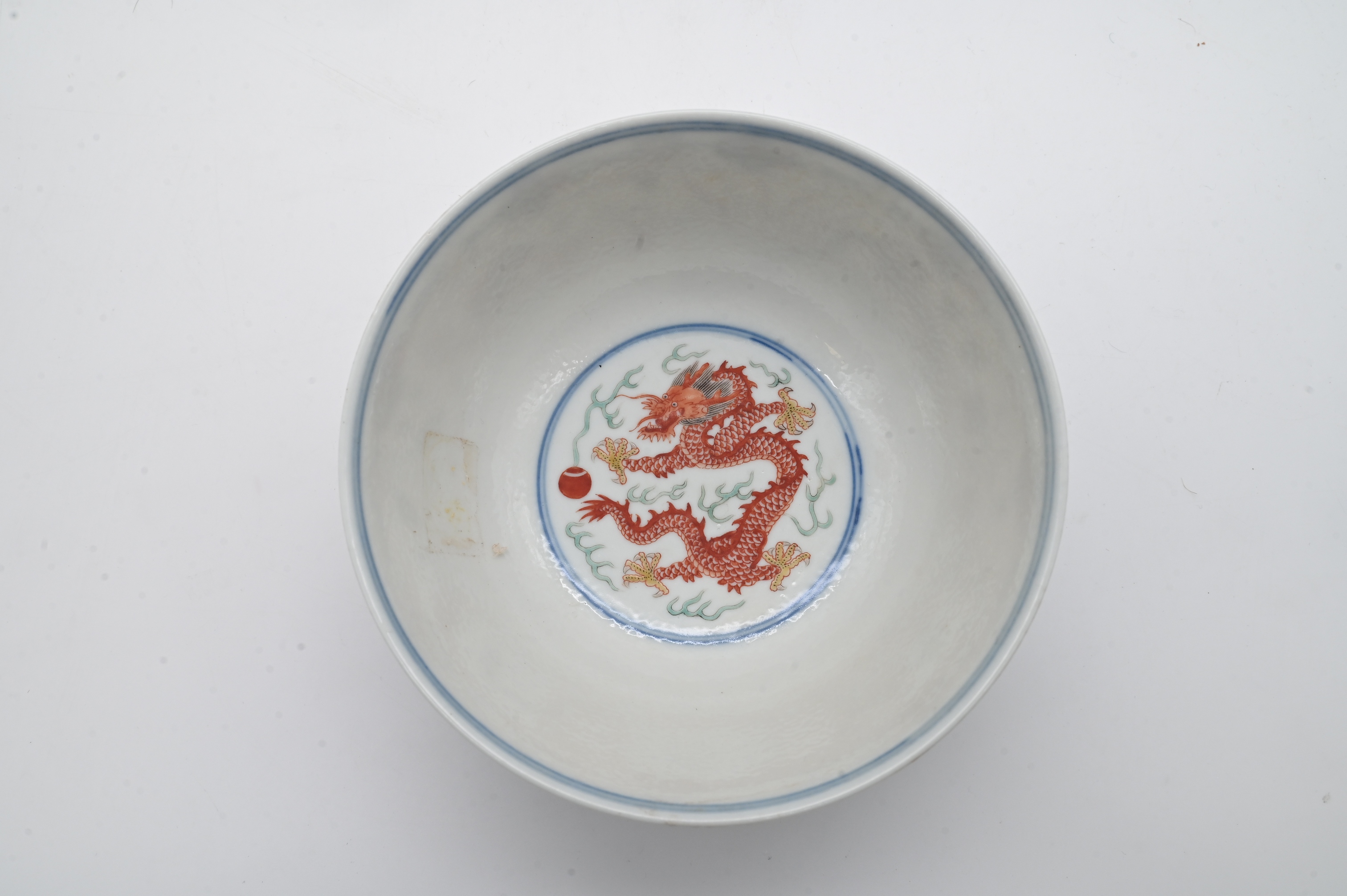 the exterior enamelled in iron red and green featuring striding dragons and flaming pearls amidst floral sprays, divided by phoenixes, beneath a narrow band of bajixiang interspersed with ruyi heads, interior having central medallion depicting an iron red dragon and flaming pearl amid green flame bursts, underside with six-character Qianlong seal mark