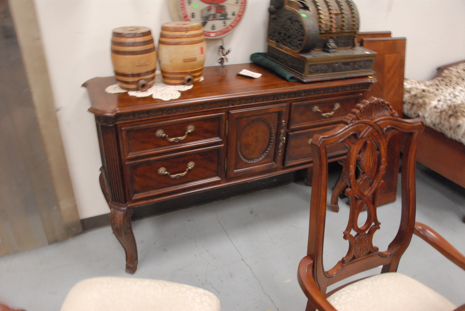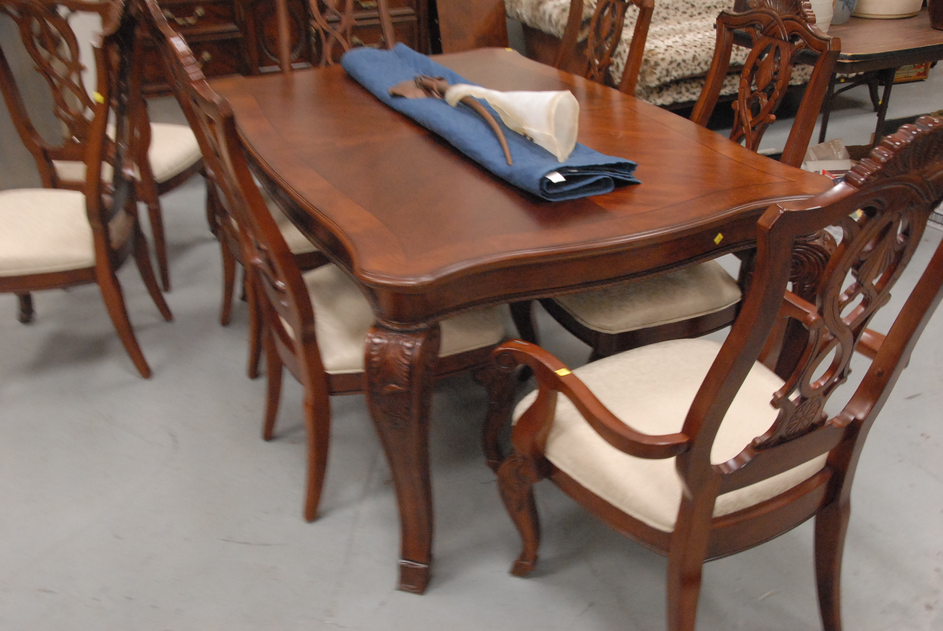 Lot 69: Contemporary dining room set eight chairs, table, two 14 leaves, and sideboard, sideboard: lg. 59, table: lg. 68 wd. 44, open…