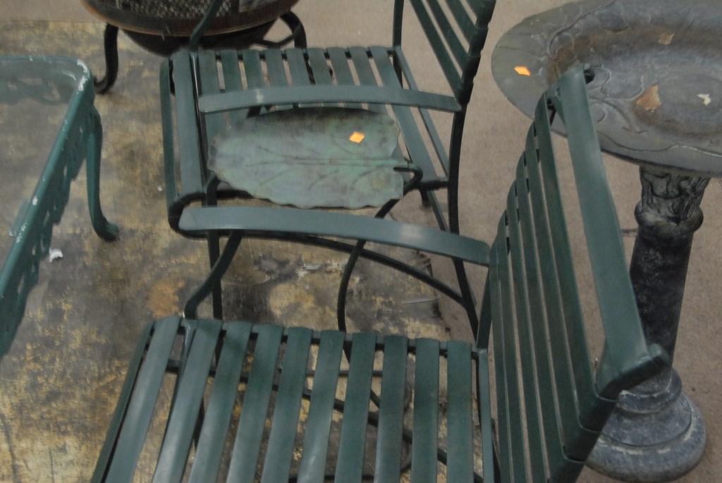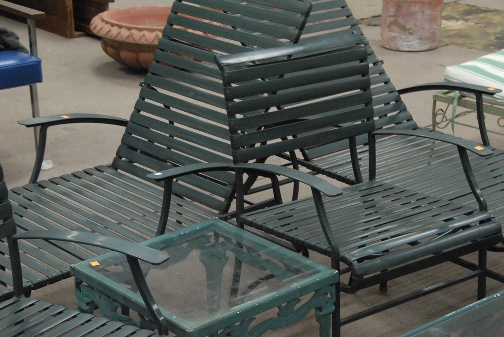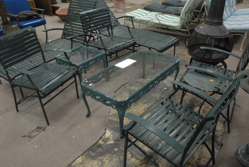 Eleven piece outdoor set: four armchairs, two chaises, bird bath, three tables, and chiminea.