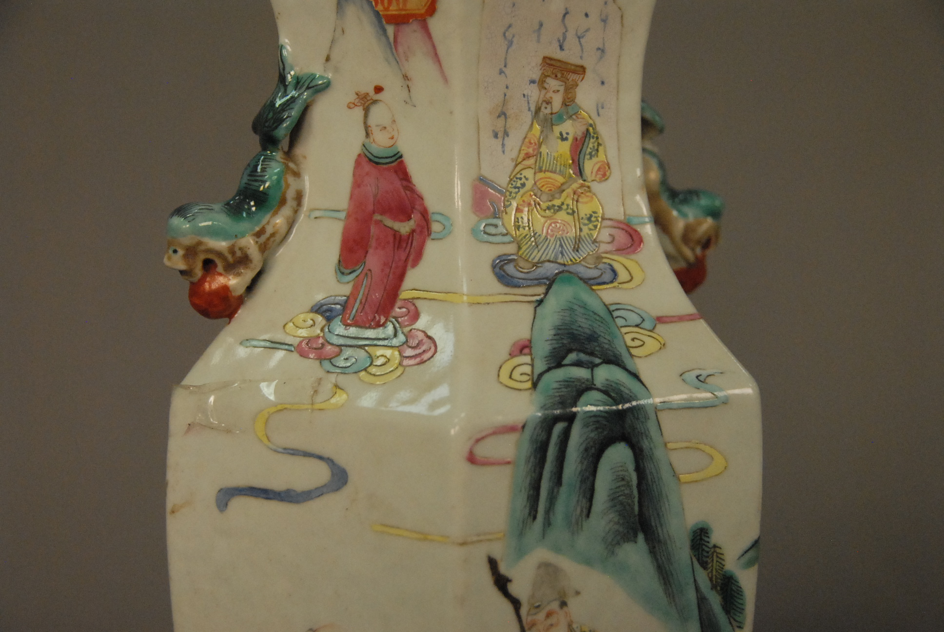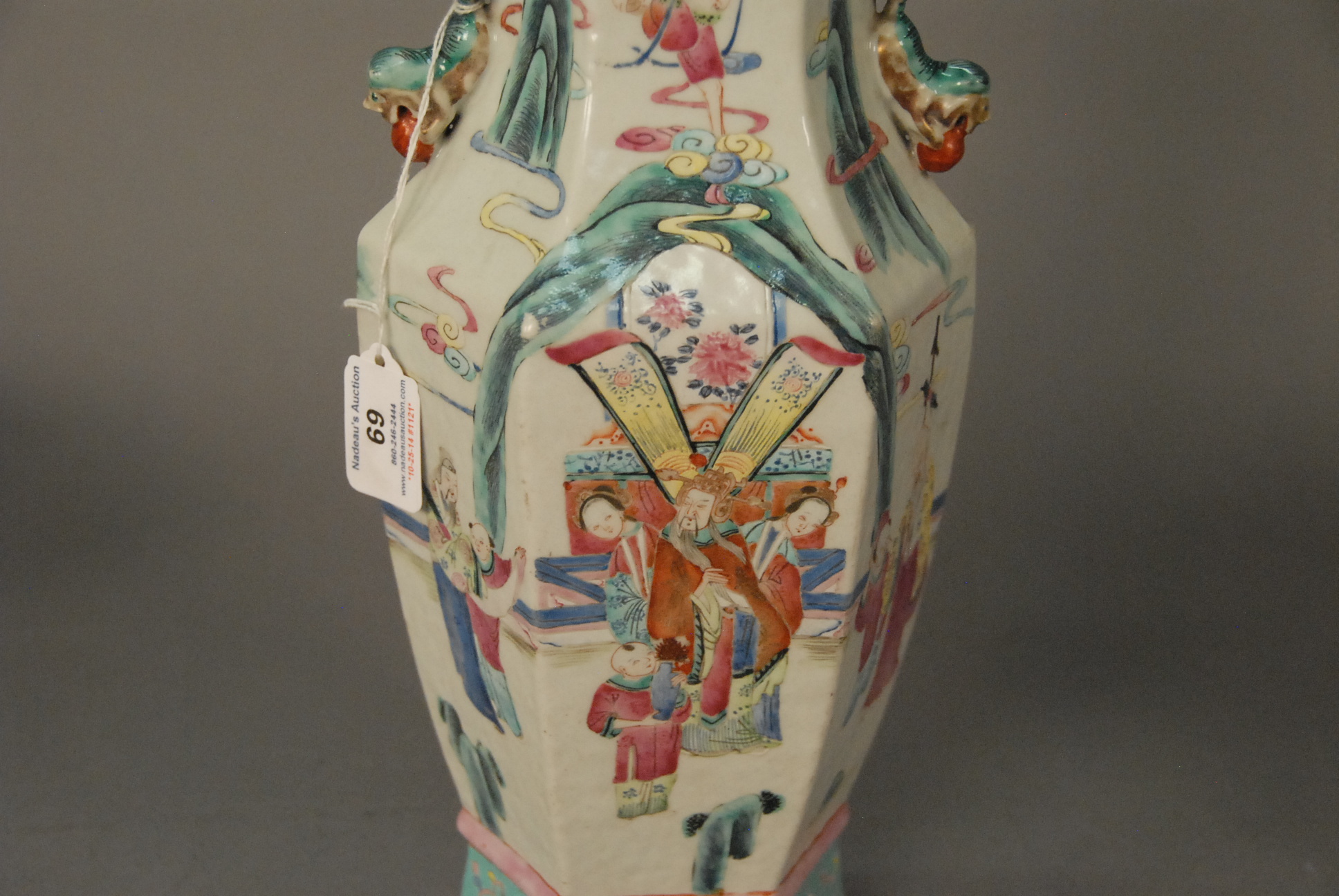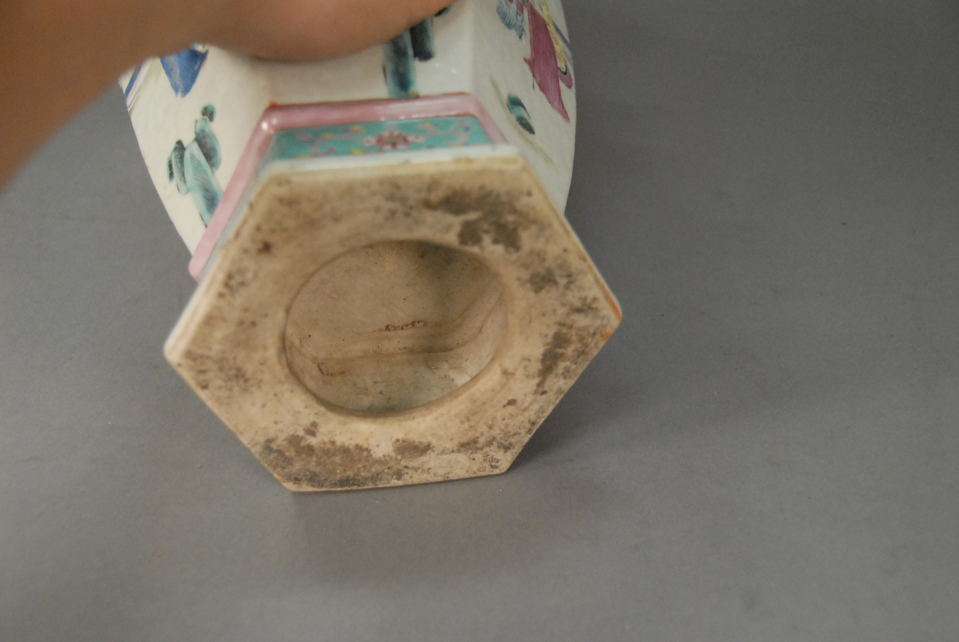 Famille Rose hexagon vase with molded foo dog handles and painted scholars. ht. 14 in.