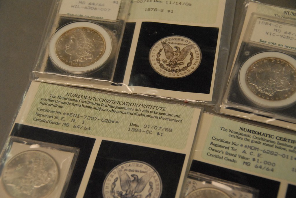 Five silver dollars 1878-S 64/64, 1878-S 64/64, 1887 64/64, 1884-CC 64/64, and 1884-CC 64/64.