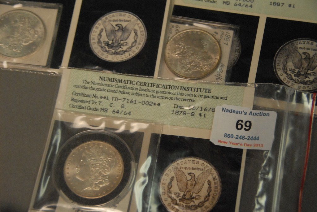 Lot 69: Five silver dollars 1878-S 64/64, 1878-S 64/64, 1887 64/64, 1884-CC 64/64, and 1884-CC 64/64
