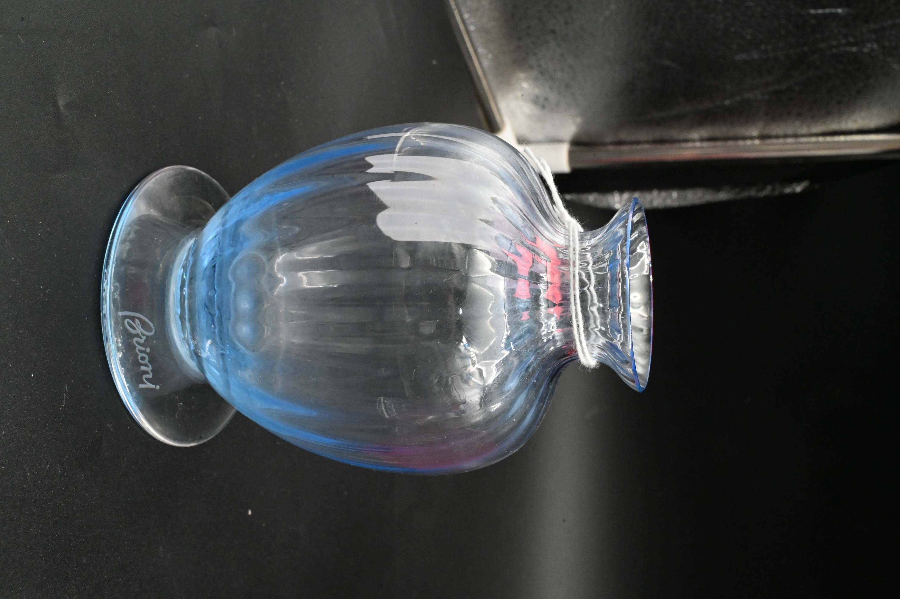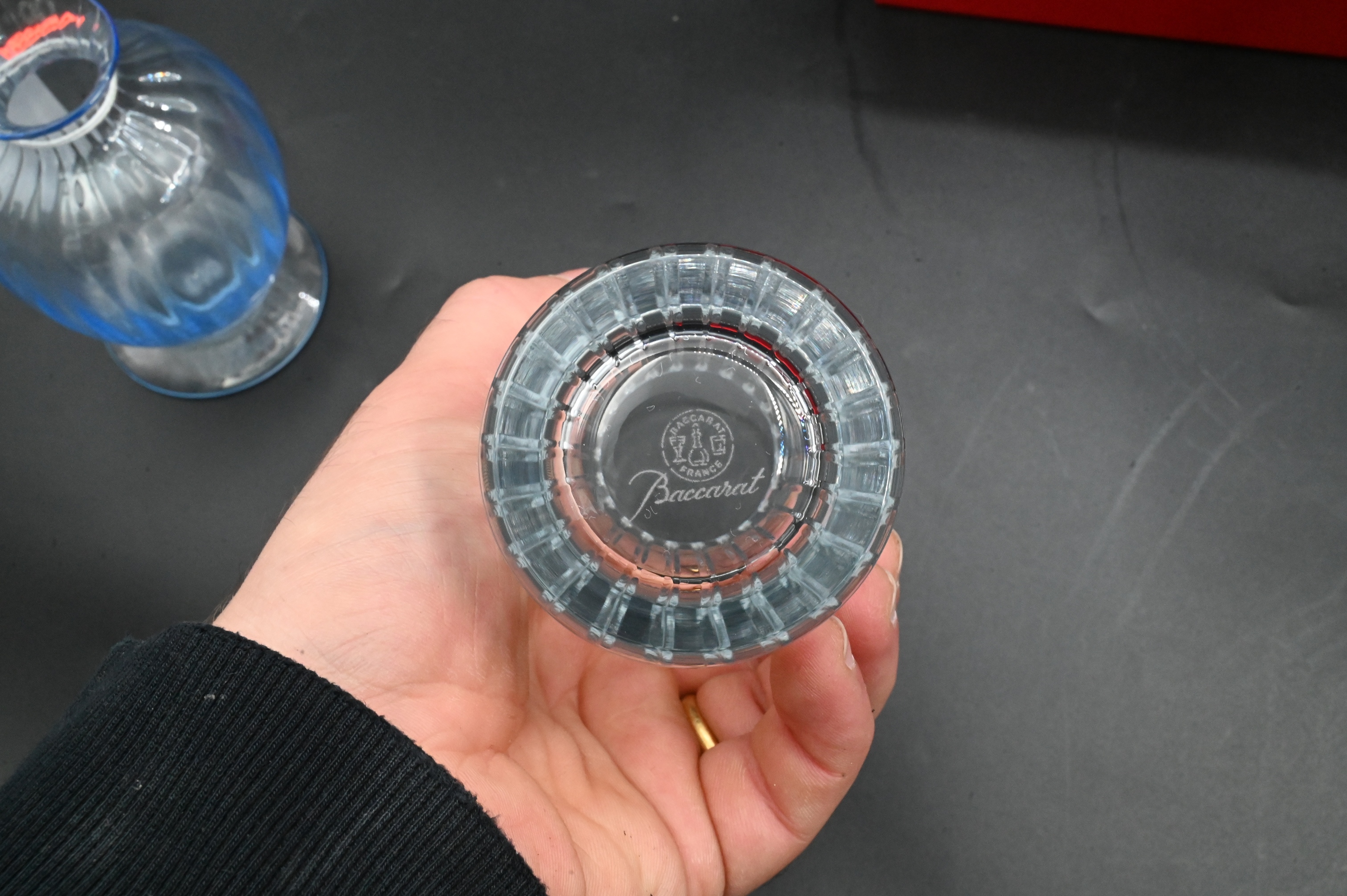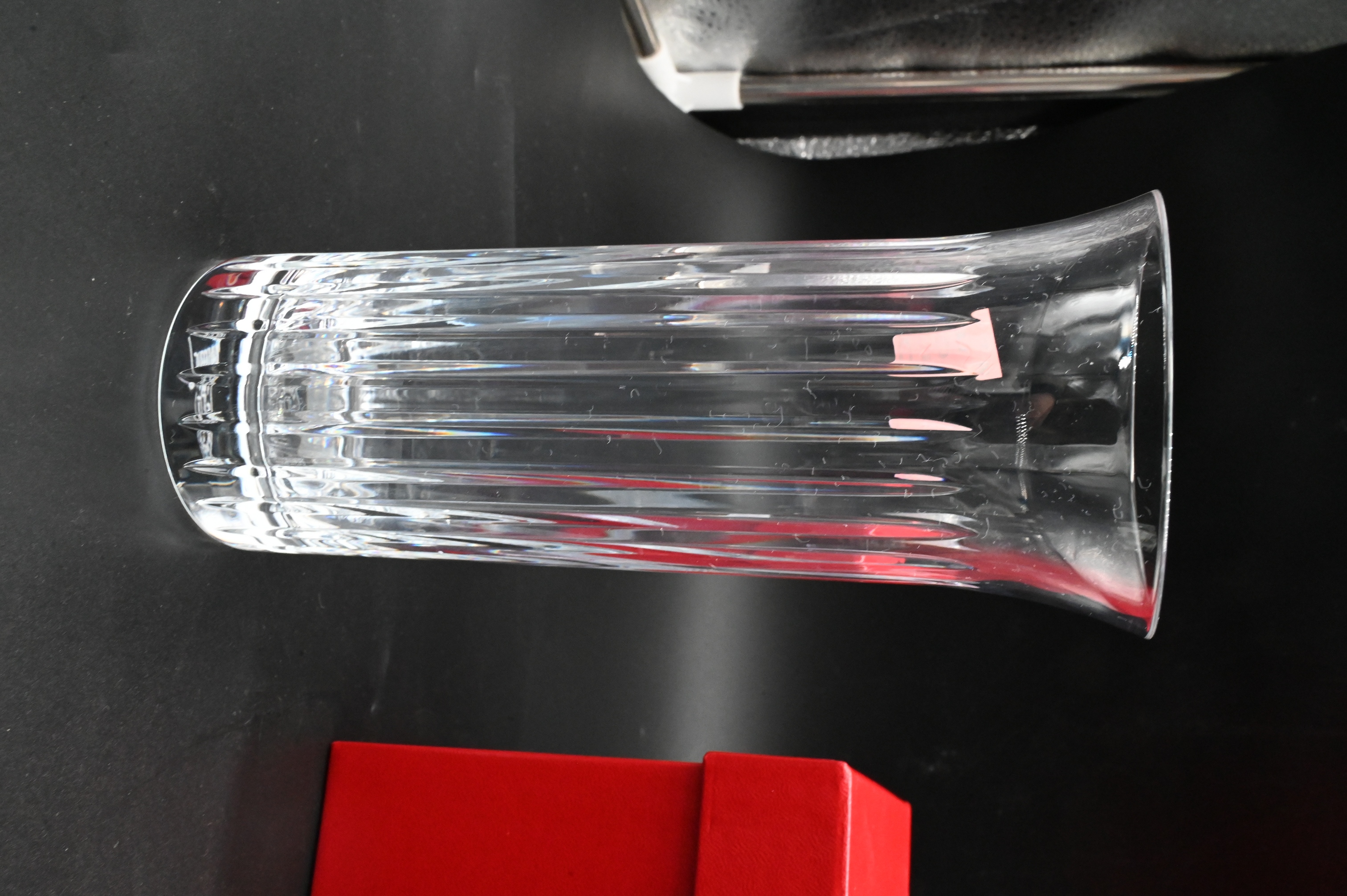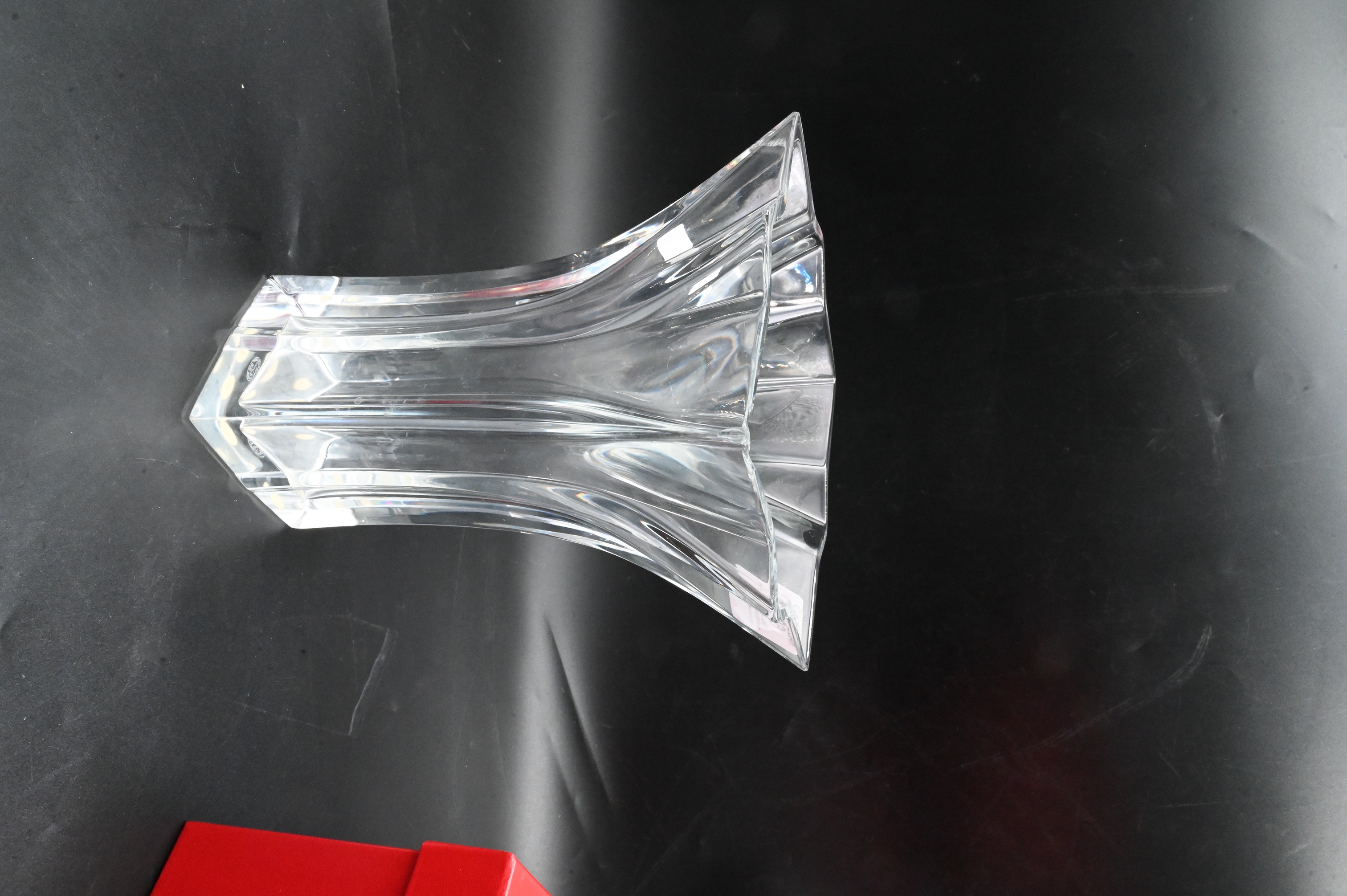Including a fluted crystal vase with box, a flared square vase, and a Brioni art glass Baccarat crystal swirl footed perfume bottle, each signed Baccarat.