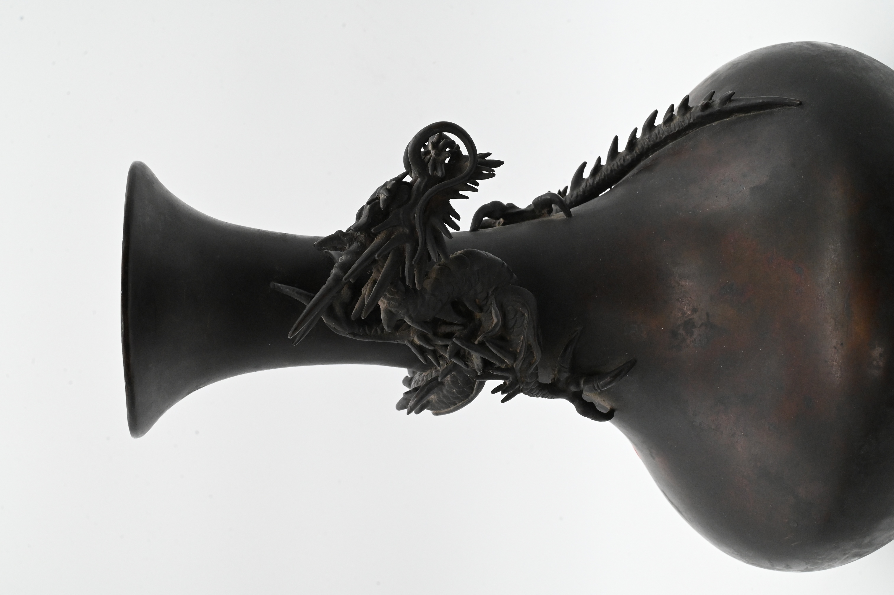 A heavily cast bronze vase with a tall flaring neck and bulbous body, encircled by a dramatically modeled three-dimensional three clawed dragon in high relief, the dragon’s head, spiked mane, curling whiskers, and coiled body wrap tightly around the neck and shoulder, with finely detailed claws and scaled tail extending across the form, deep brown–black patination with scattered oxidation from age, unmarked