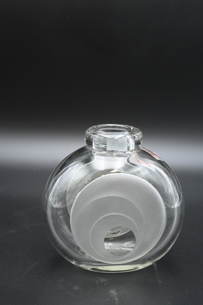 Lot 69: Jean Luce (1895-1964), clear glass vase with etched design, height 6 inches, (chips).