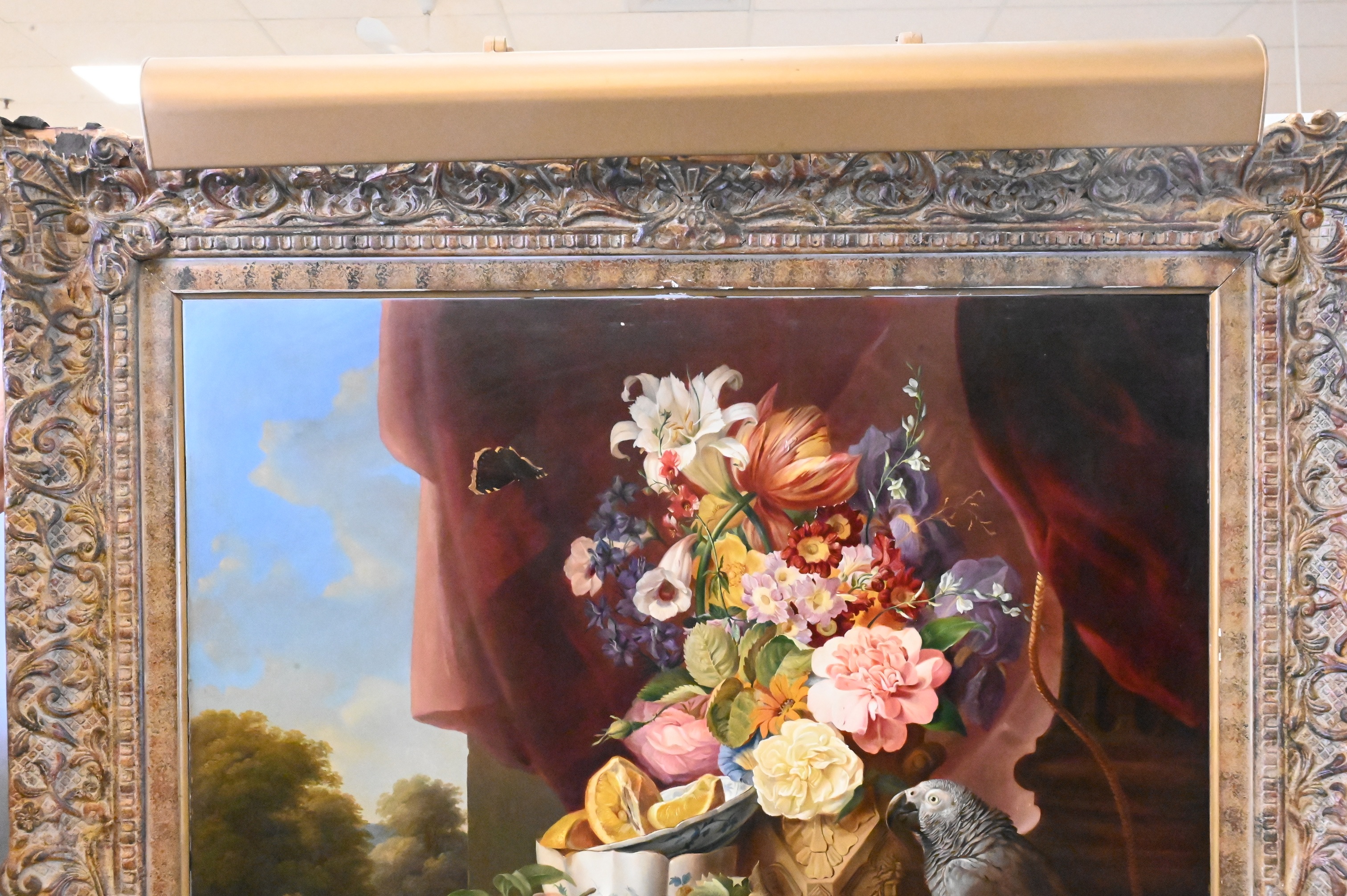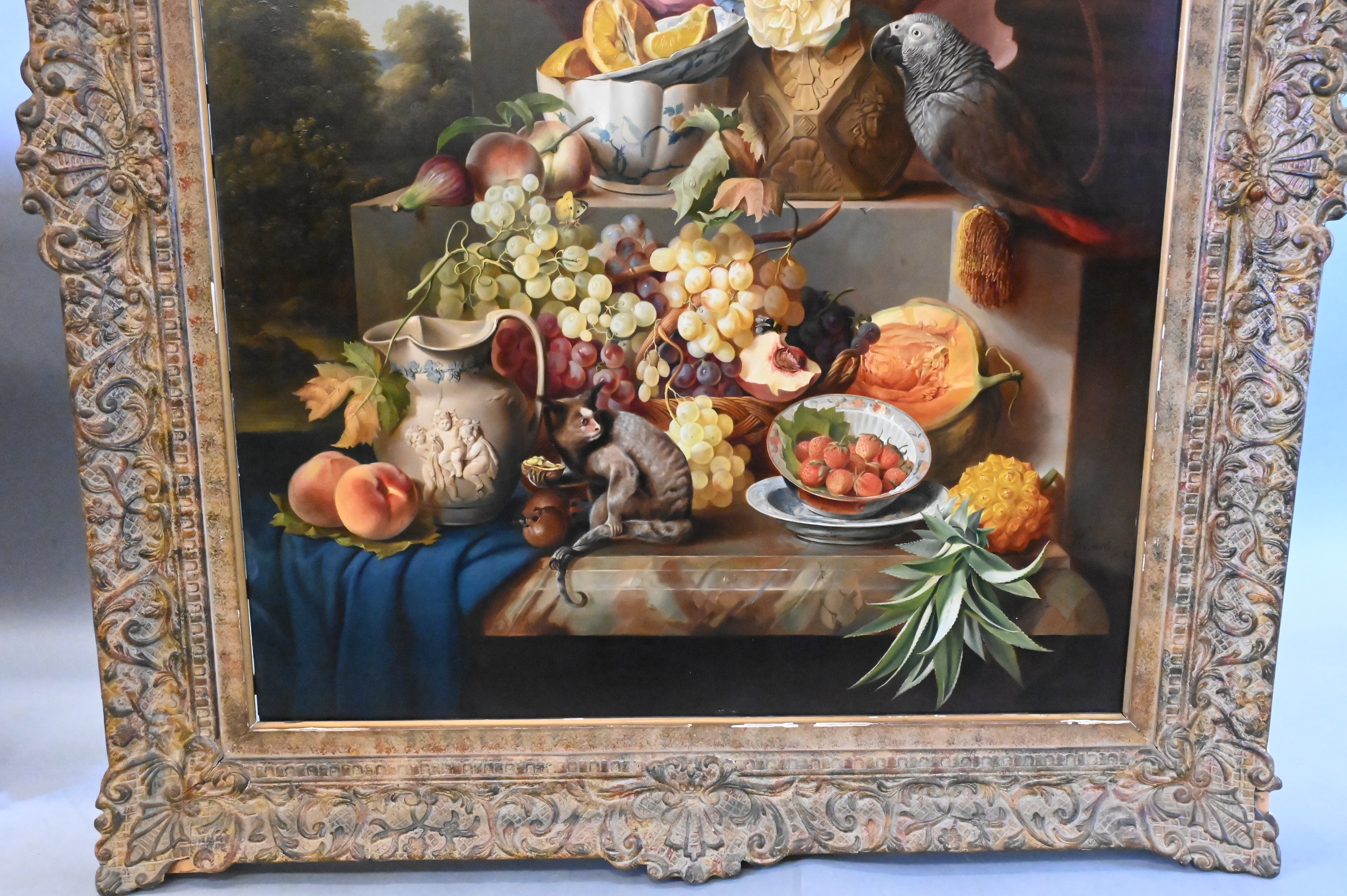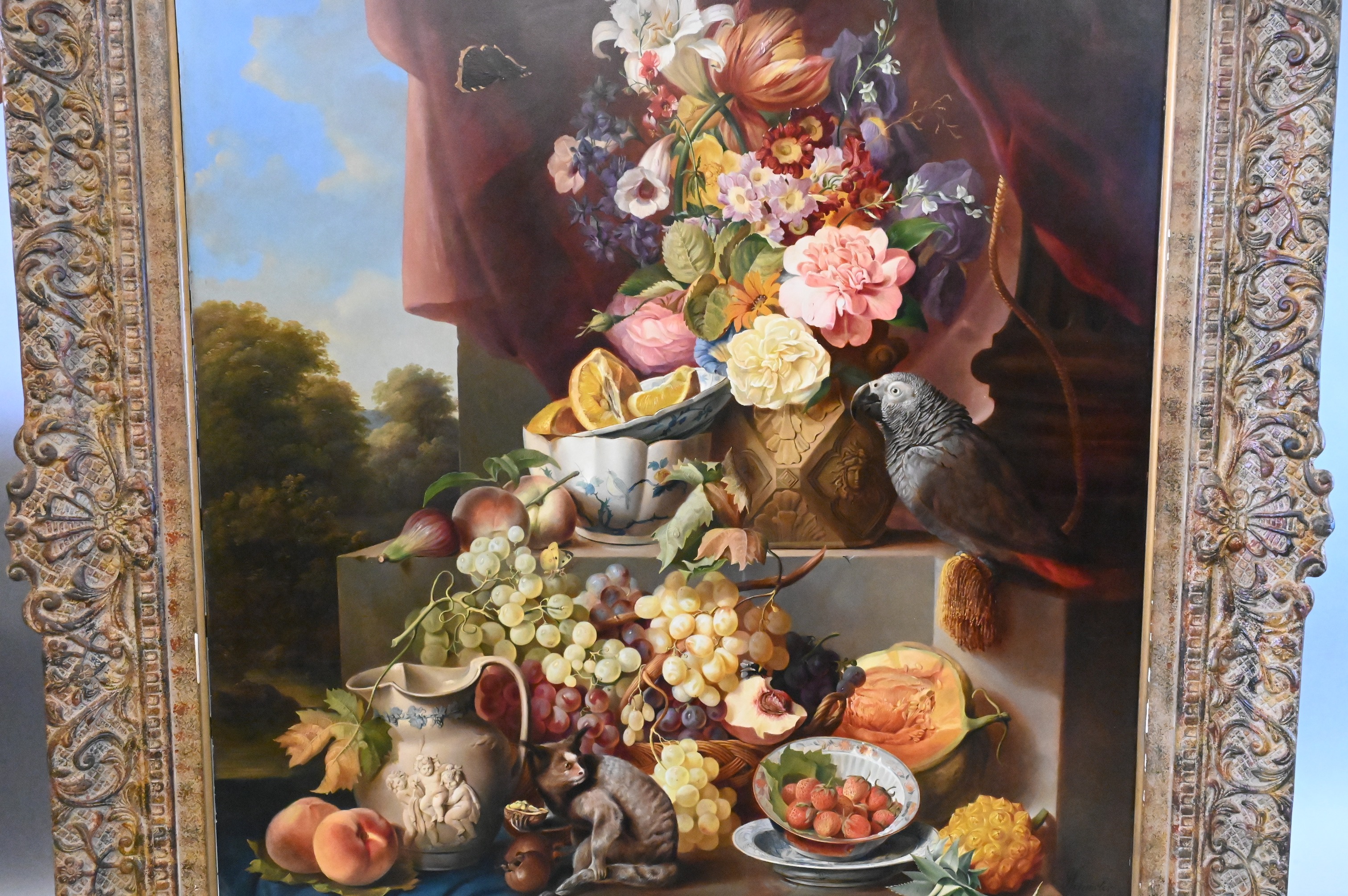 Ornate still life with large bouquet of flowers in a vase, exotic fruit in baskets set in a classical backdrop featuring a grey parrot and monkey