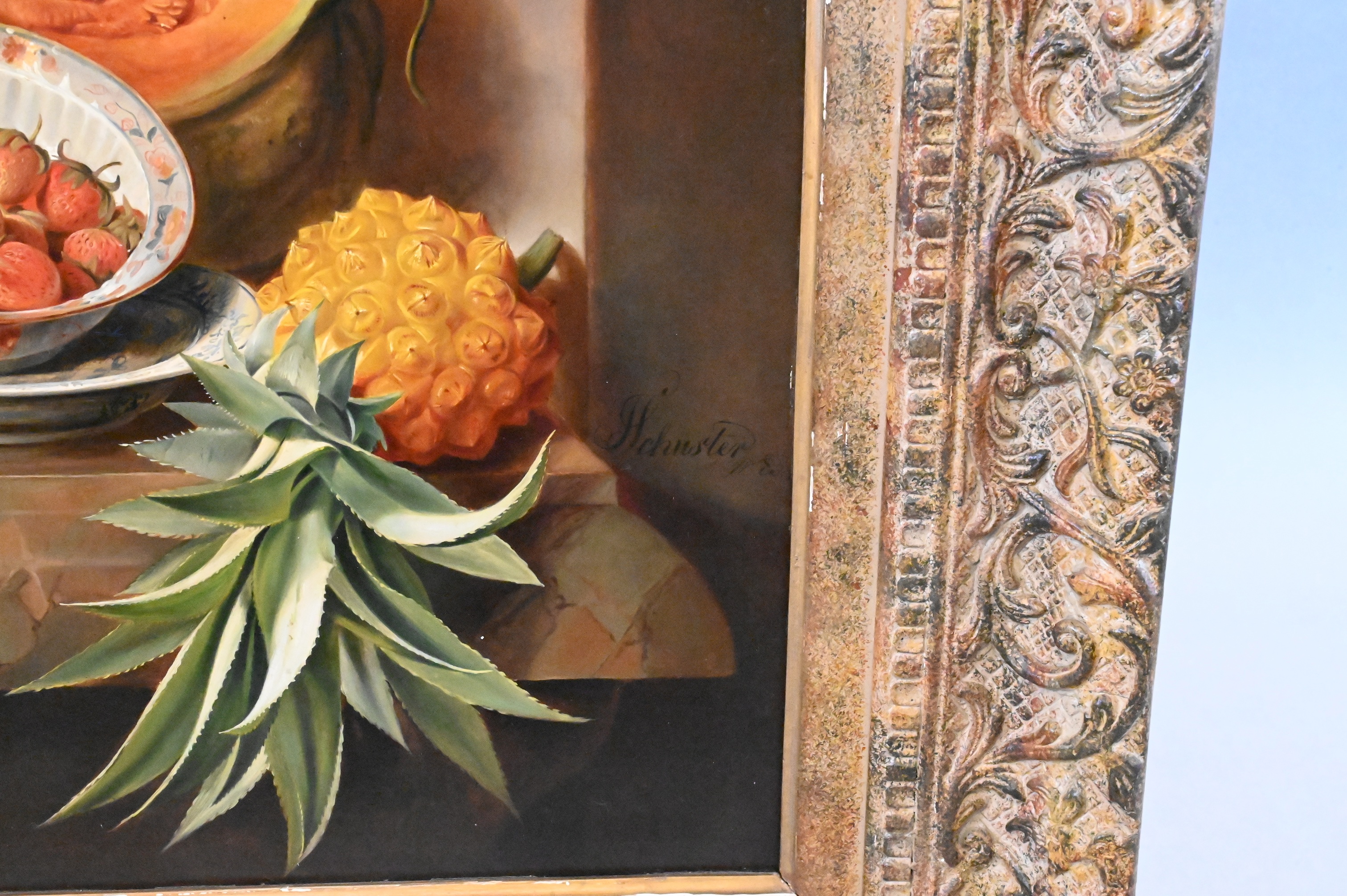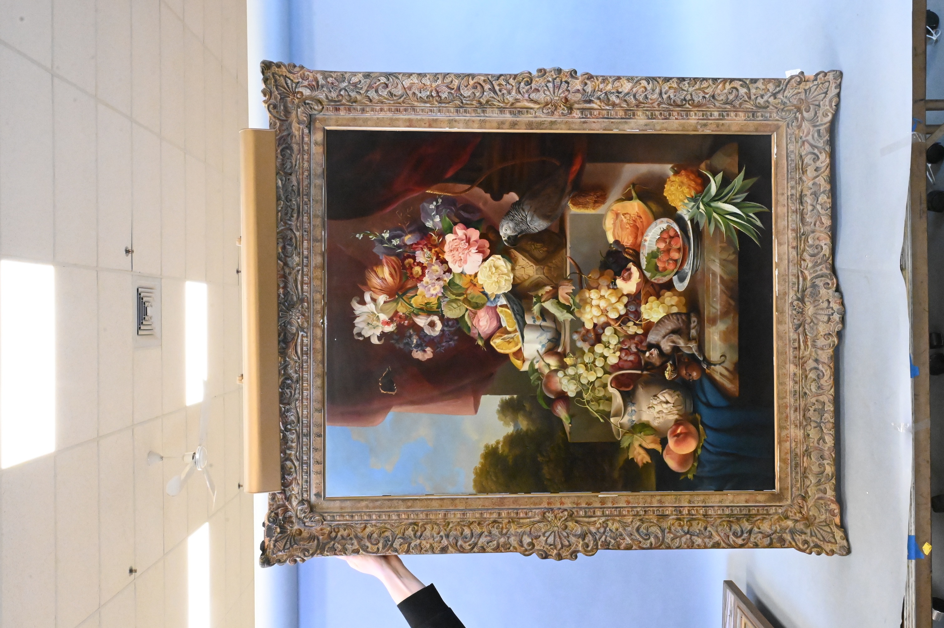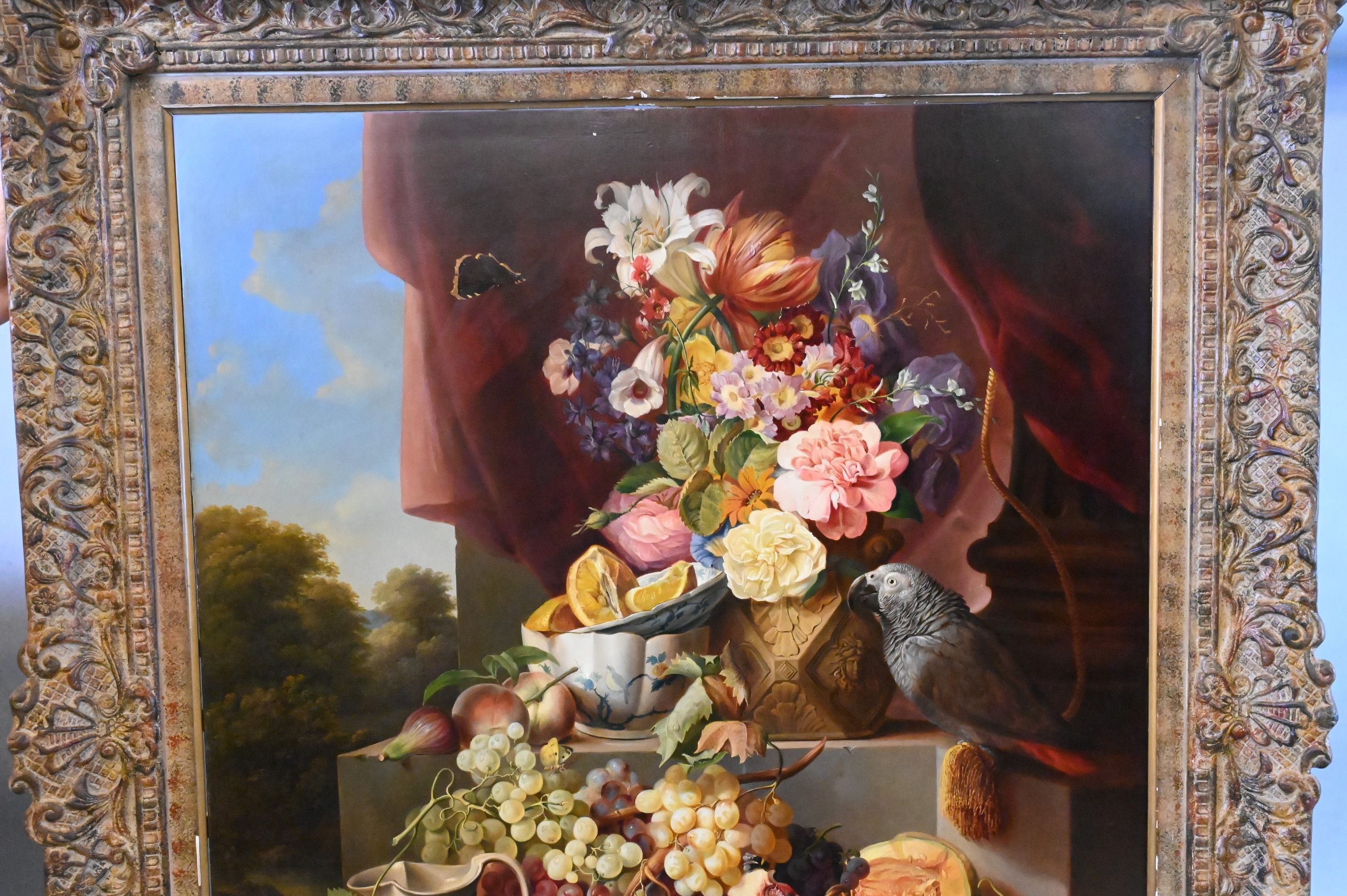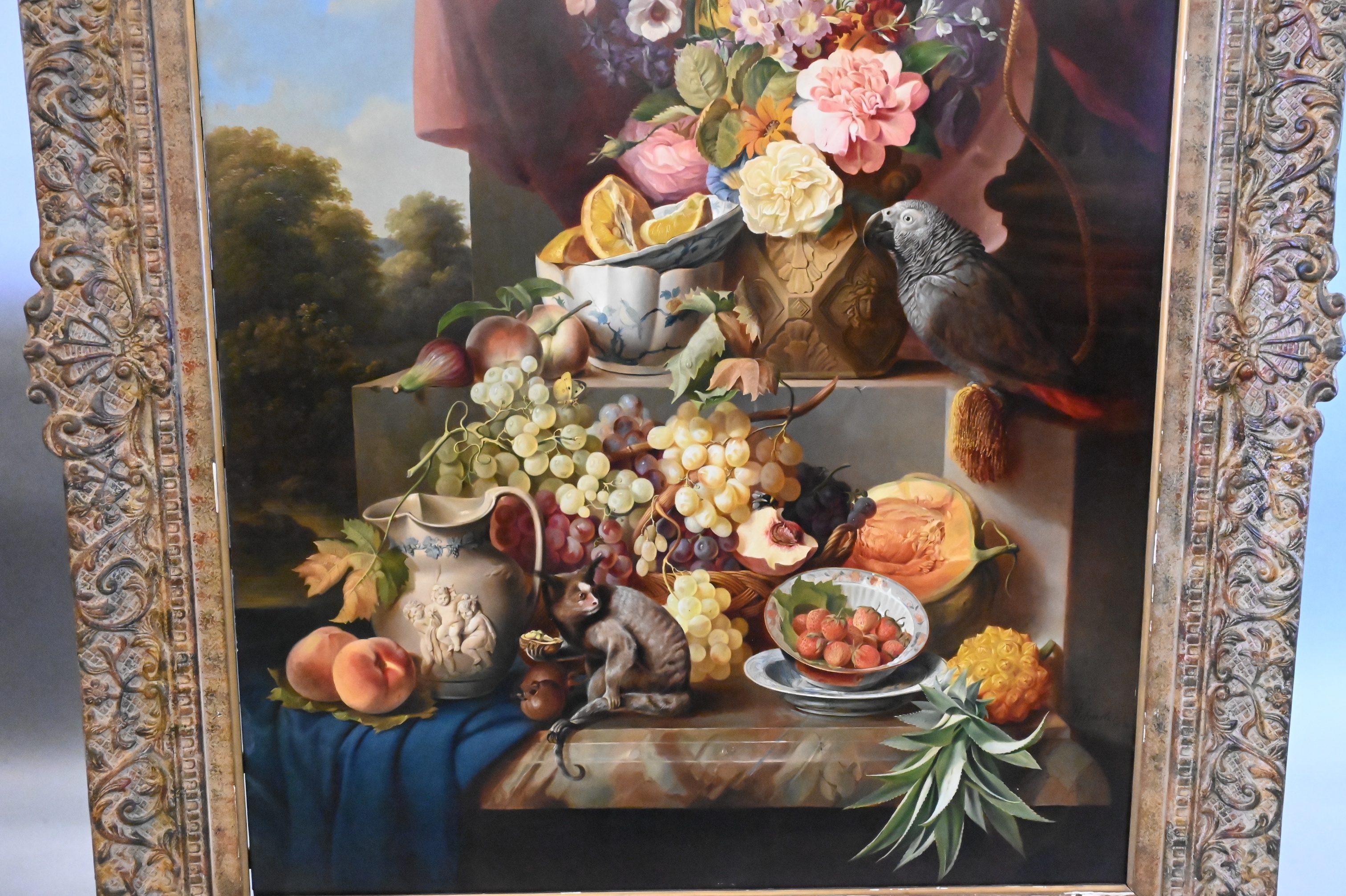 Ornate still life with large bouquet of flowers in a vase, exotic fruit in baskets set in a classical backdrop featuring a grey parrot and monkey
