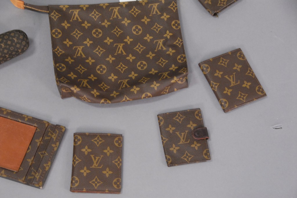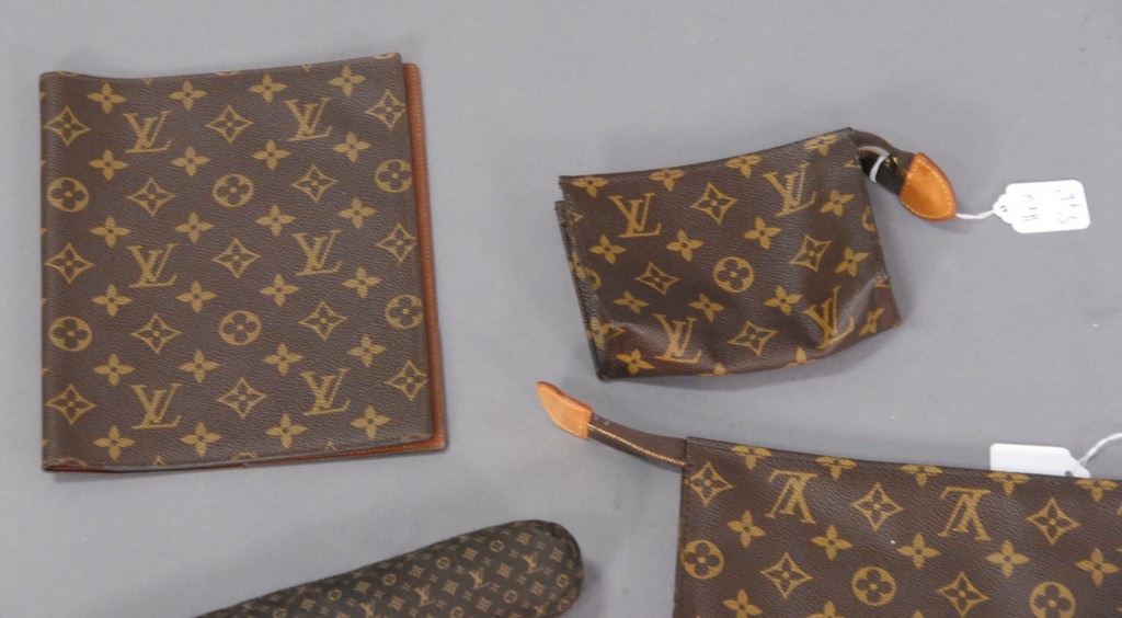 Louis Vuitton nine piece lot four wallets, two zipper cosmetics bags, one note paper fold, one desk note pad holder, and one umbrella.