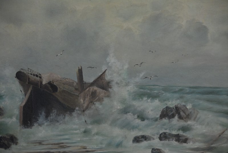 Oil on canvas painting of ship wreck unsigned, 26 x 39.