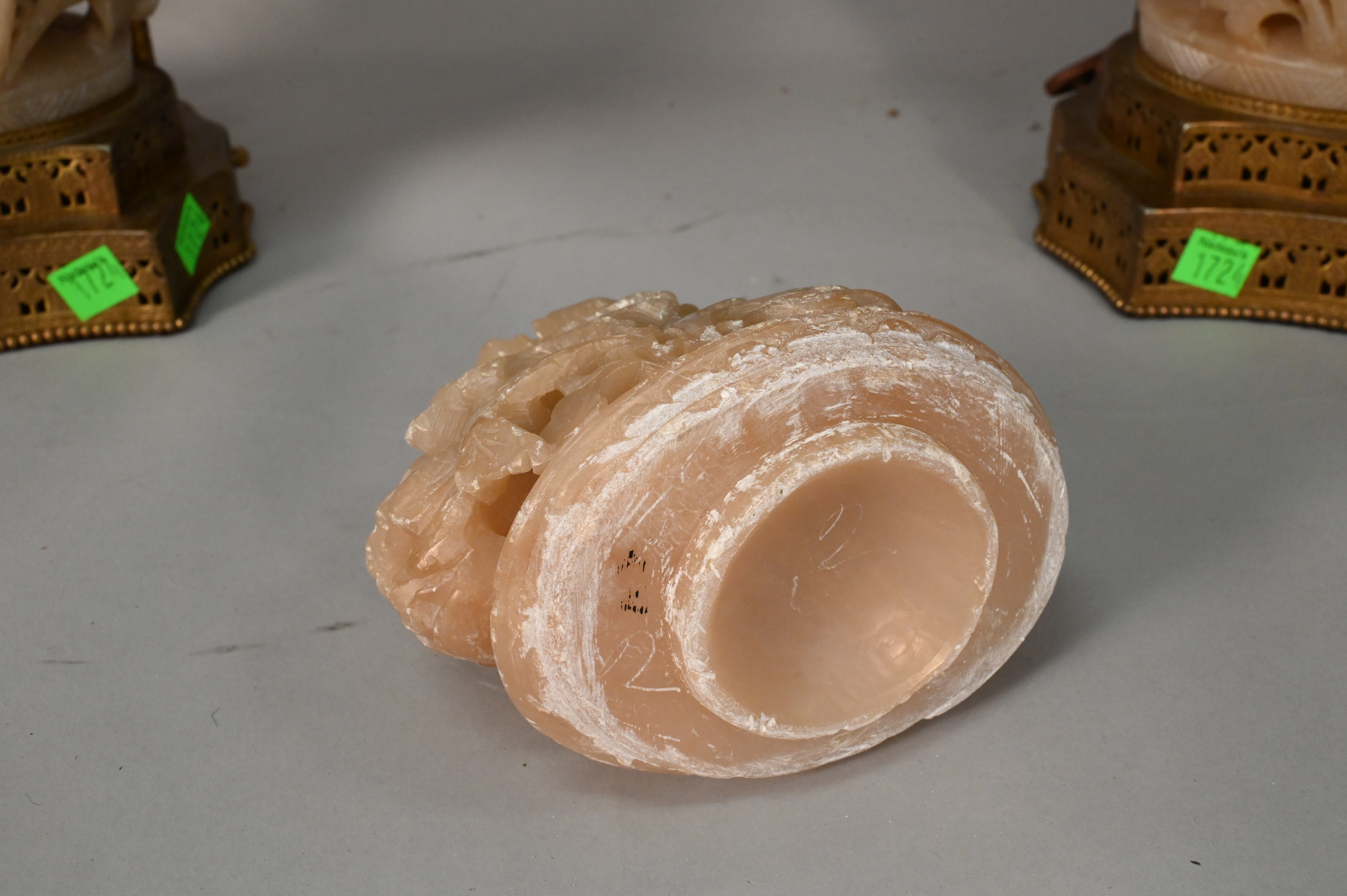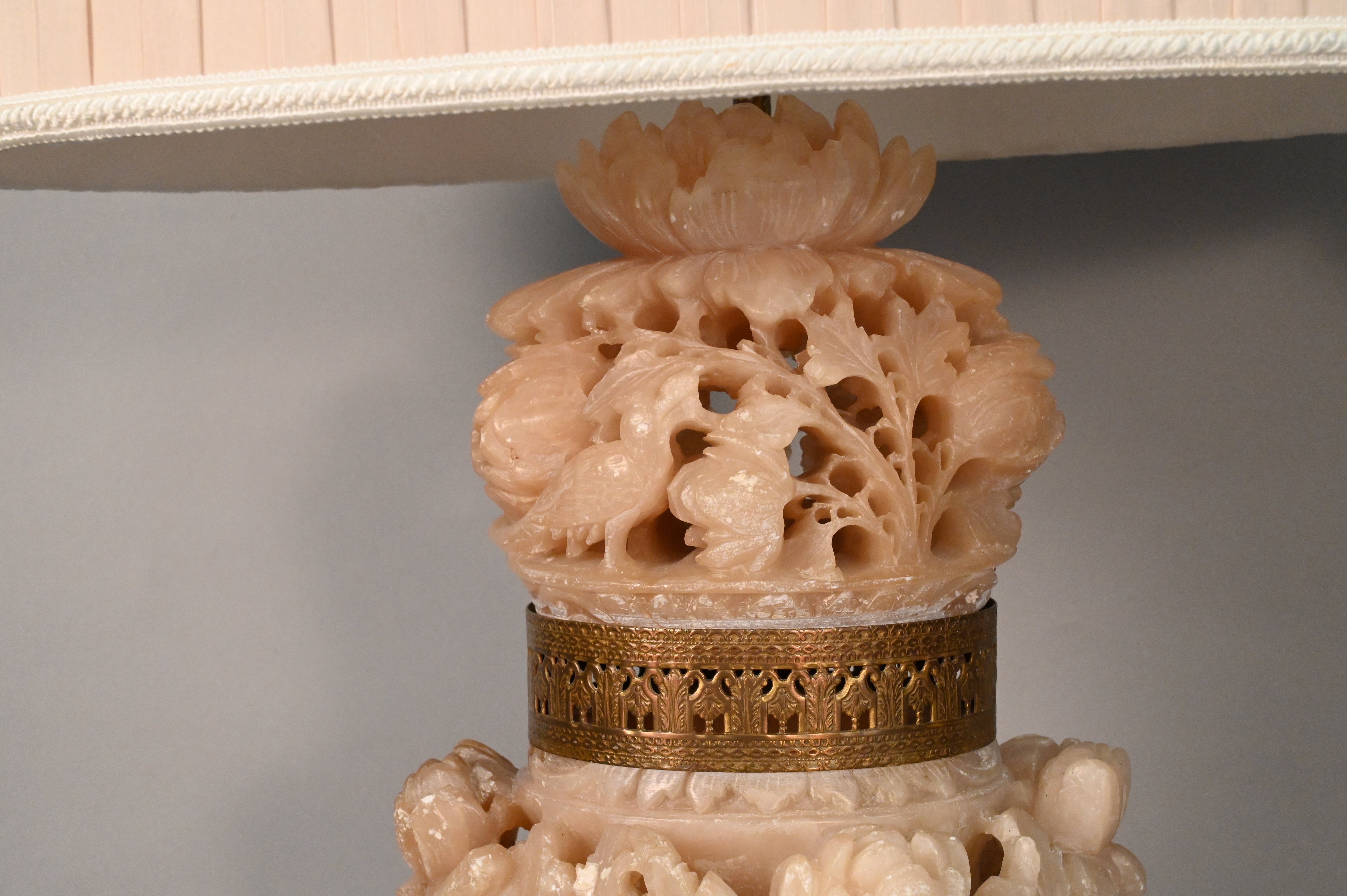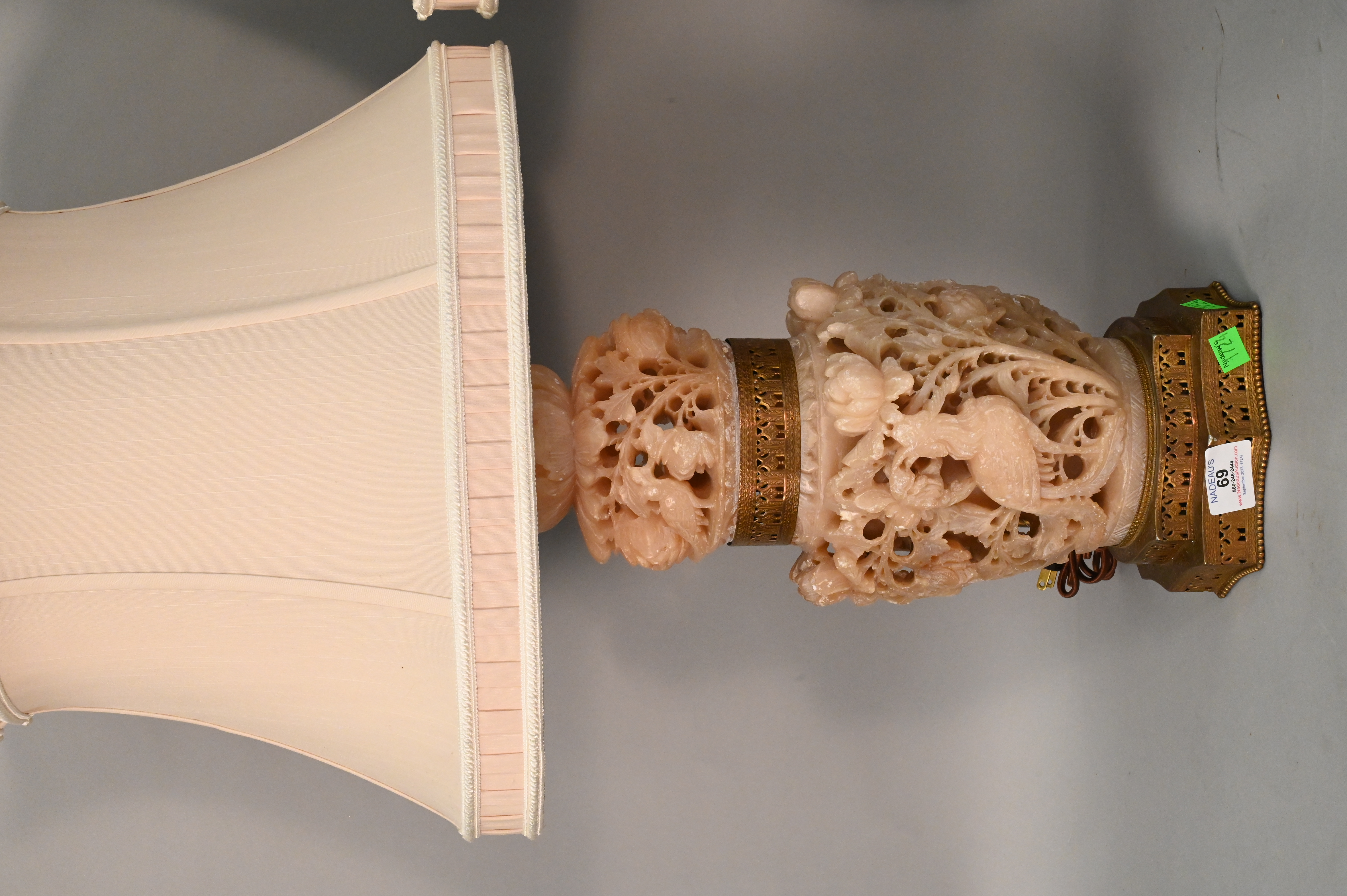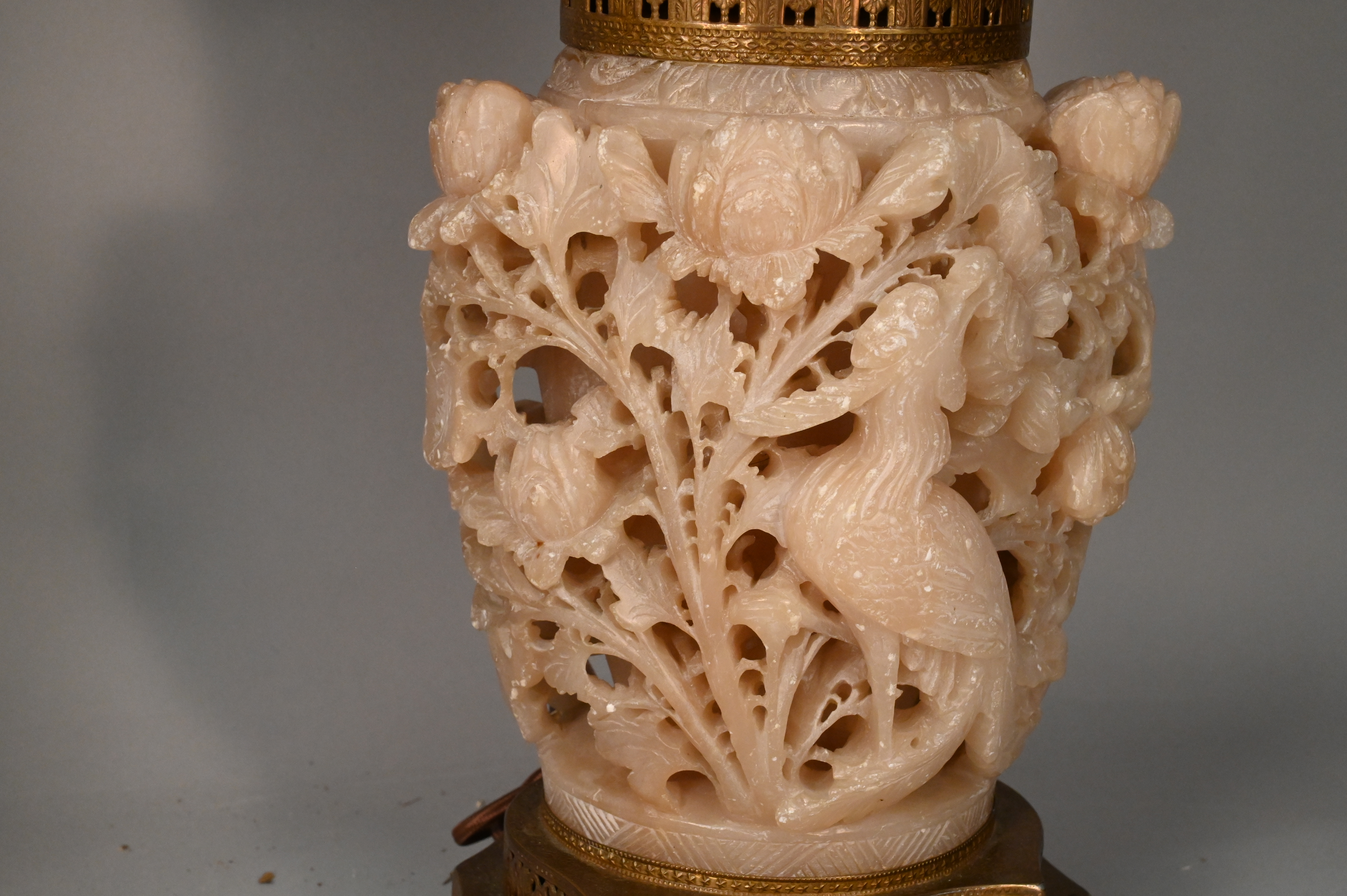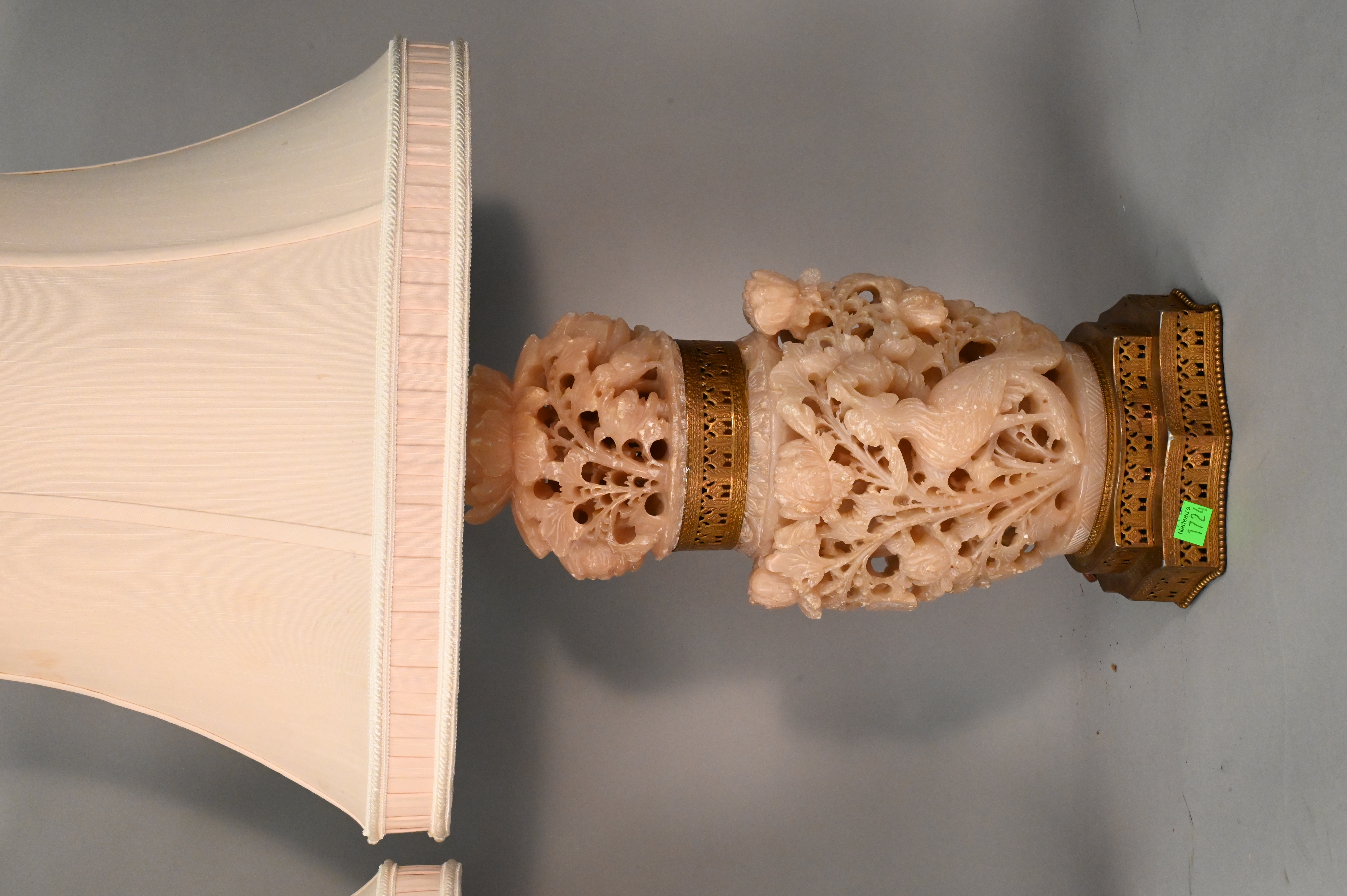 Pair of Asian Carved Soapstone Lamps, in urn form with carved covers and handles, brass mounts and inlay, soapstone height 13 inches, height 29 inches.