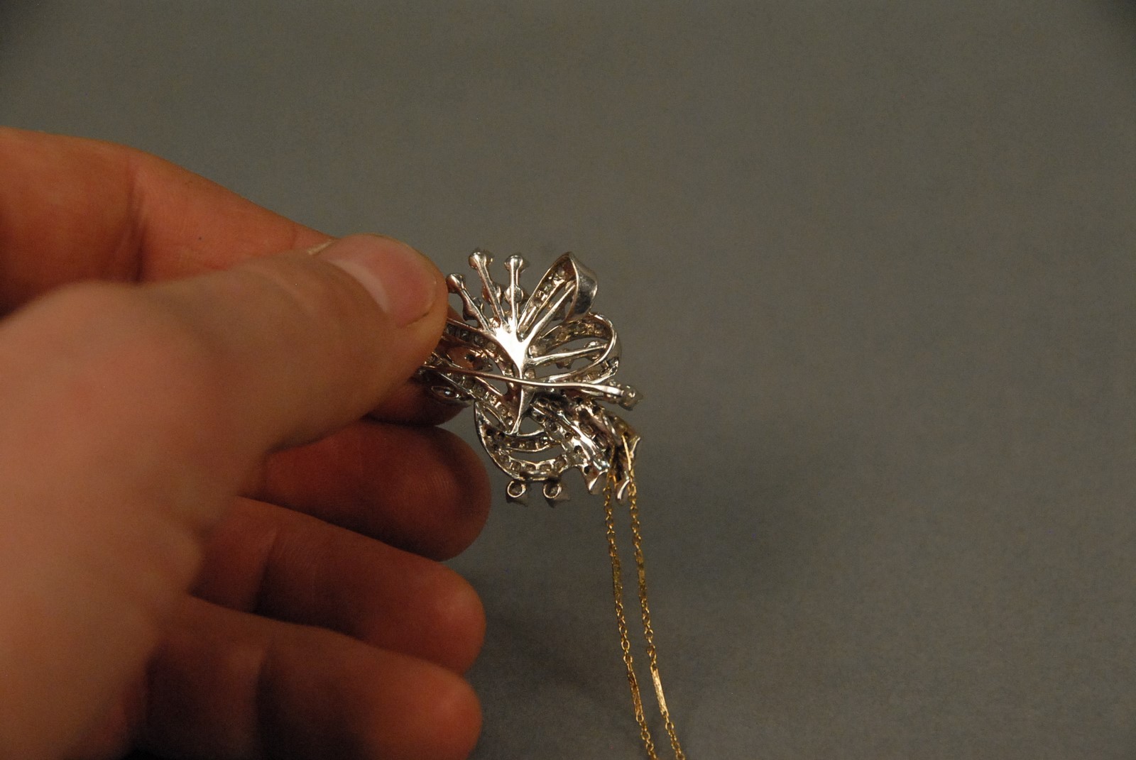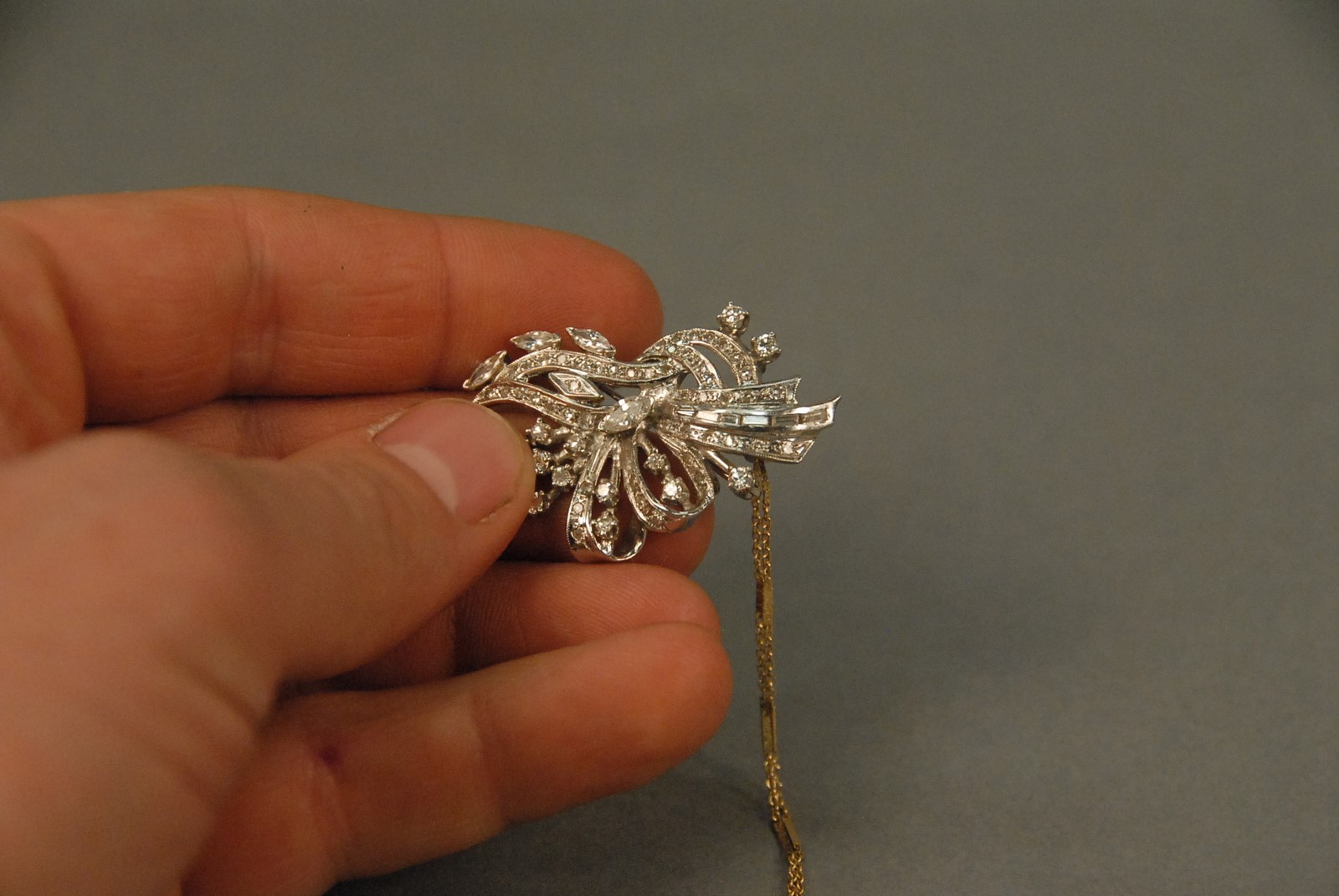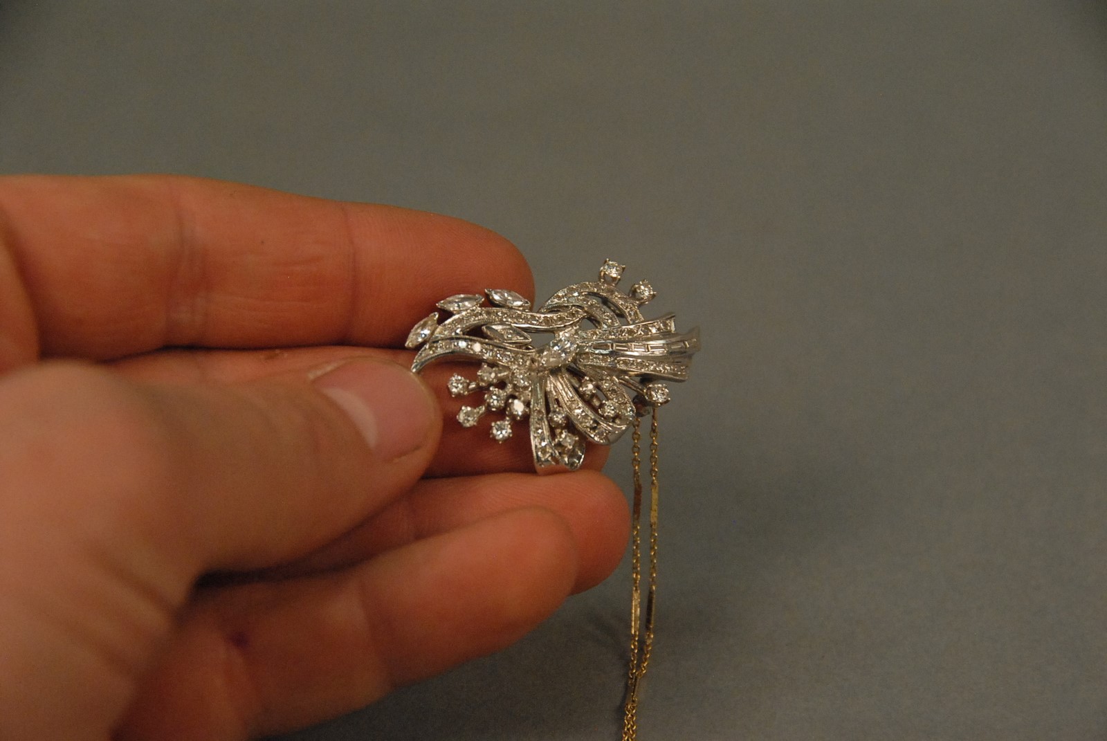Lot 69: Platinum pin/pendant set with round, marquis and baguette diamonds including center marquis diamond. total weight 9.8 grams