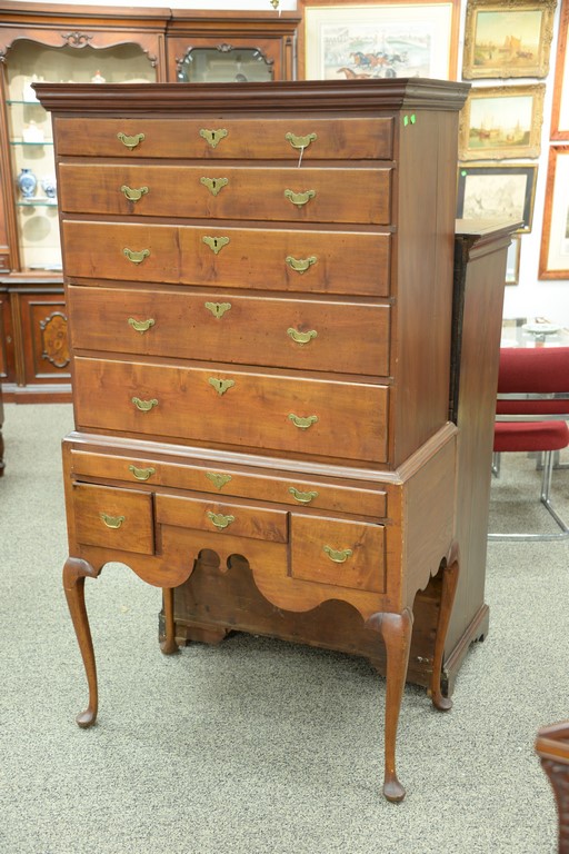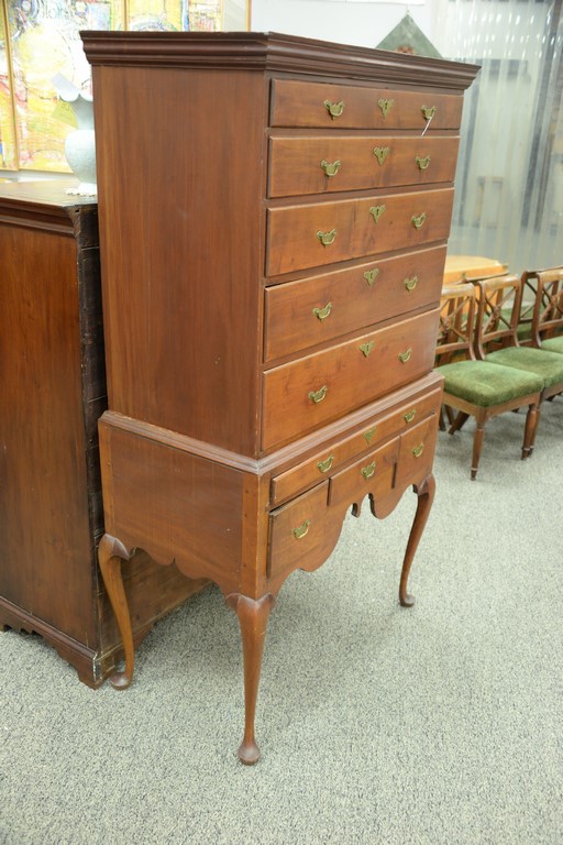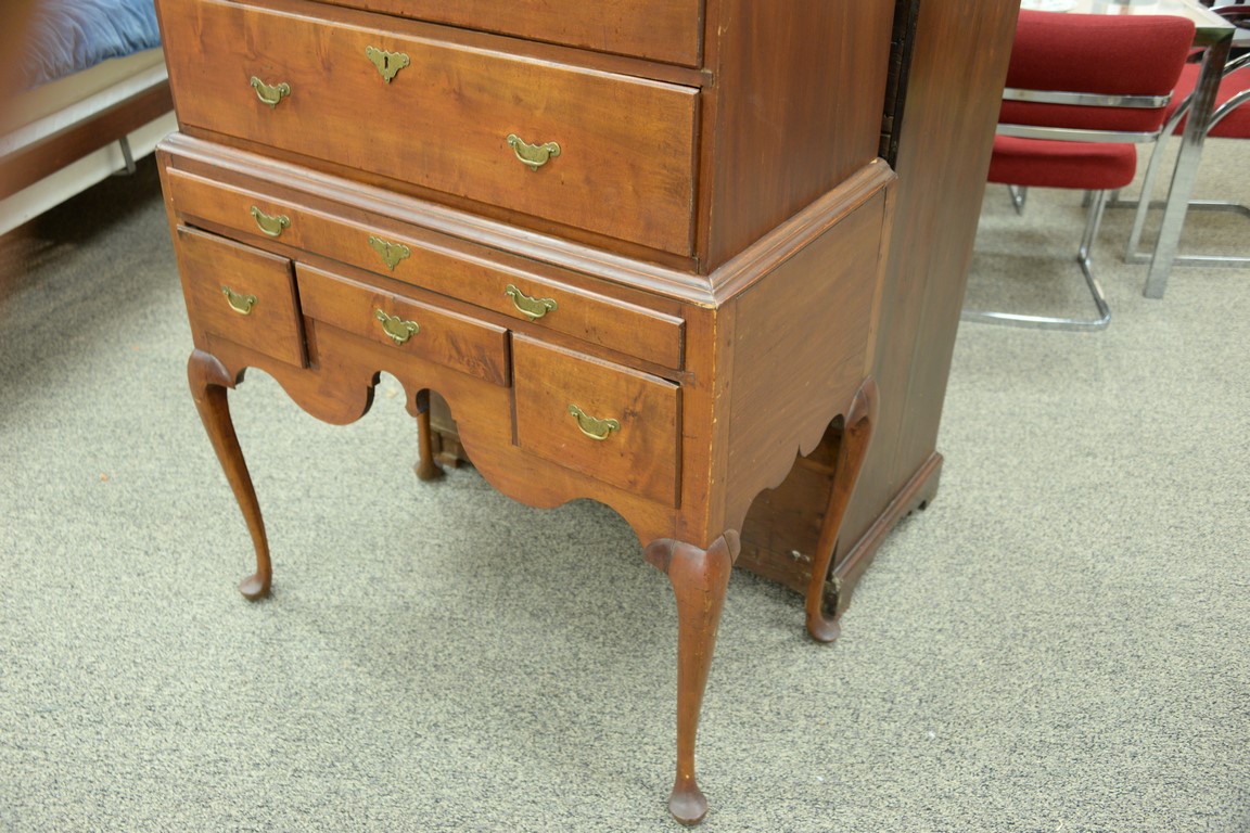 Lot 69: Queen Anne flat top highboy in two parts, upper portion with cornice molded top over five graduated drawers set on lower portion wit…