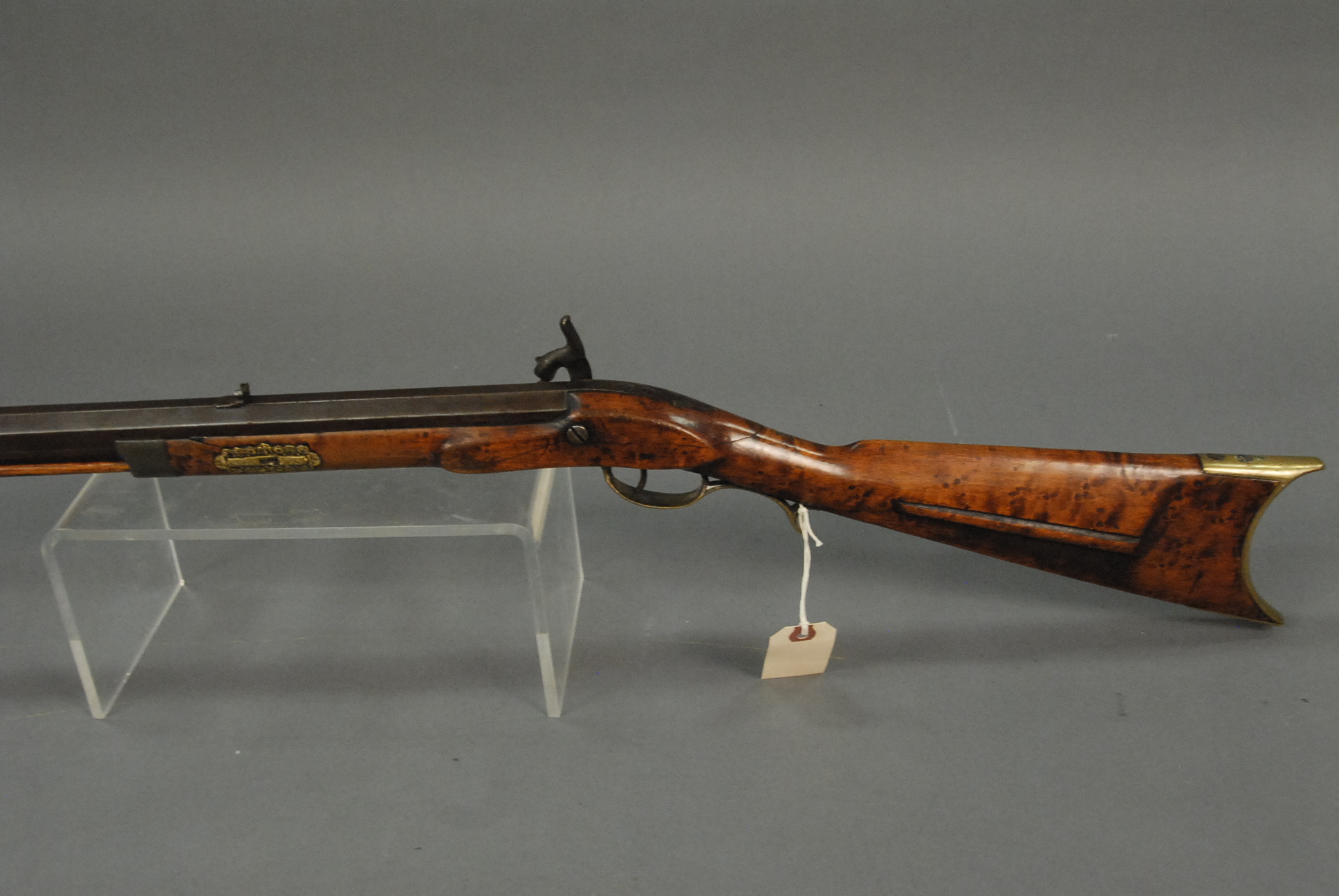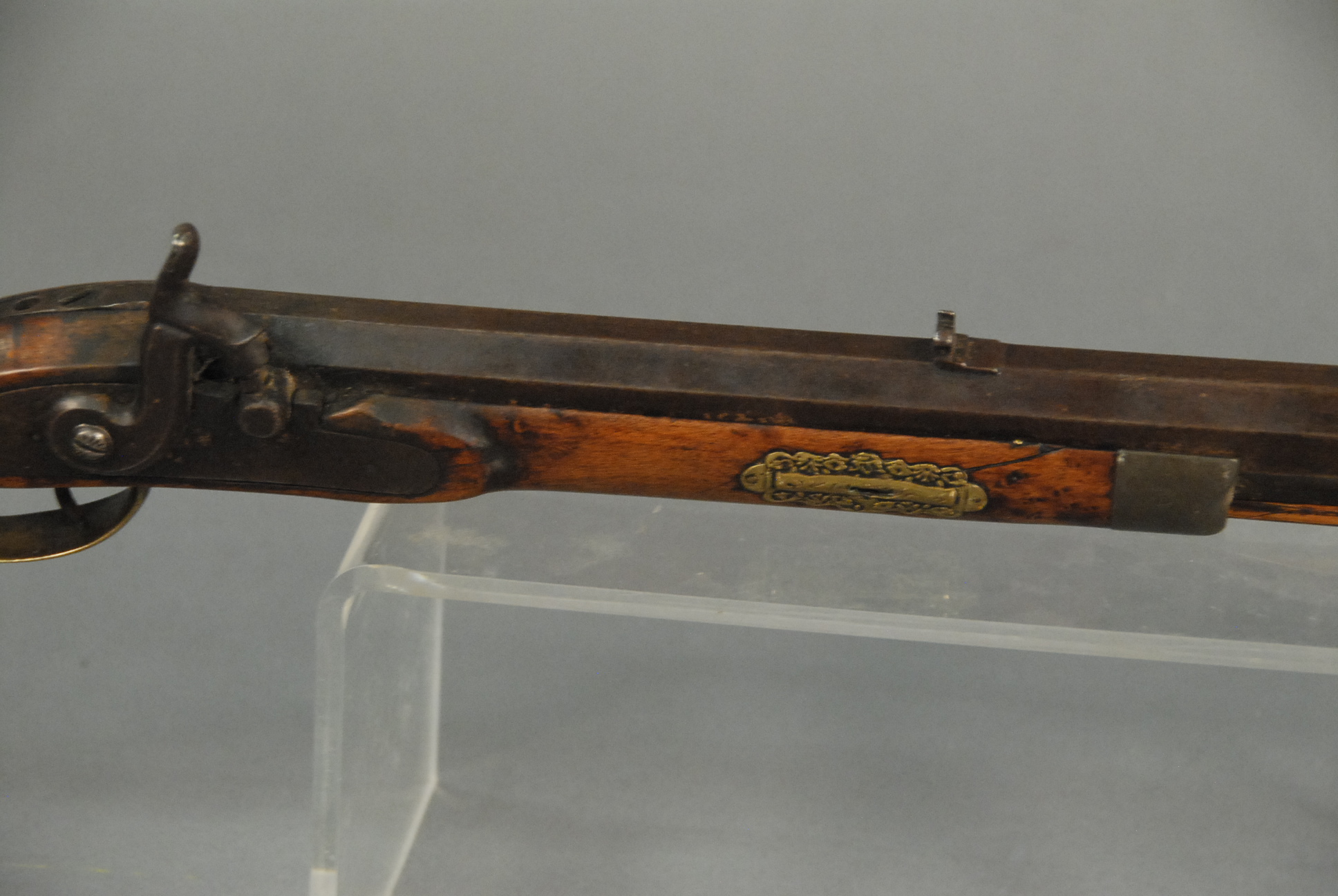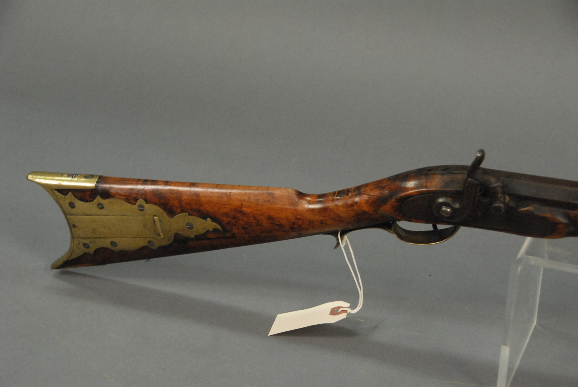 Lot 69: Short Kentucky percussion rifle having octagon barrel with maple stock and brass patch box, no visible makers mark, barrel lg. 24.
