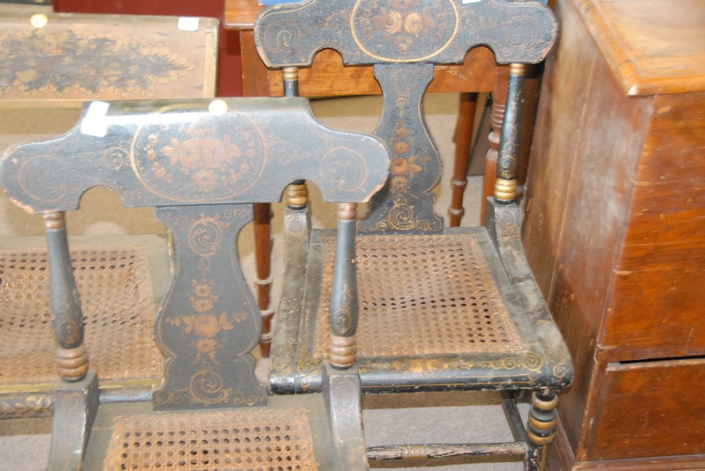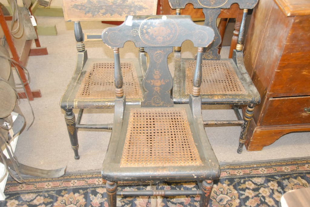Three fancy Sheraton side chairs with caned seats in original paint.