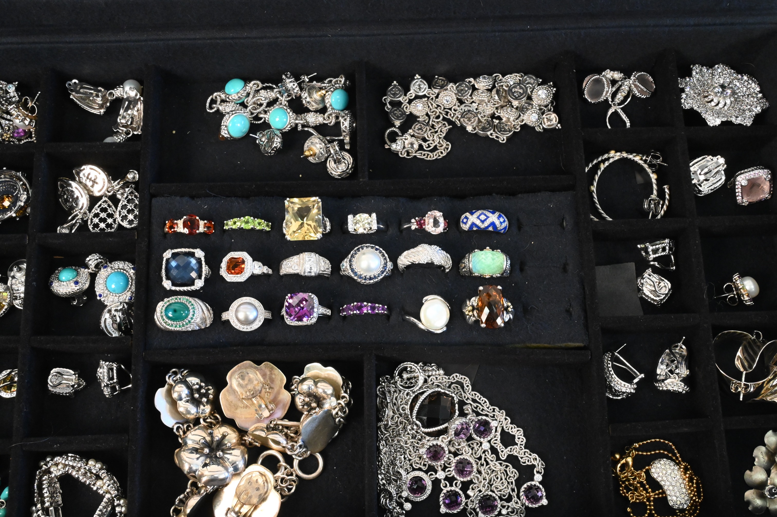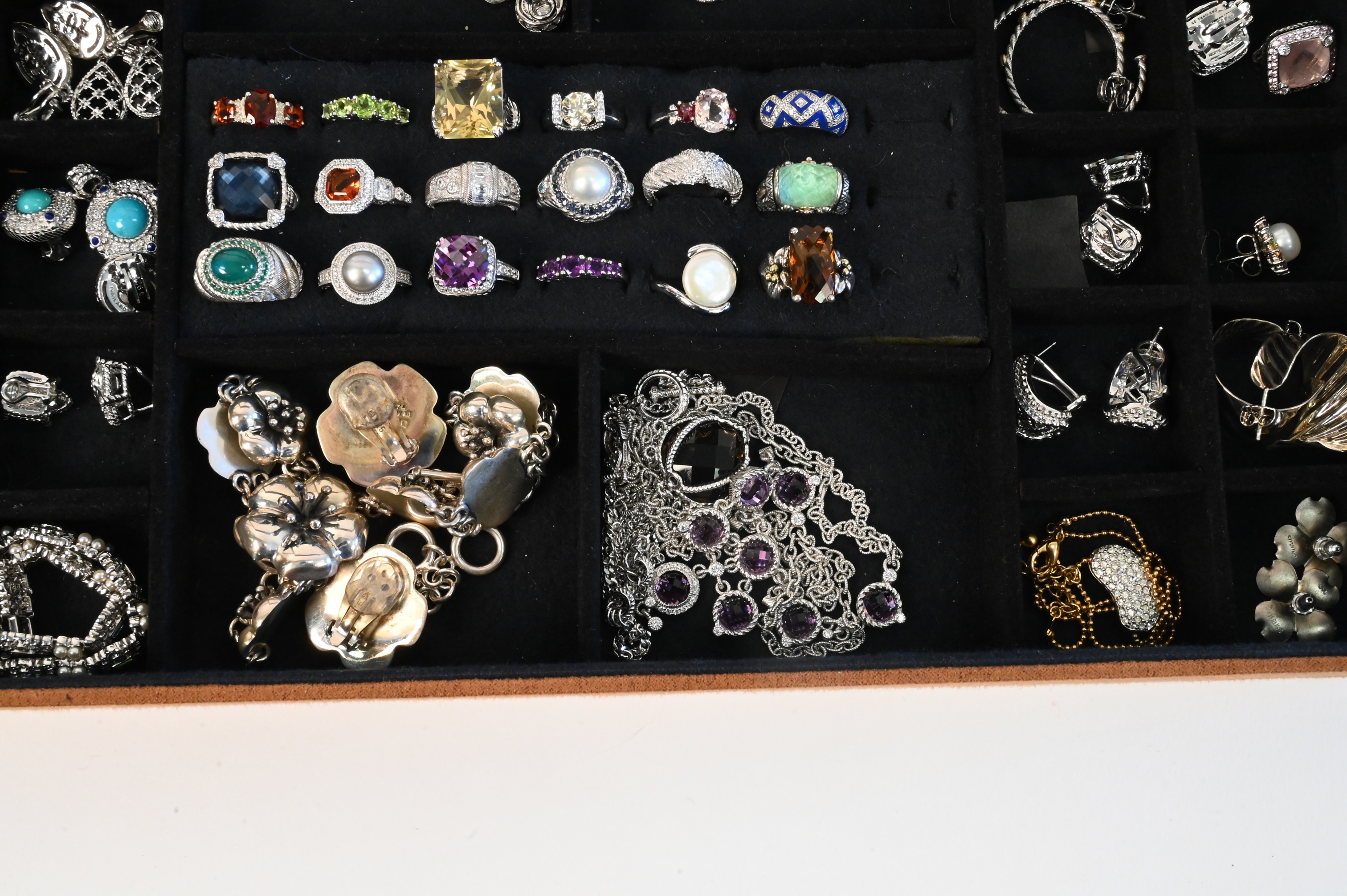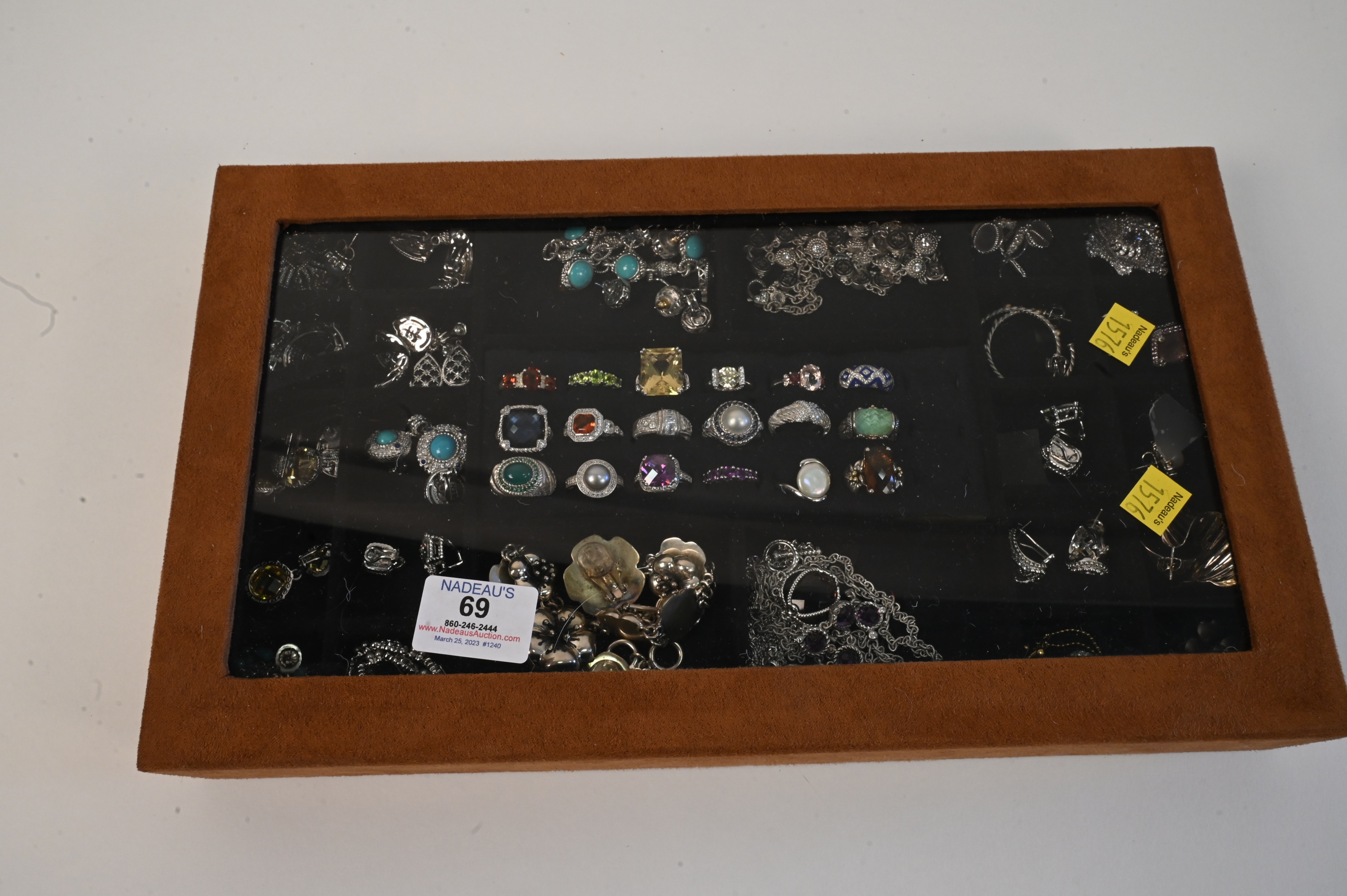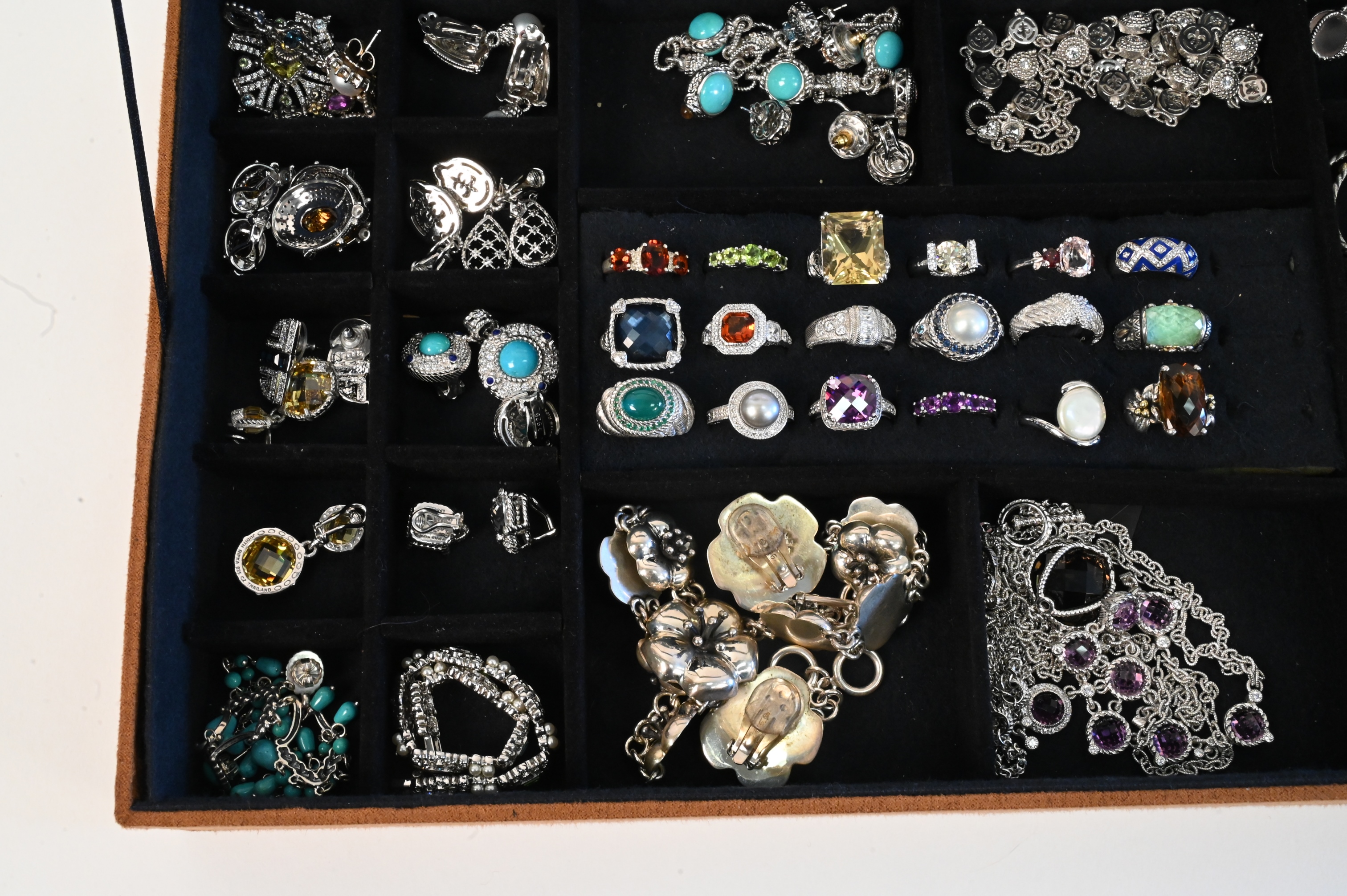 Tray Lot of Silver Jewelry, rings, earrings, necklaces, some with stones, including Judith Ripka.