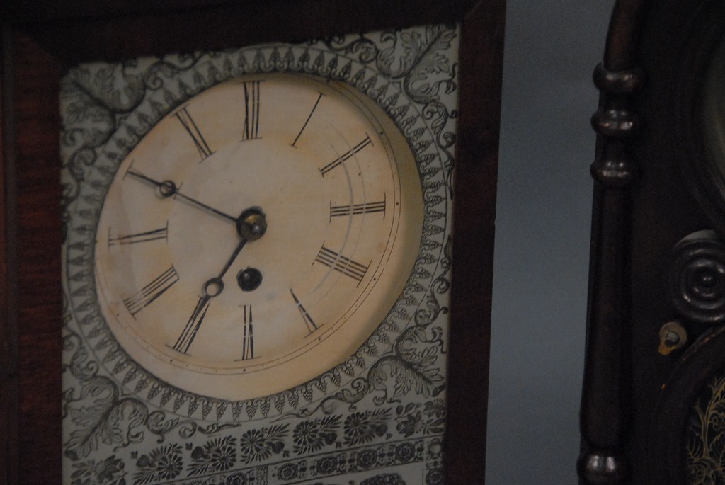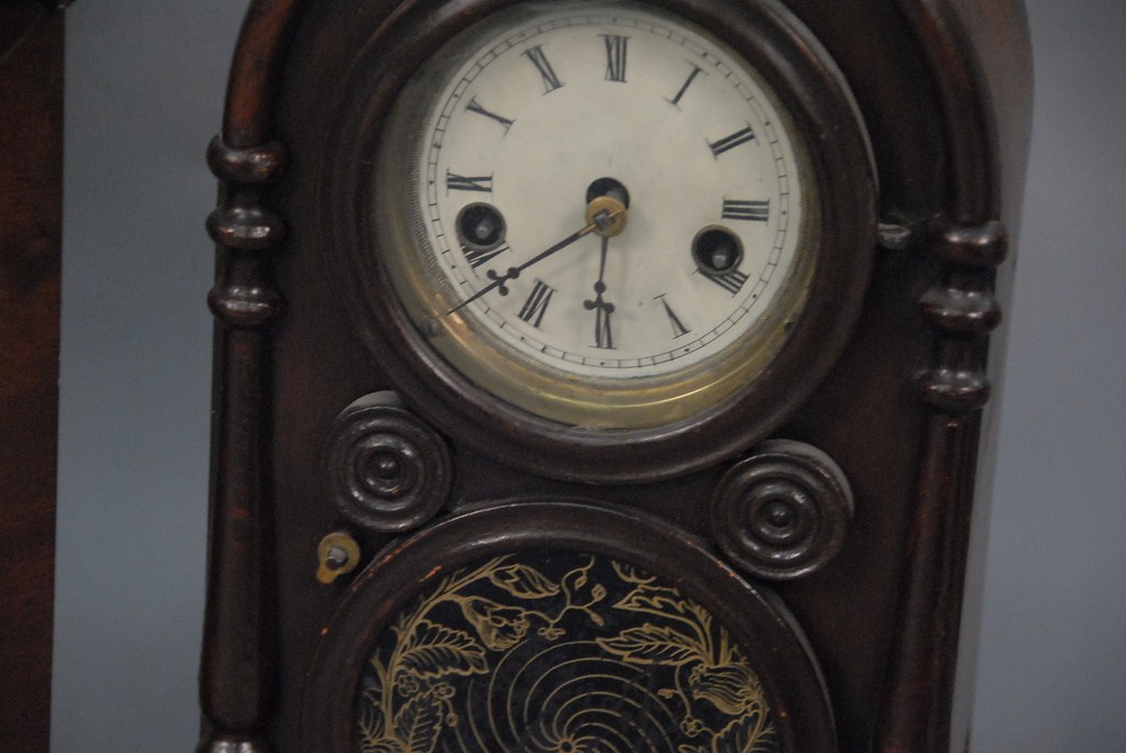 Two clocks cottage clock ht. 13 and Victorian rosewood shelf clock ht. 11.