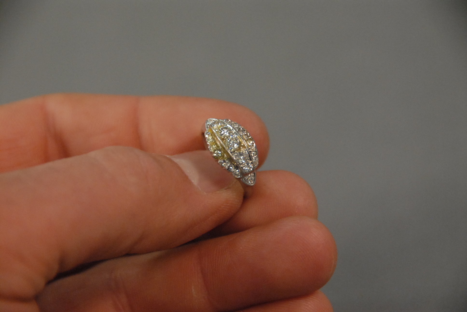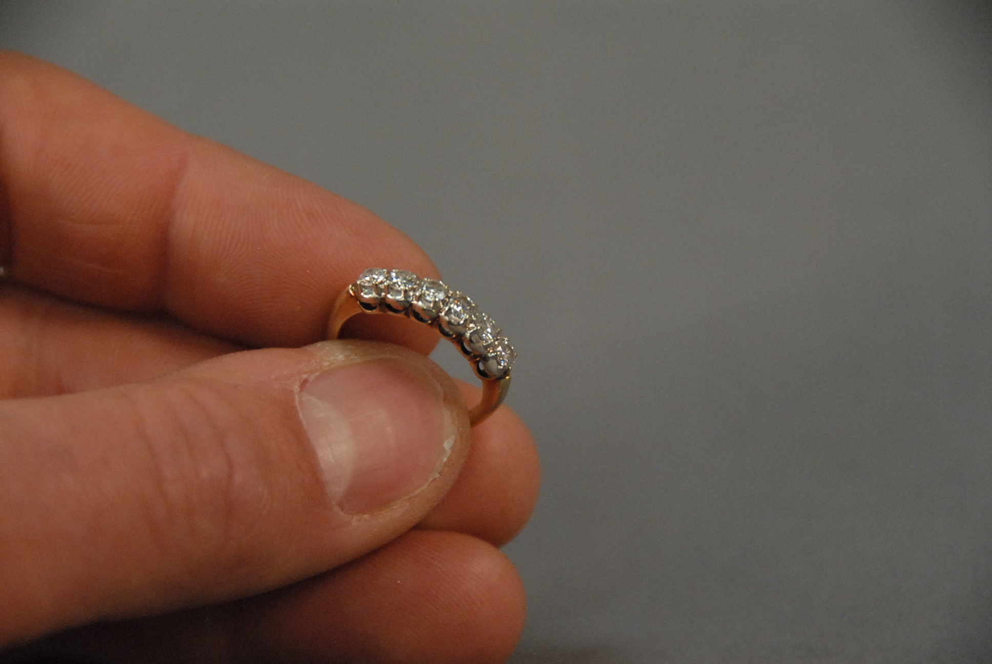 Two gold and diamond rings, one with six diamonds in line other with three rows of diamonds.