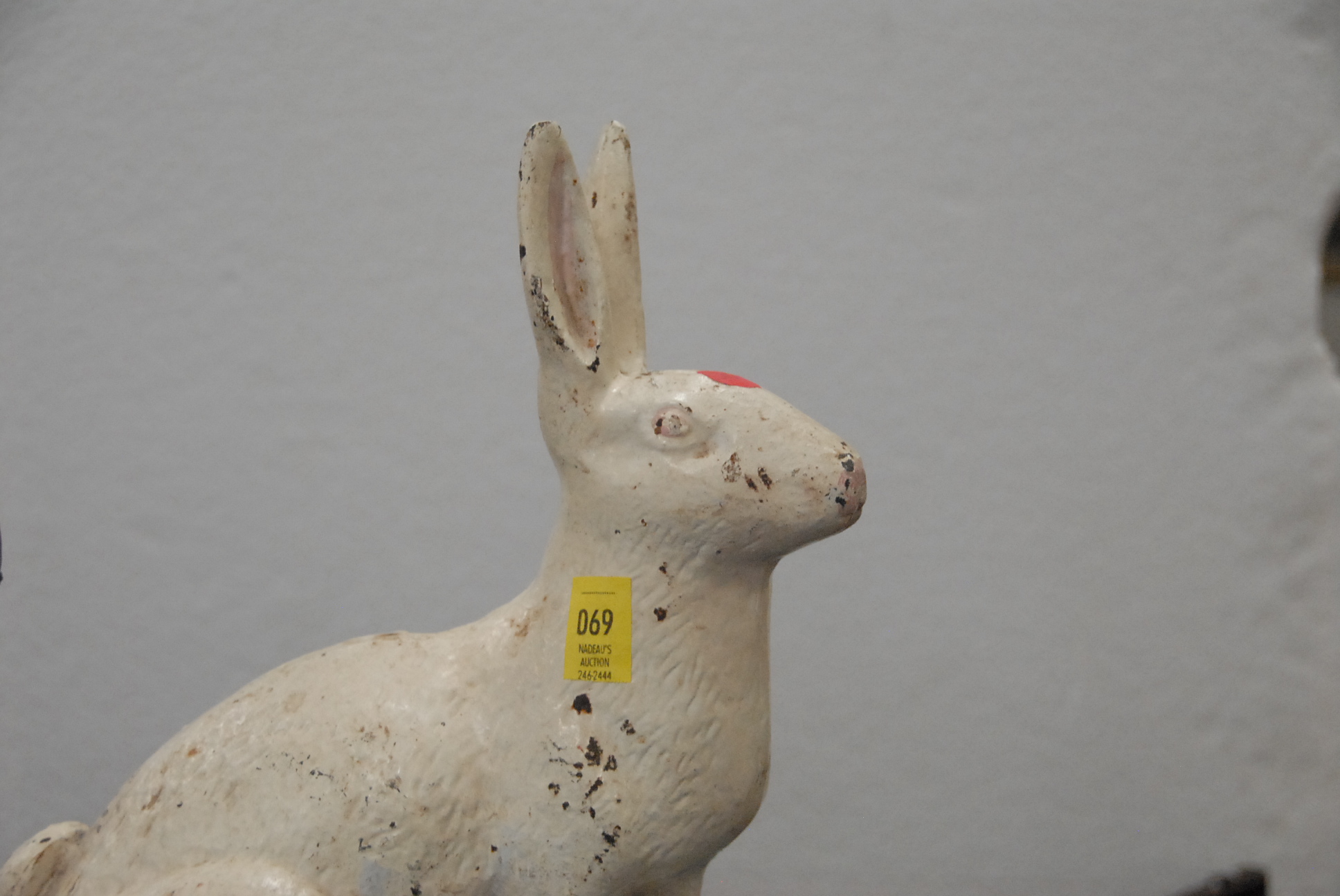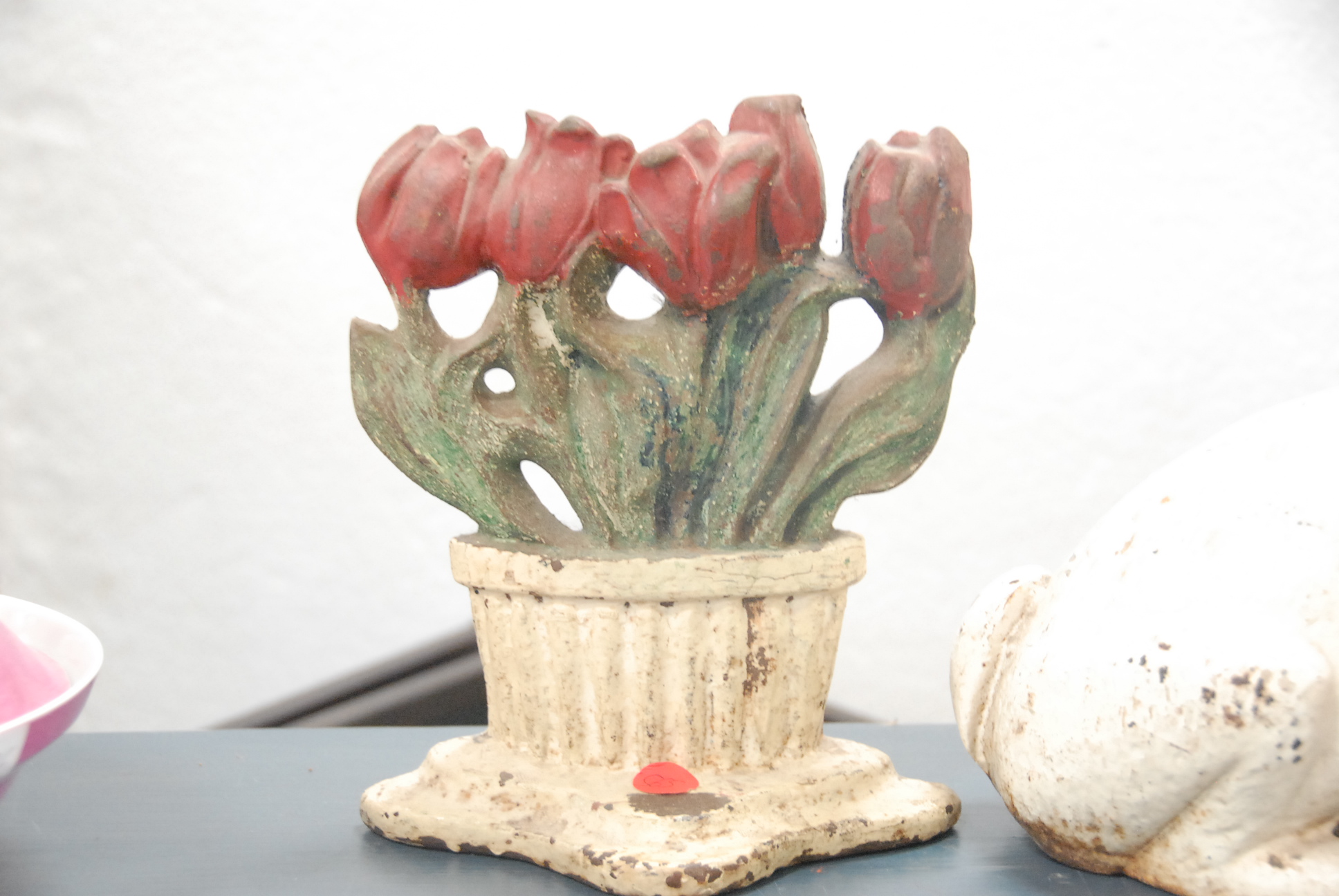 Two iron door stops including flowers and rabbit.