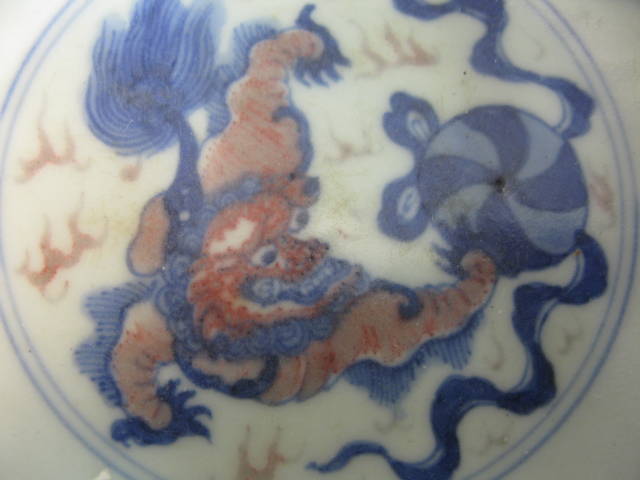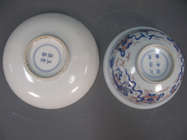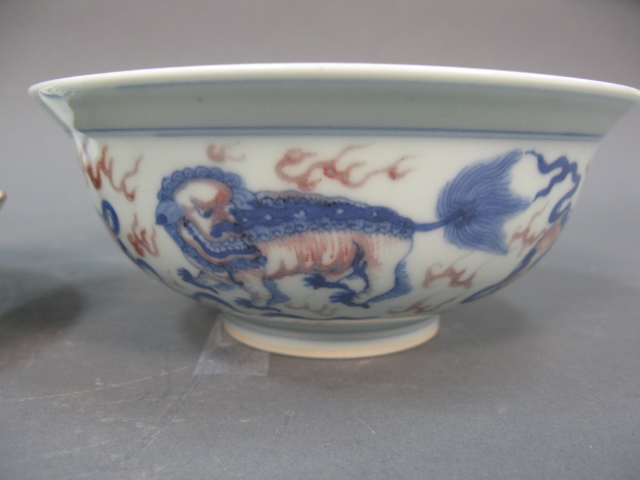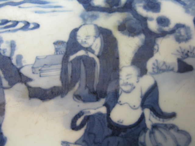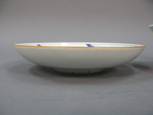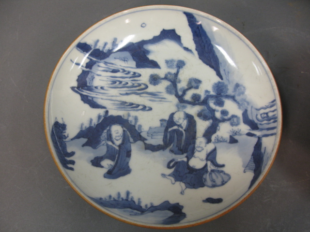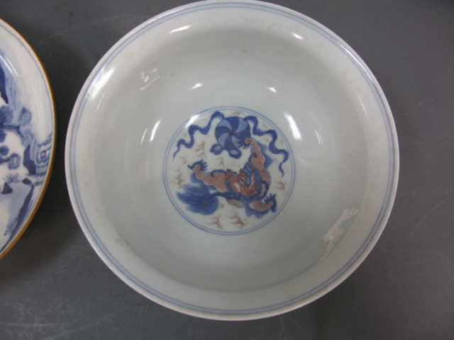 Two piece Oriental porcelain lot to include a blue and white plate with three figures in a landscape and dog bowl having three painted foo-dogs on outside and one foo-dog in center.