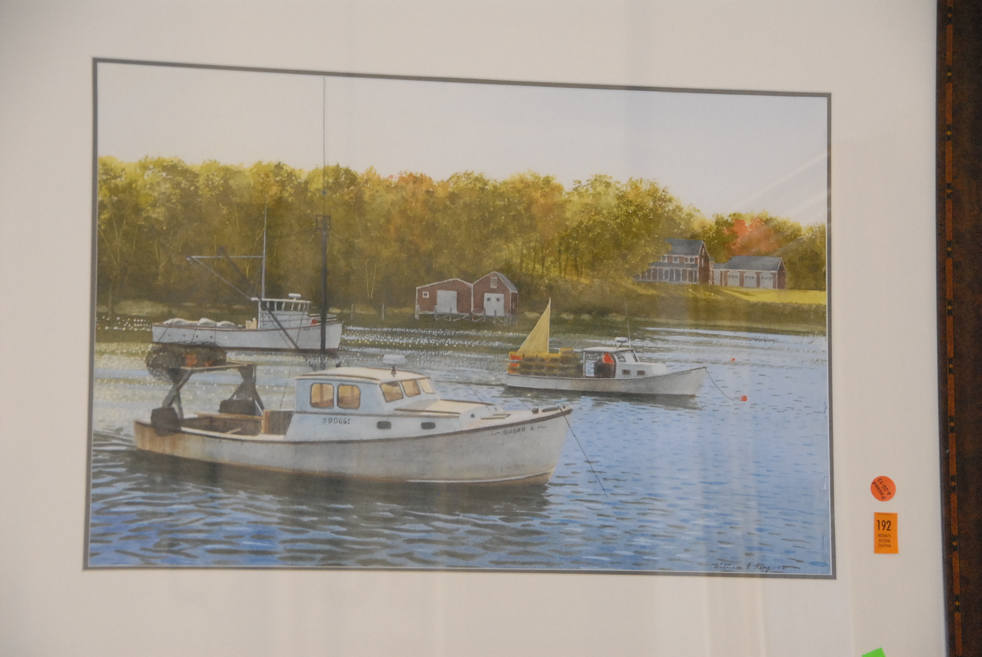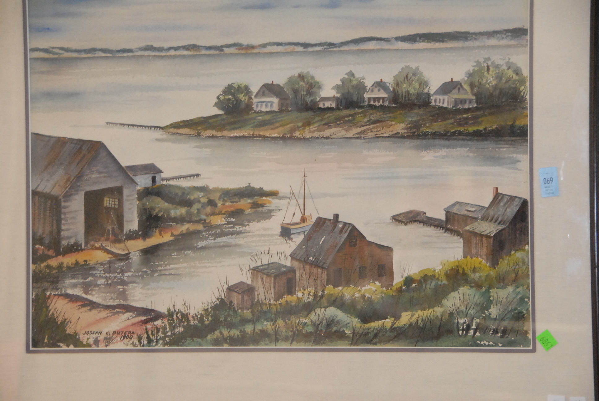 Lot 69: Two watercolors, one of lobster boats and harbor signed William King 14 x 21 and other of harbor scene signed Joseph Butera 17 x…