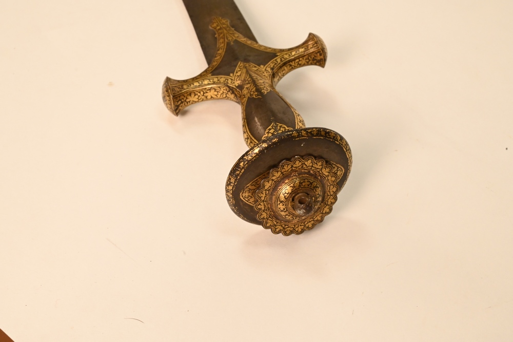 Mughal Indian Tulwar Sword, having incised inlaid gilt handle, probably 19th century, curved blade, length 38 inches.
