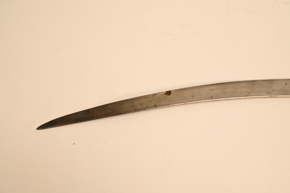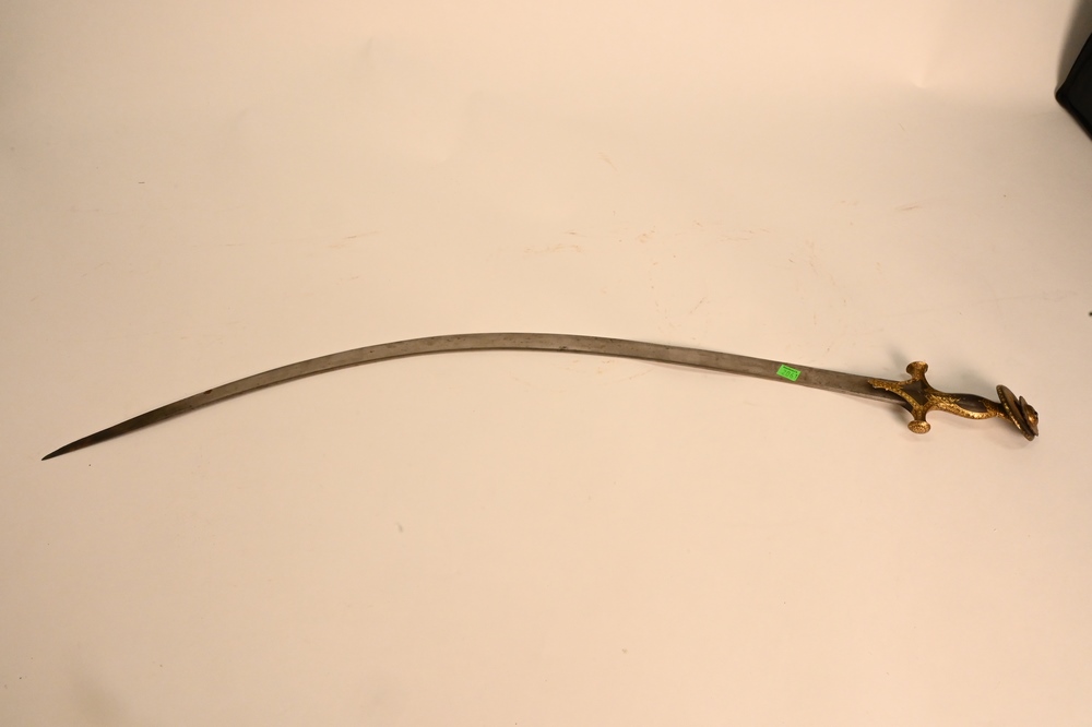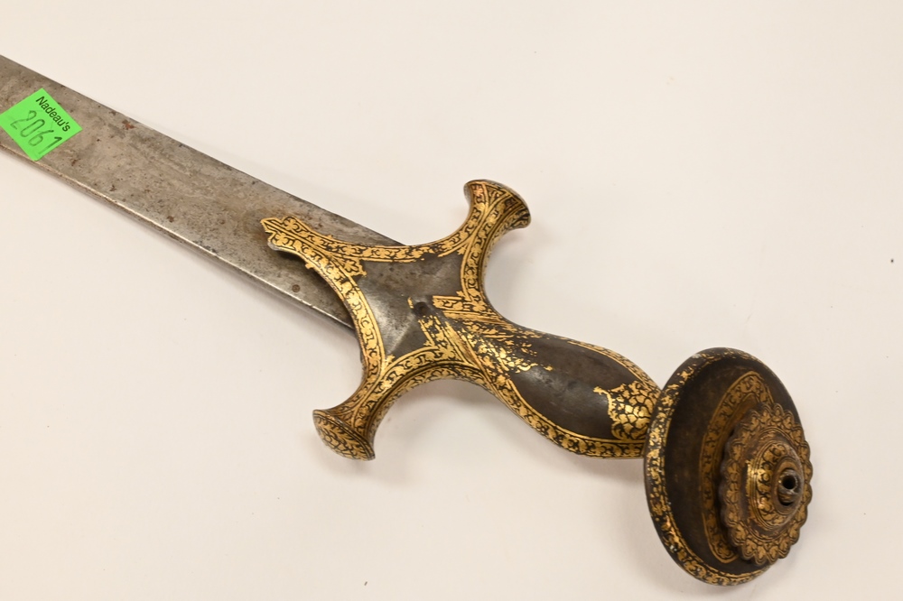 Lot 690: Mughal Indian Tulwar Sword, having incised inlaid gilt handle, probably 19th century, curved blade, length 38 inches.