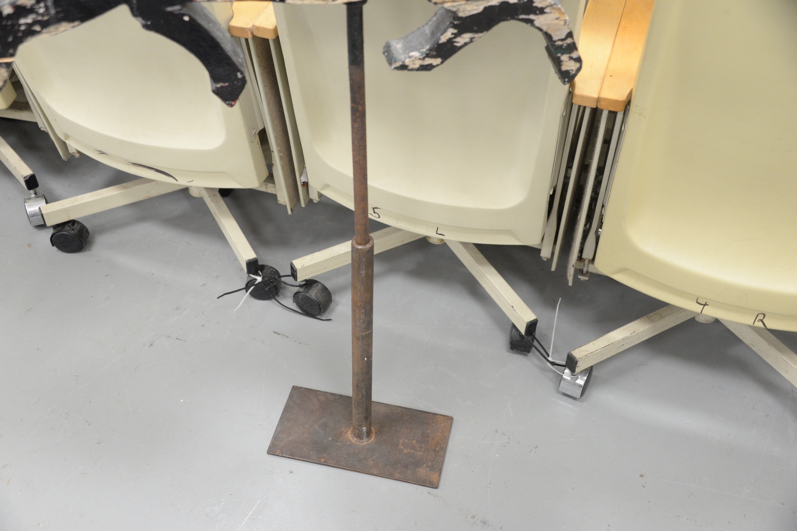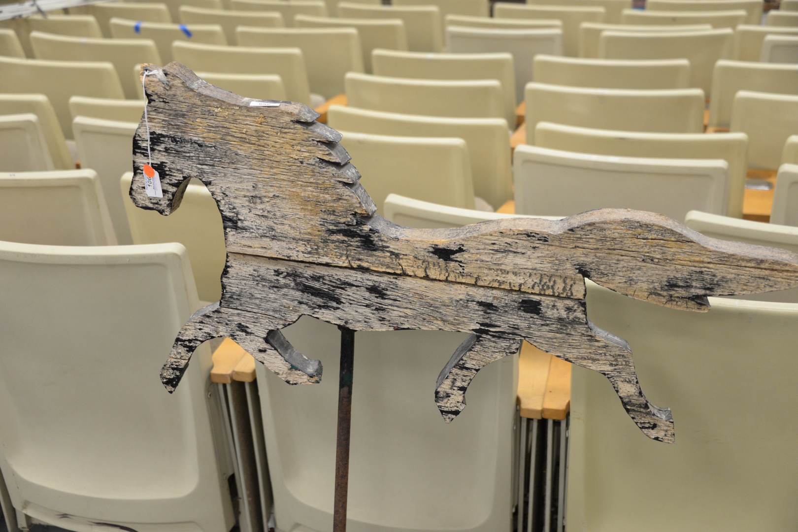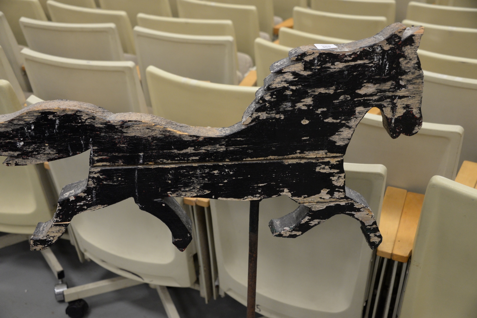 Lot 690: Primitive Wood Horse Weathervane crudely carved in trotting position and painted black, mounted on an iron stand, length 40 inches.