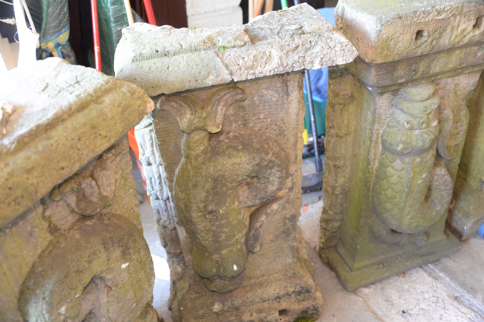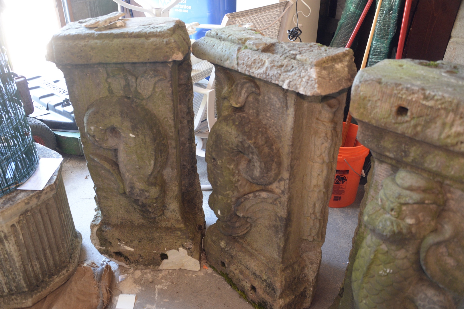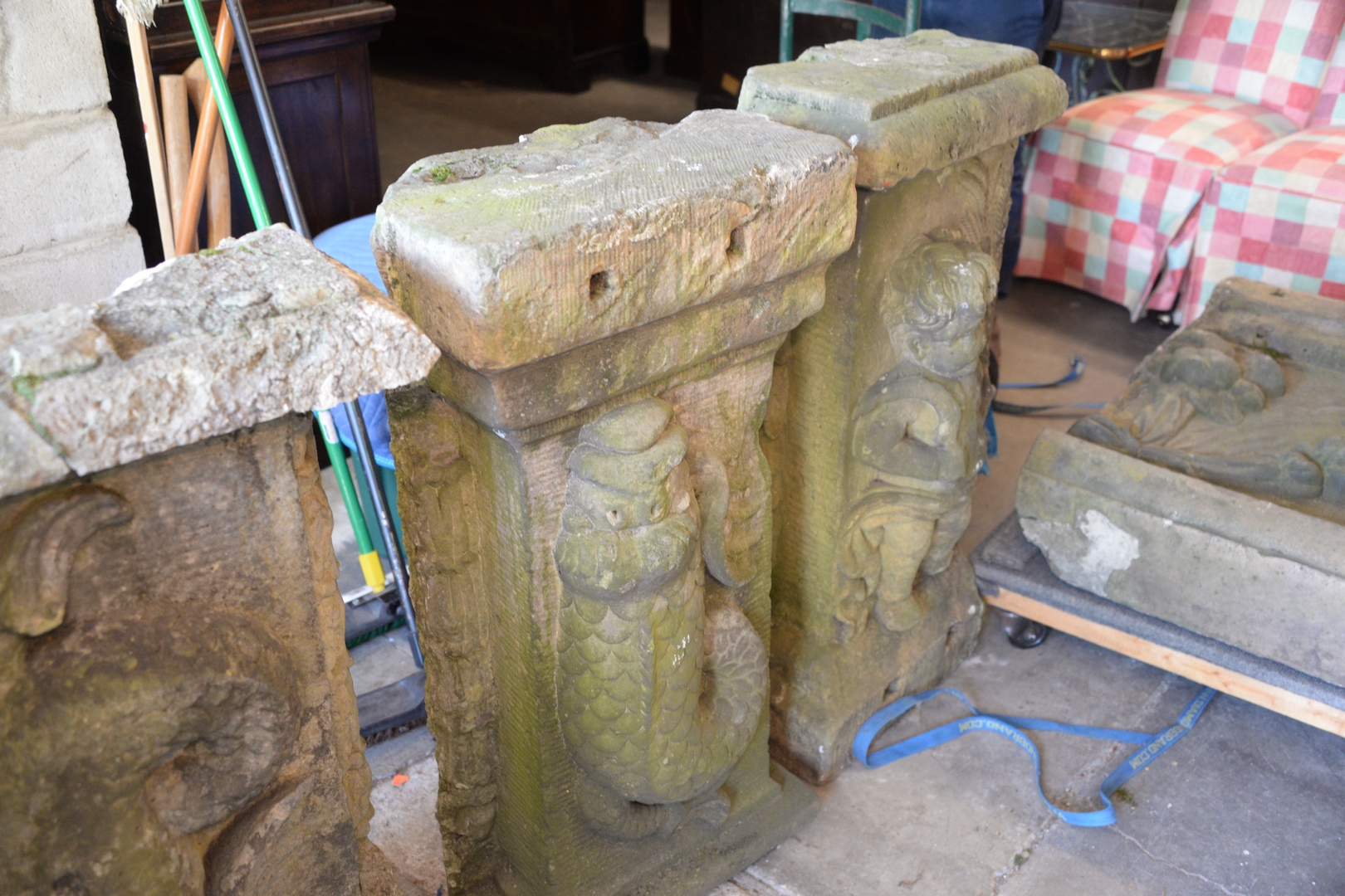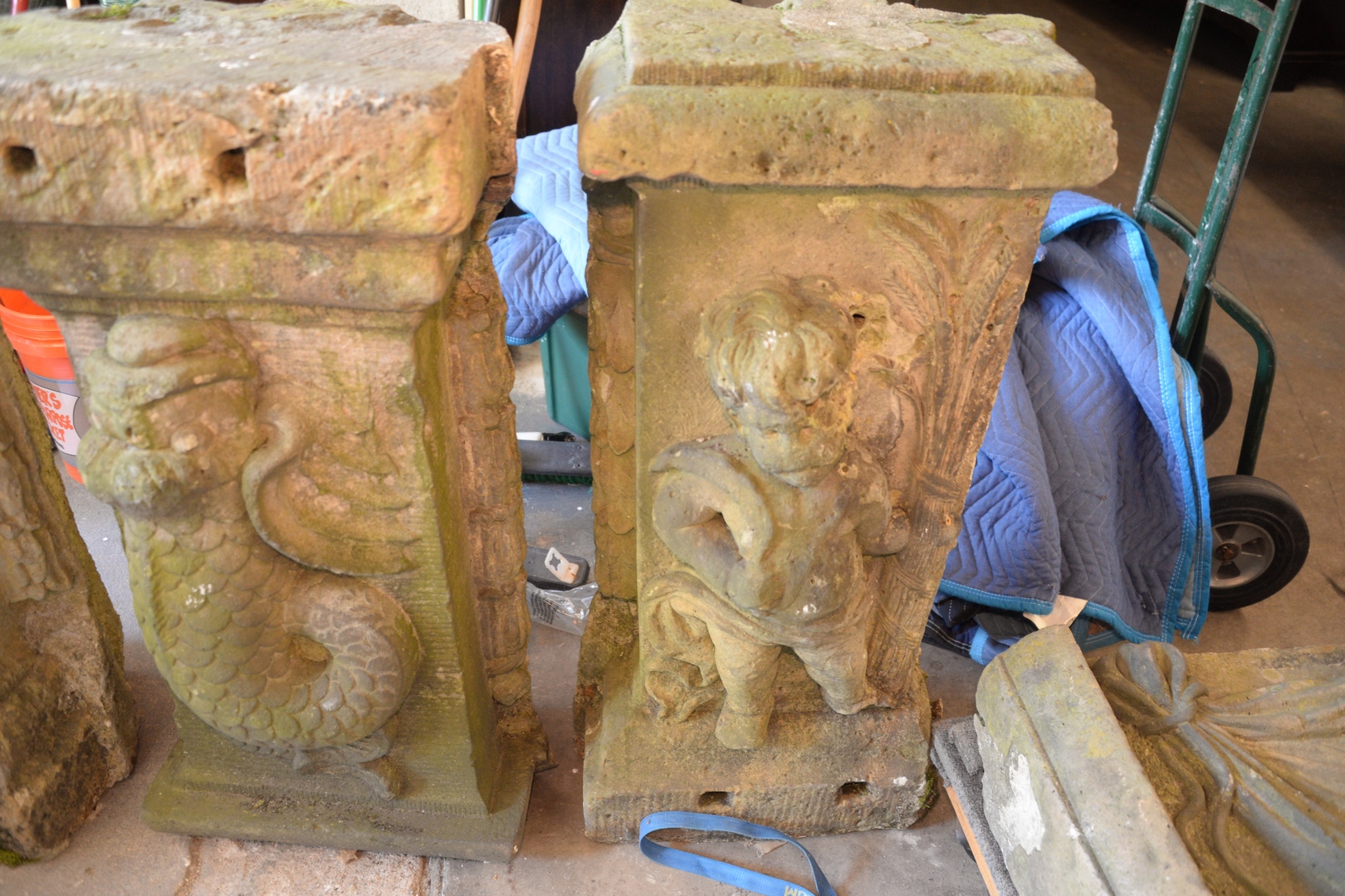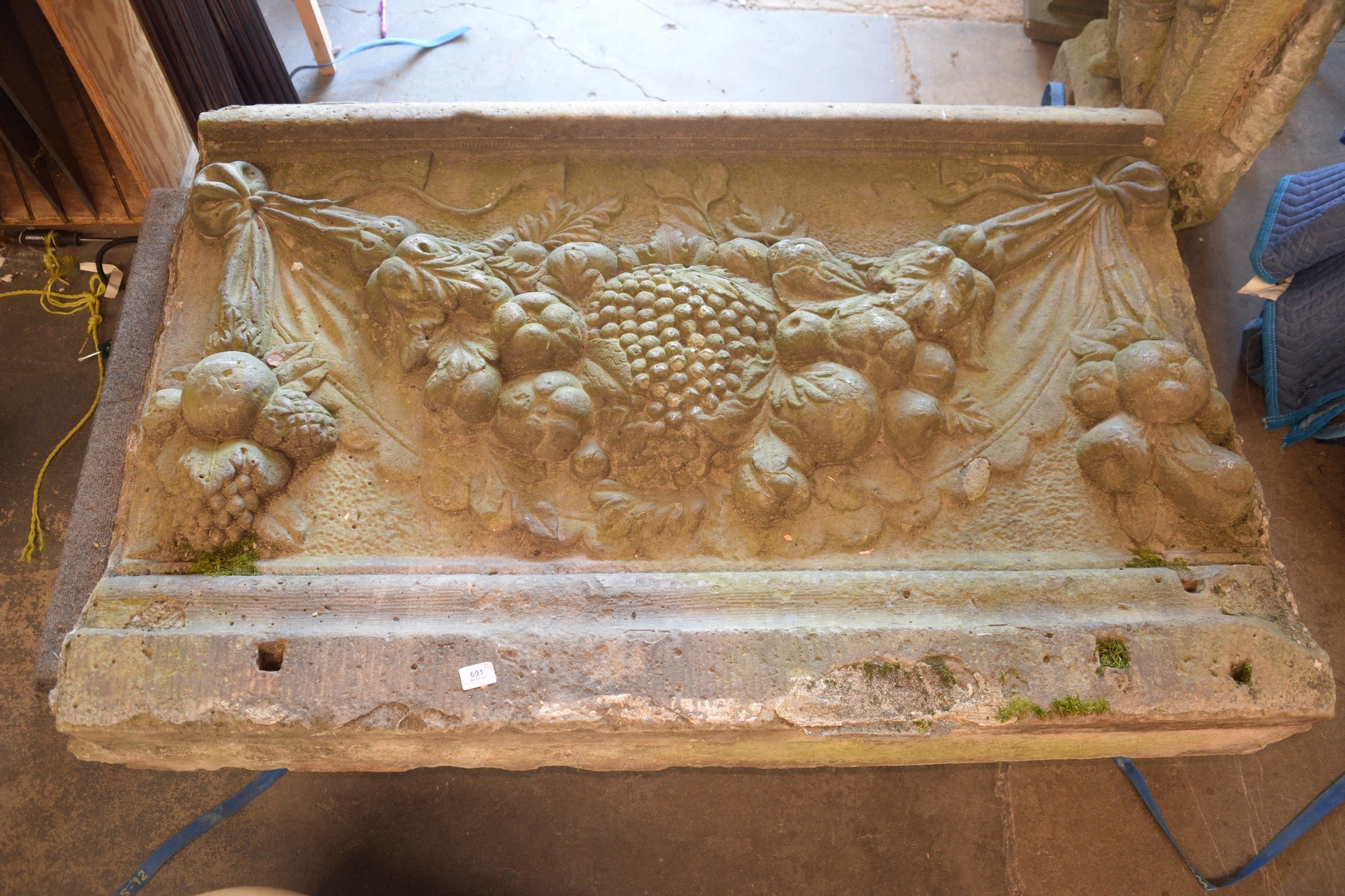 Lot 691: Five Part Limestone Garden Wall, having dolphin and putti ends, wall with fruit, 18th century or earlier, extremely heavy, several…