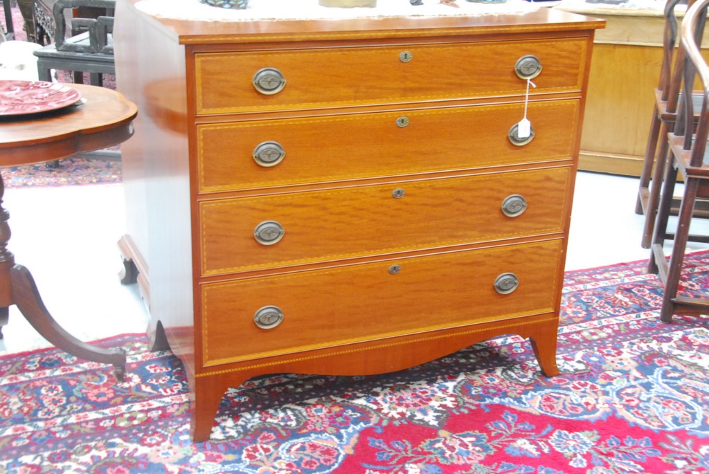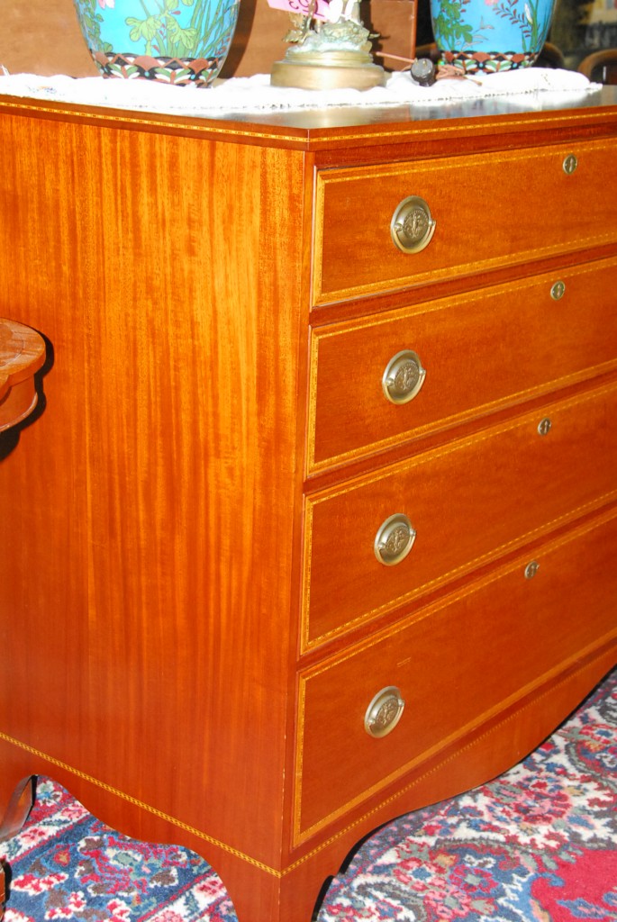 Lot 691: Two piece lot Margolis mahogany Federal style chest of four graduated drawers having inlaid top and drawers all set on ogee feet, s…