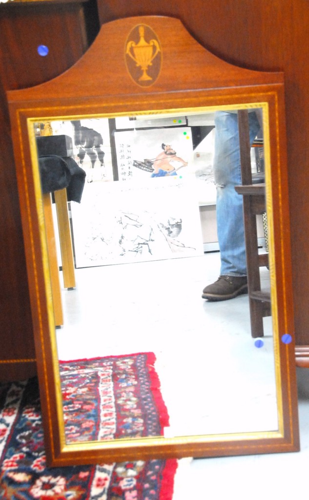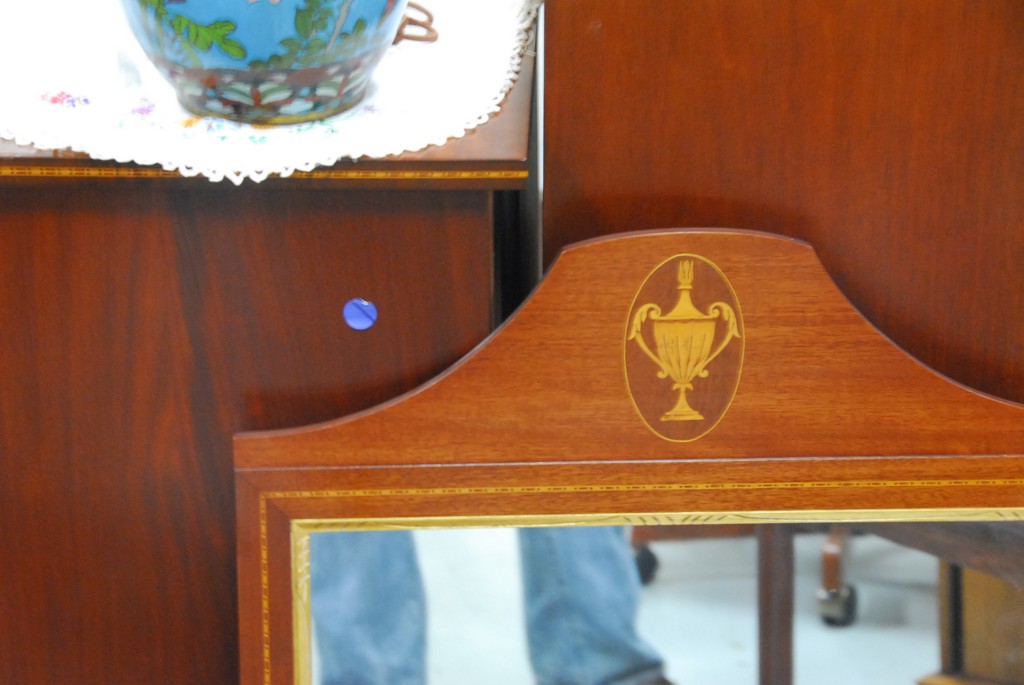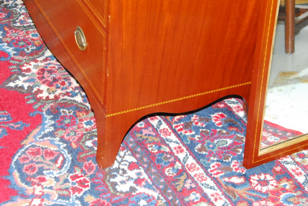 Two piece lot Margolis mahogany Federal style chest of four graduated drawers having inlaid top and drawers all set on ogee feet, stamped on back in excellent condition, made of figured mahogany in excellent condition and mirror. – ht. 37in. wd. 40in.