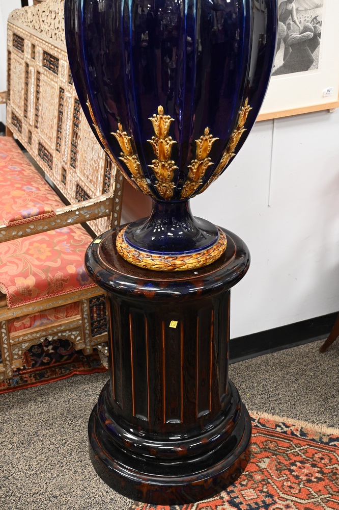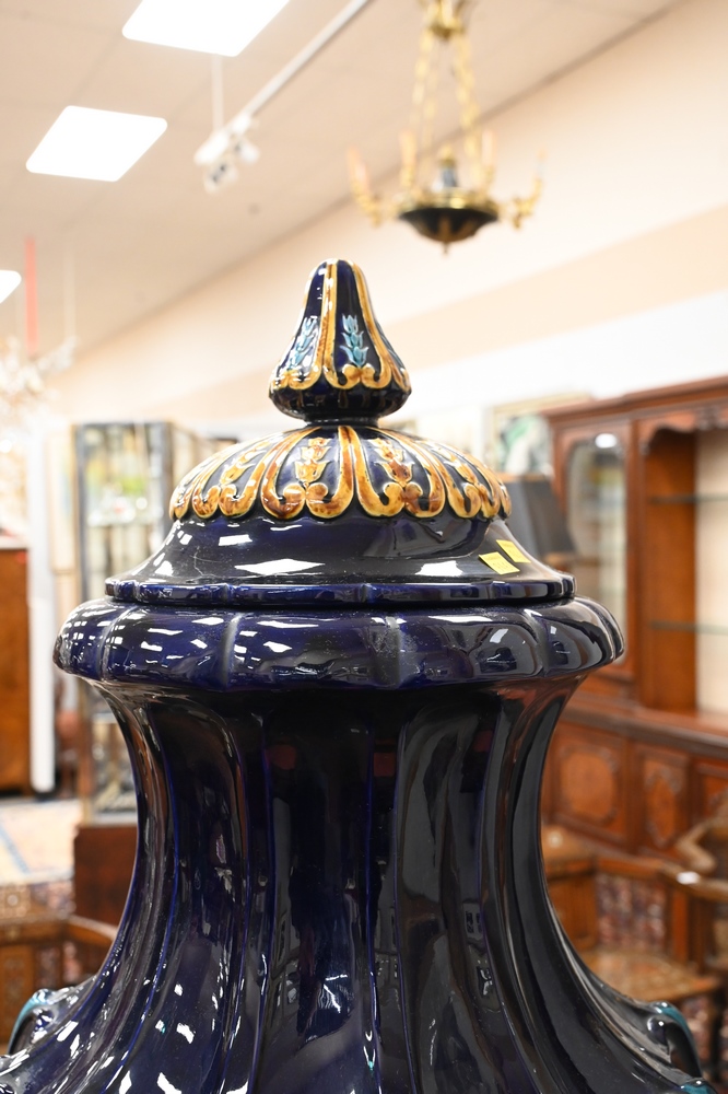 Lot 692: Monumental Majolica Urn, having cover, on pedestal, cobalt blue and tan with ribbed sides on circular base with fluted sides, robin …