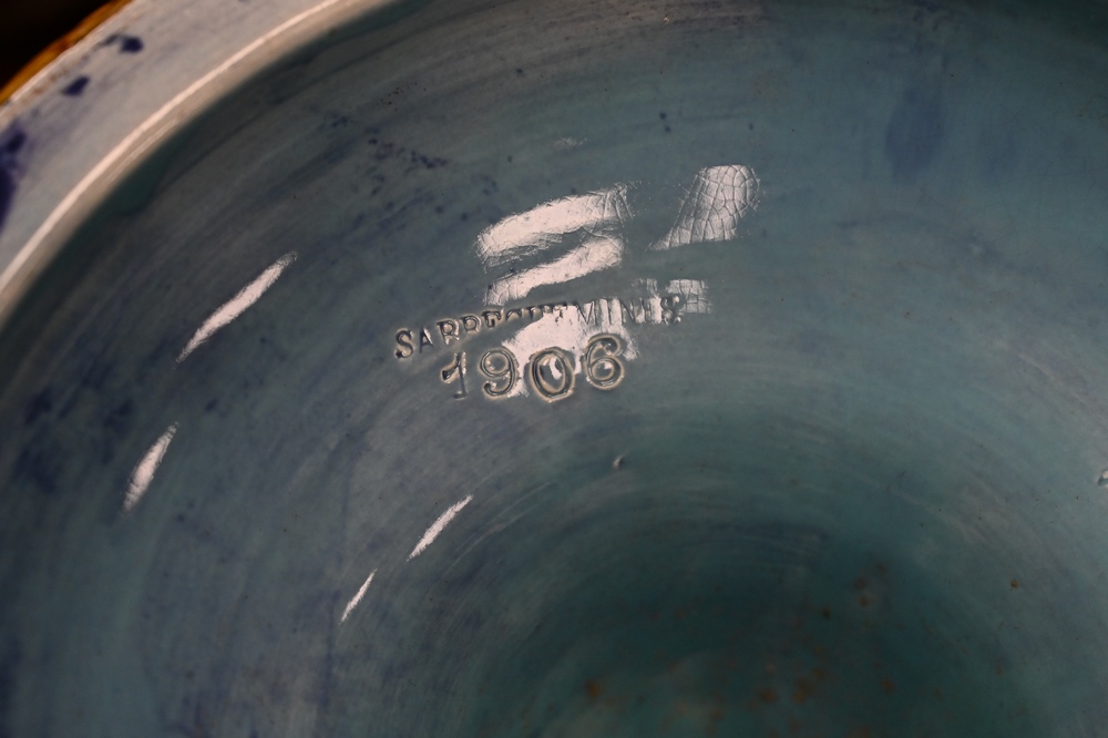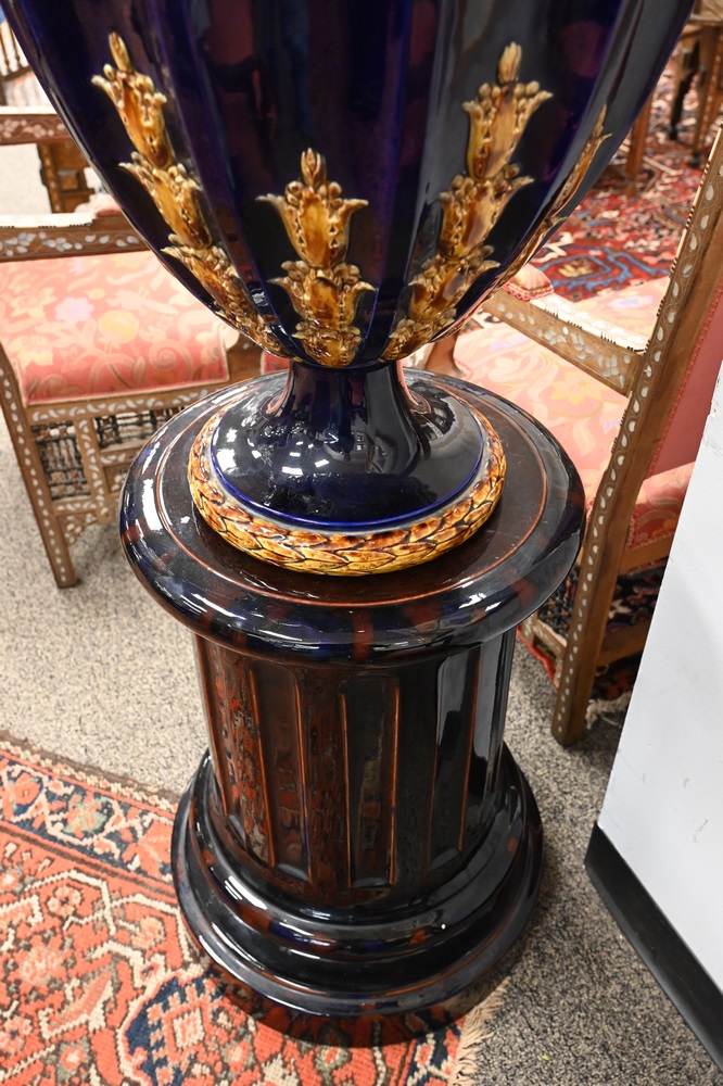 Monumental Majolica Urn, having cover, on pedestal, cobalt blue and tan with ribbed sides on circular base with fluted sides, robin egg blue glazed interior, signed on bottom SA Brechemines 1906, height of urn 45 inches, pedestal length 26 1/2 inches.