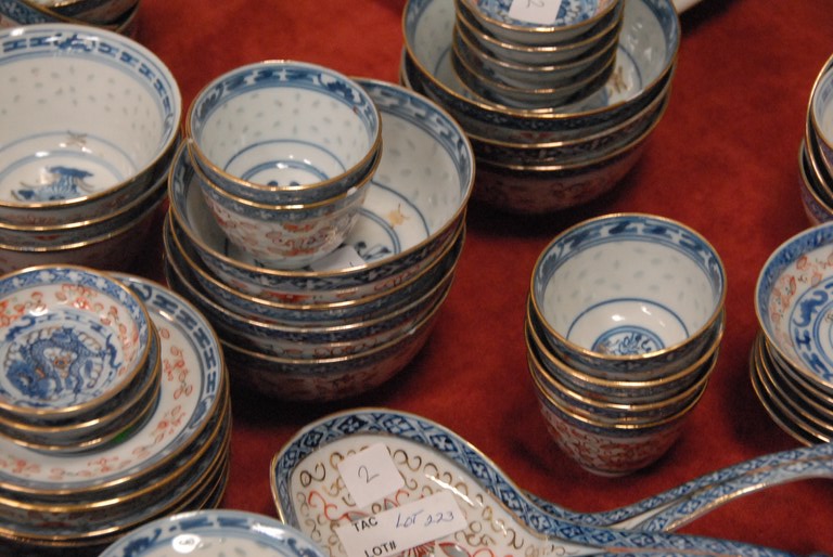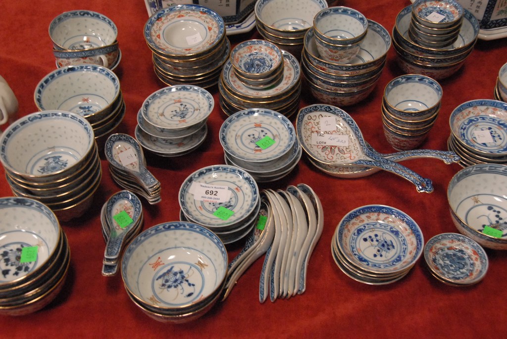 Lot 692: Oriental porcelain five claw dragon china set to include soup bowls, cups, saucers, nut dishes, etc.