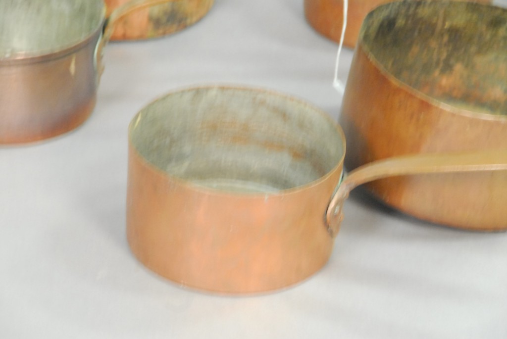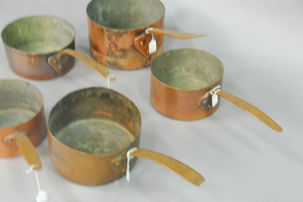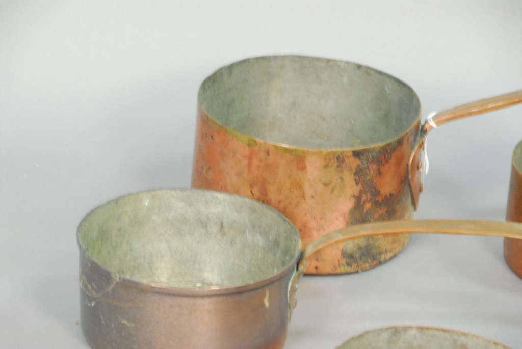 Lot of five early copper pots. – dia. 7 1/2in. – 9in.