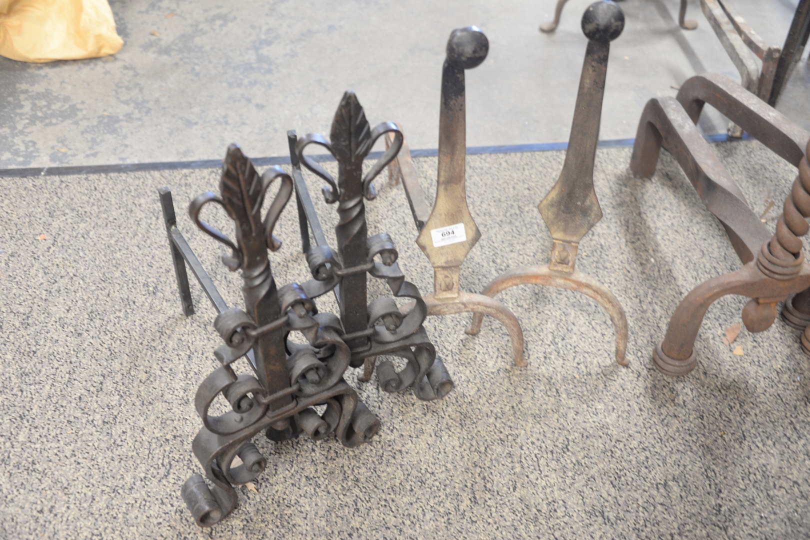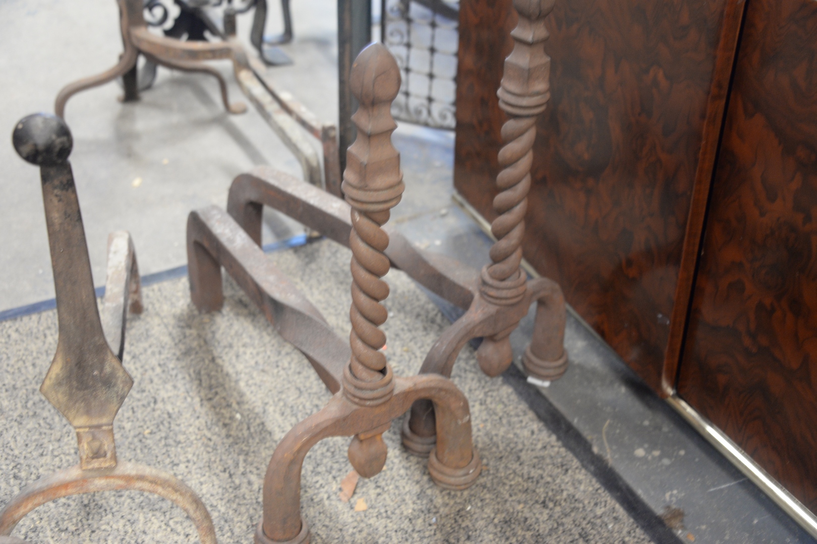 Three Pairs of Iron Andirons, along with two fire screens, heights 18, 20 and 20 inches.