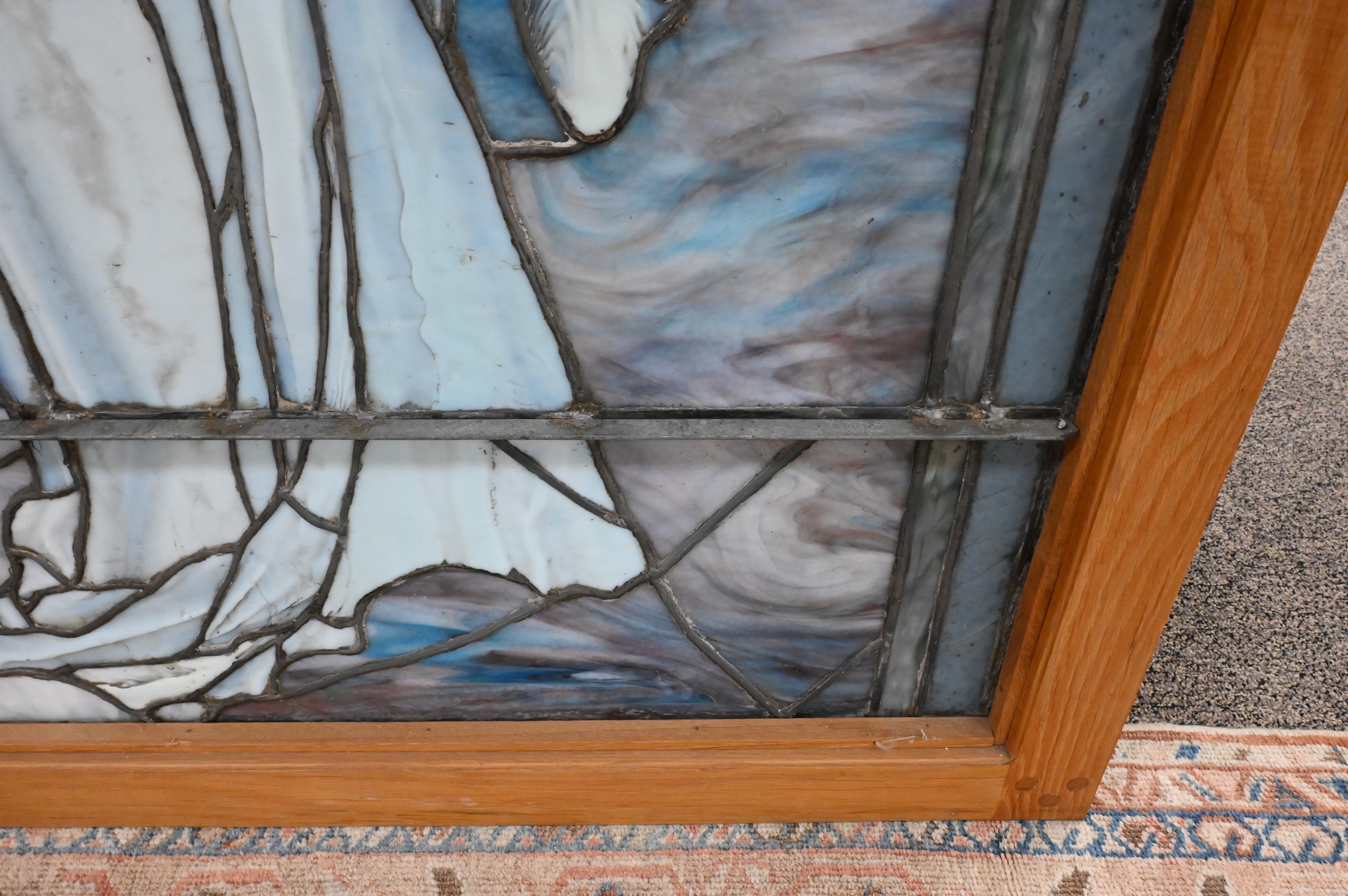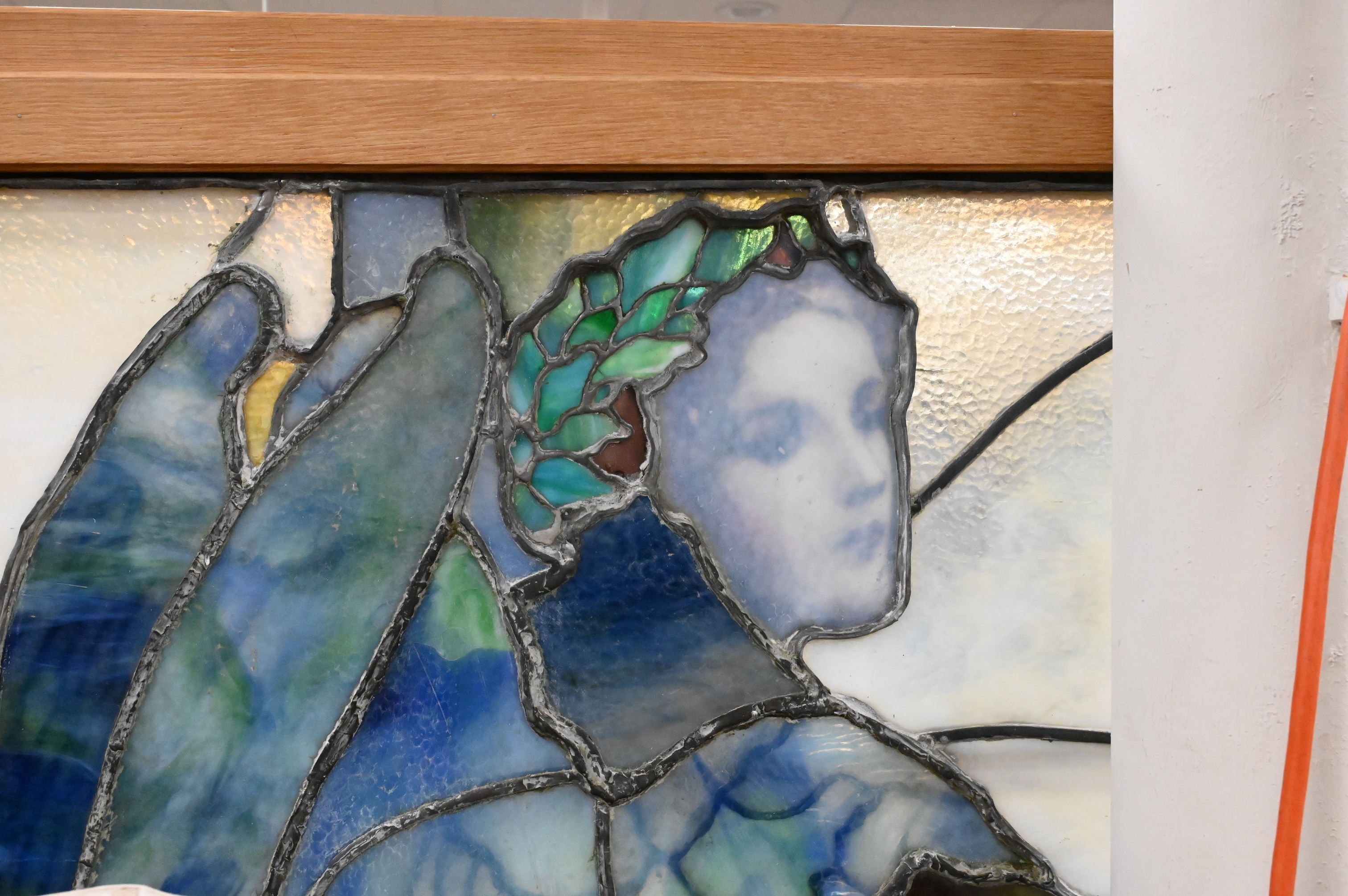 circa 1905, having colored leaded drapery and feather glass within replaced oak frame