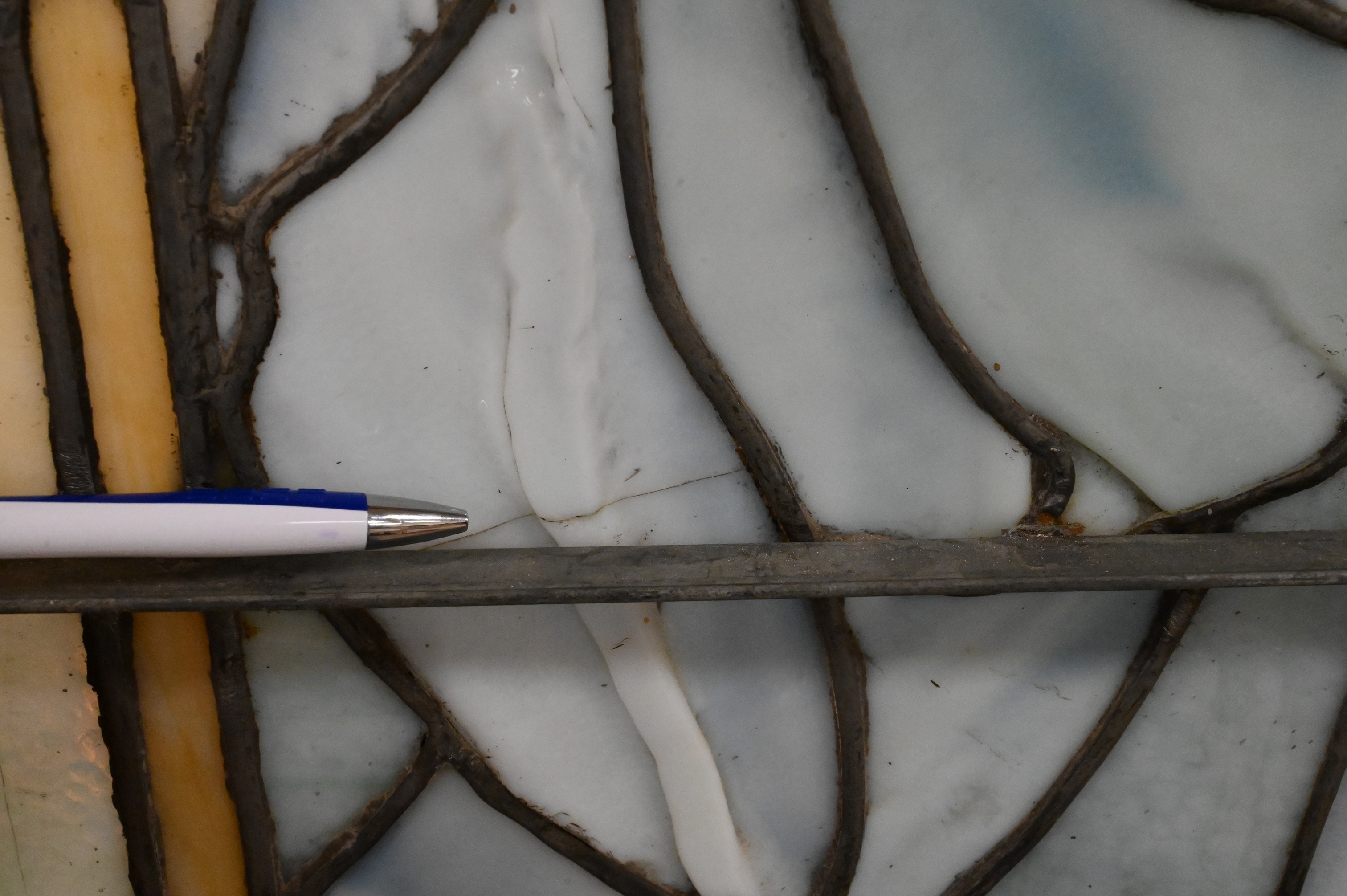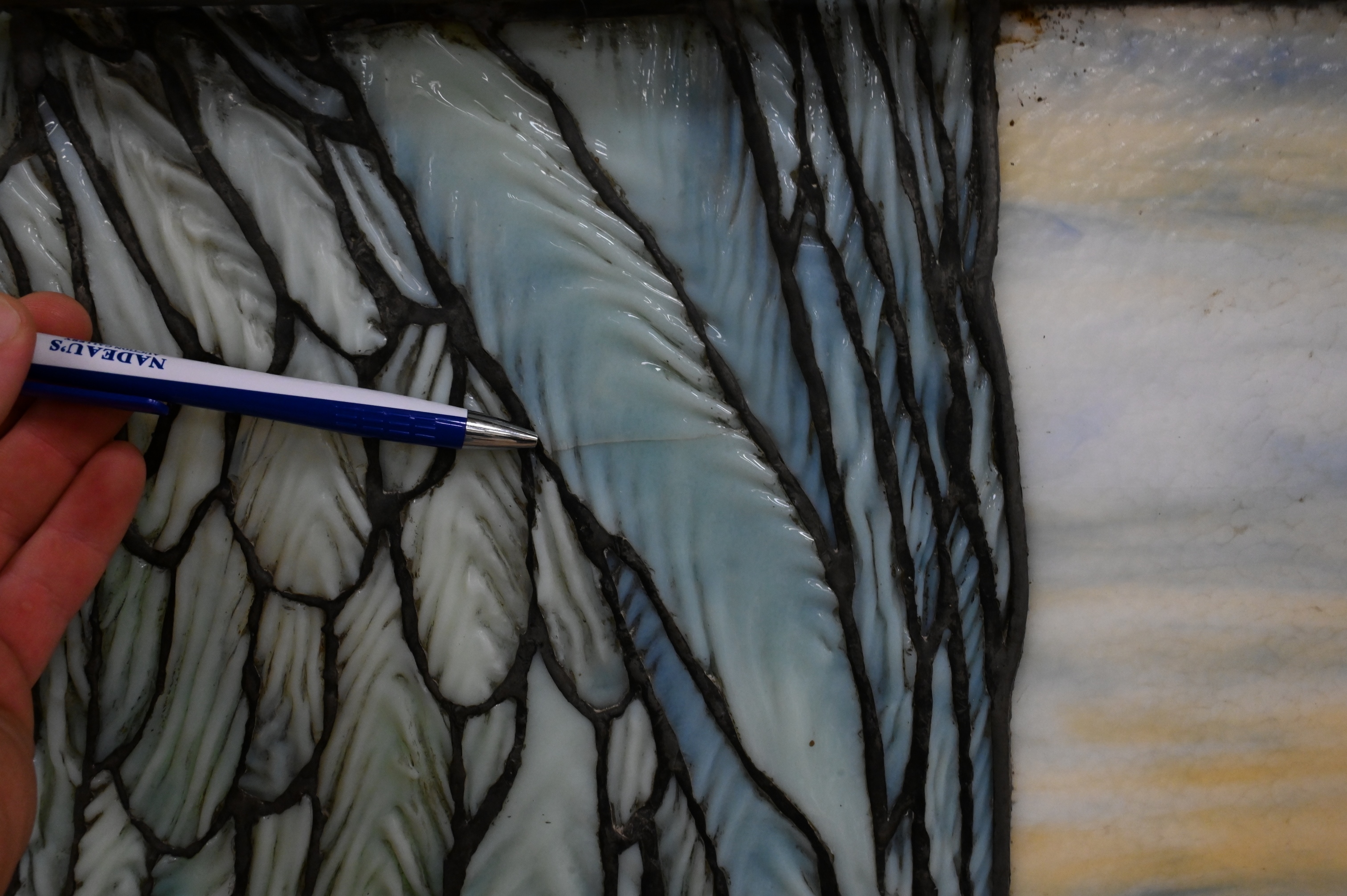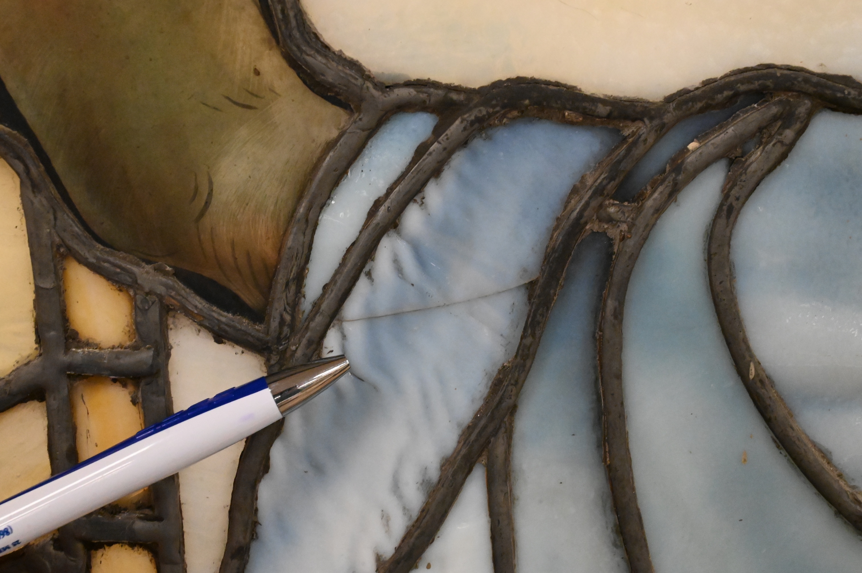 The figure was designed by Frederick Wilson head of the Tiffany Studio’s Ecclesiastical Department and the primary designer of figurative windows. The face is typical of his work, the angel is made up of great examples of drapery and feather glass in the gown and wings. Multiple layers provide subtle, shifting colors making the gown nacreous. The use of spring green as the main color of the wings is striking and unusual.